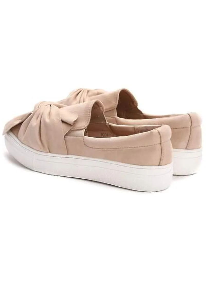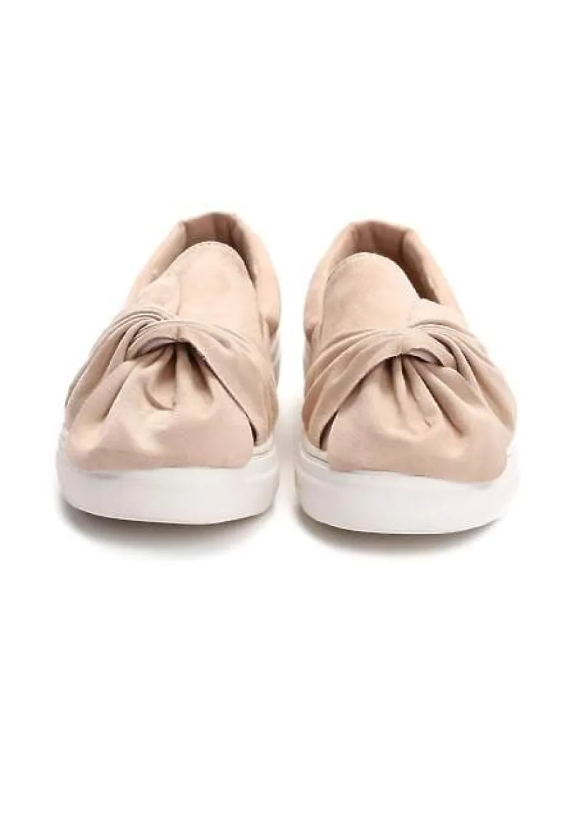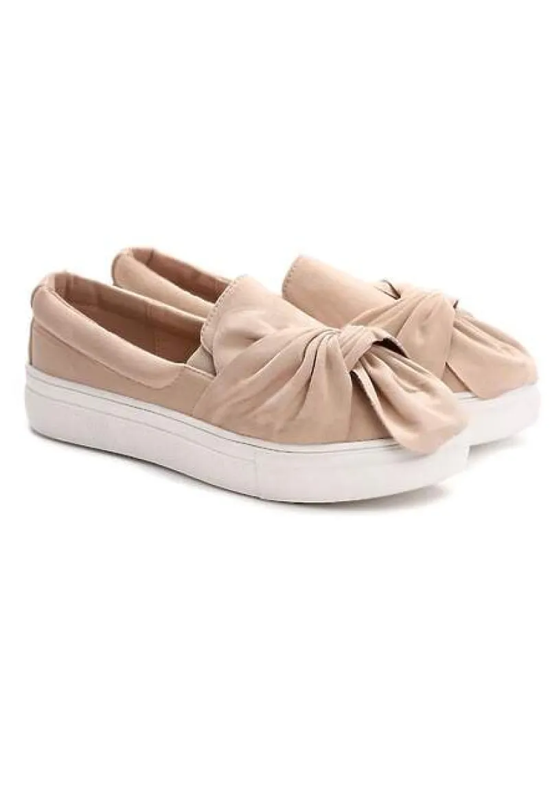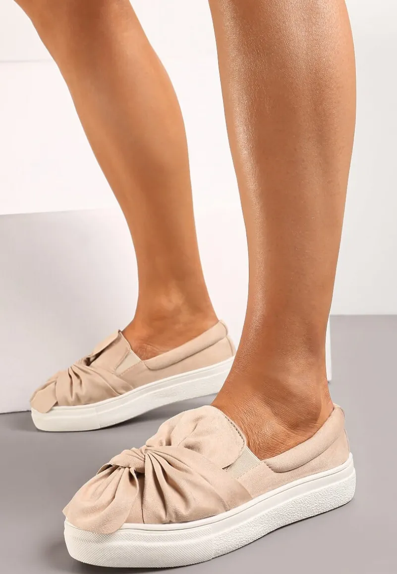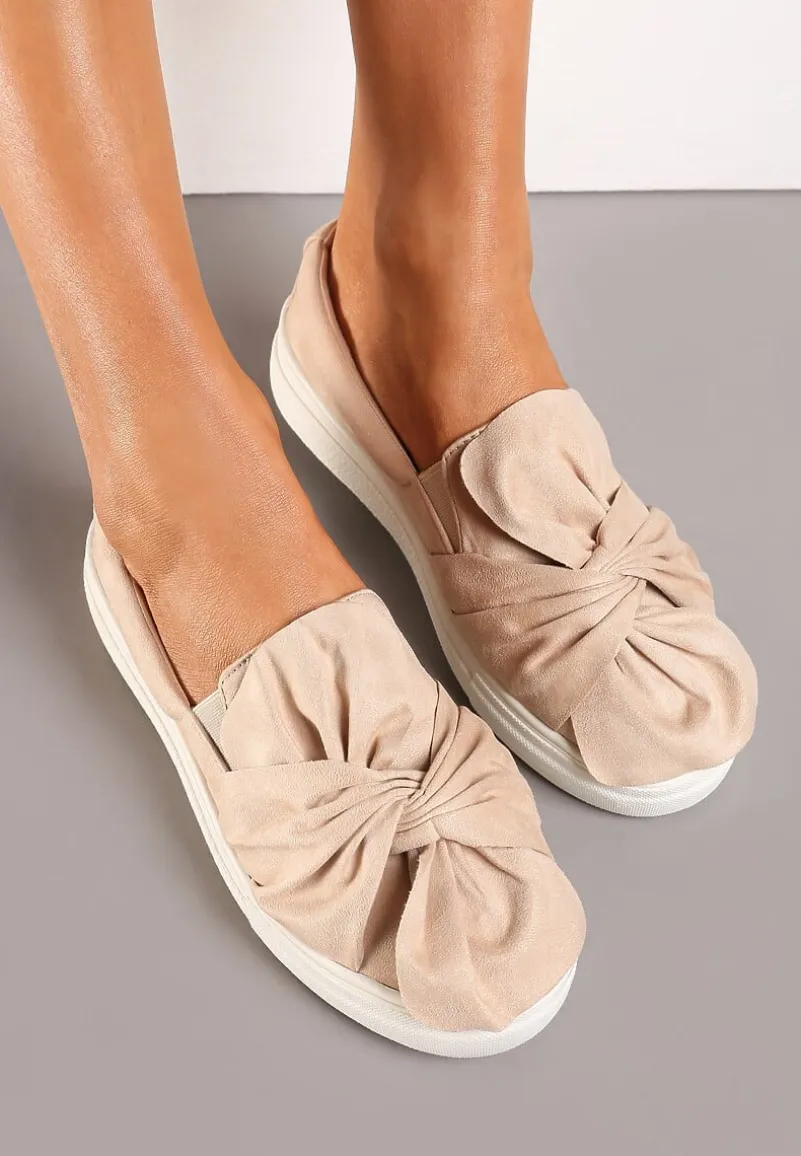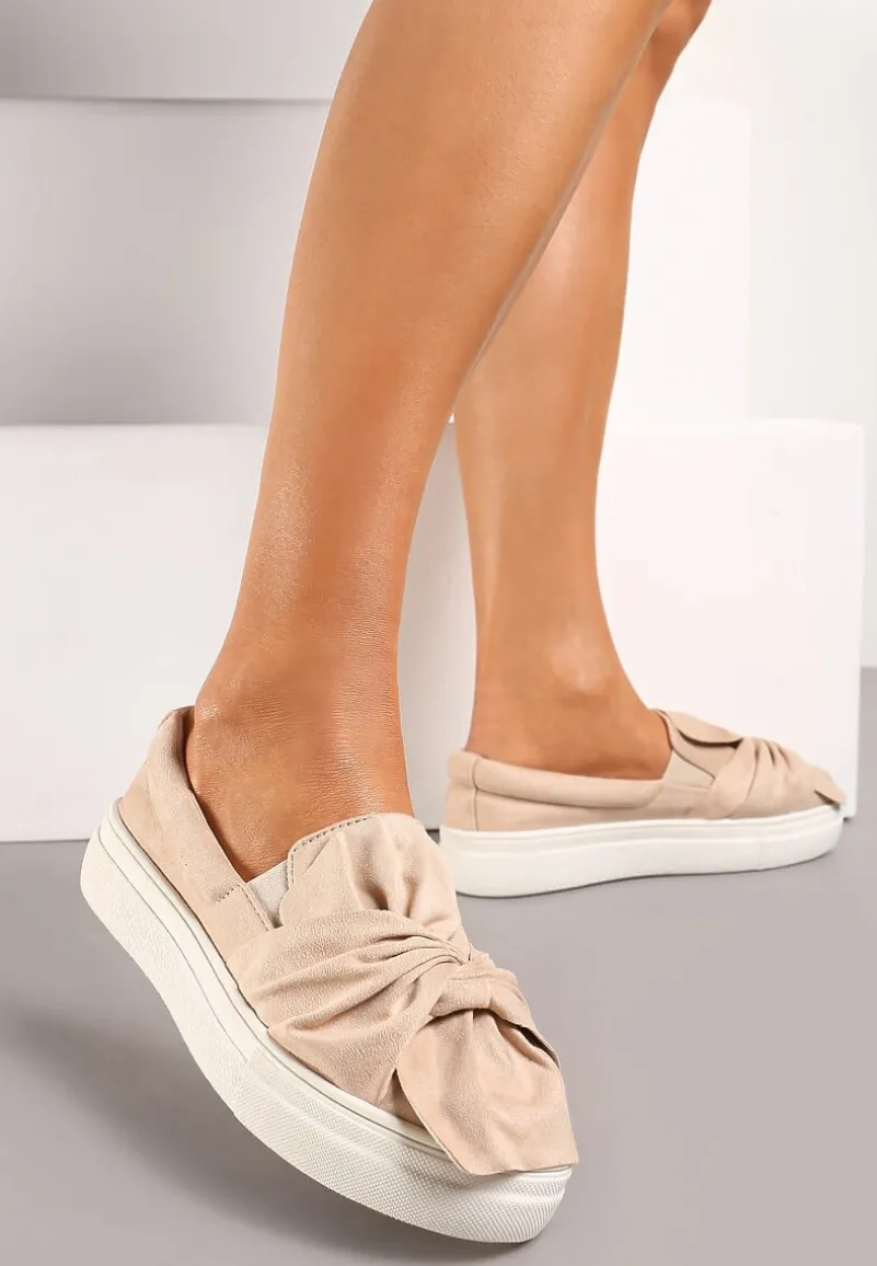 Slip On Houndstooth wsuwane, na platformie. Z przodu duża, wiązana kokarda w dopasowanym kolorze. Po bokach niewielkie gumki. Brzegi z tyłu wzmocnione. Wykonane z ekozamszu, wkładka ze skóry naturalnej.