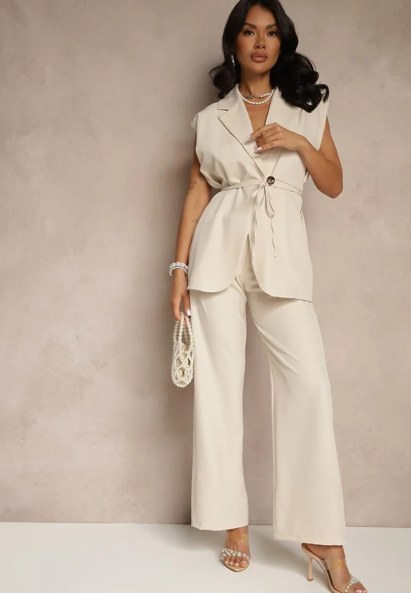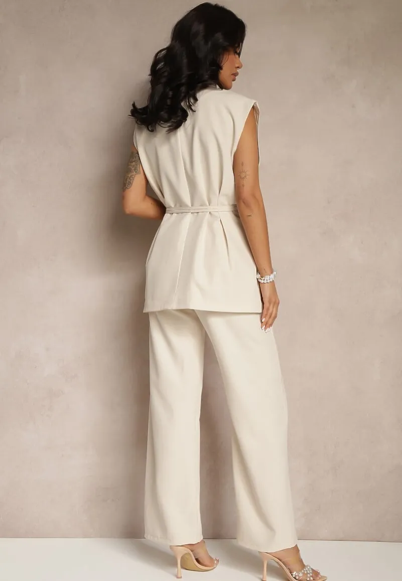 Stylowy garniturowy komplet Davielis z pewnością przyciągnie spojrzenia bez względu na okazję! Fason kamizelki z wiązaniem podkreśla talię, podczas gdy szerokie spodnie dodają swobodnego, a jednocześnie eleganckiego charakteru. To doskonały wybór zarówno do pracy, jak i na wieczorne wyjście. Połącz go z klasycznymi szpilkami i kopertówką, aby stworzyć wyjątkowy look na formalne okazje lub zestaw z białymi sneakersami i T-shirtem na co dzień — efekt wow gwarantowany! Kamizelka posiada zapięcie na guzik, spodnie wyróżniają się gumką w talii, wsuwanymi kieszeniami oraz zapięciem na suwak i guzik.