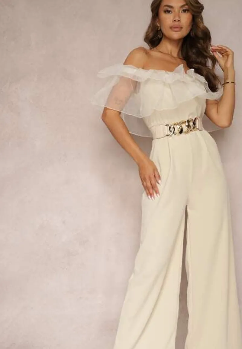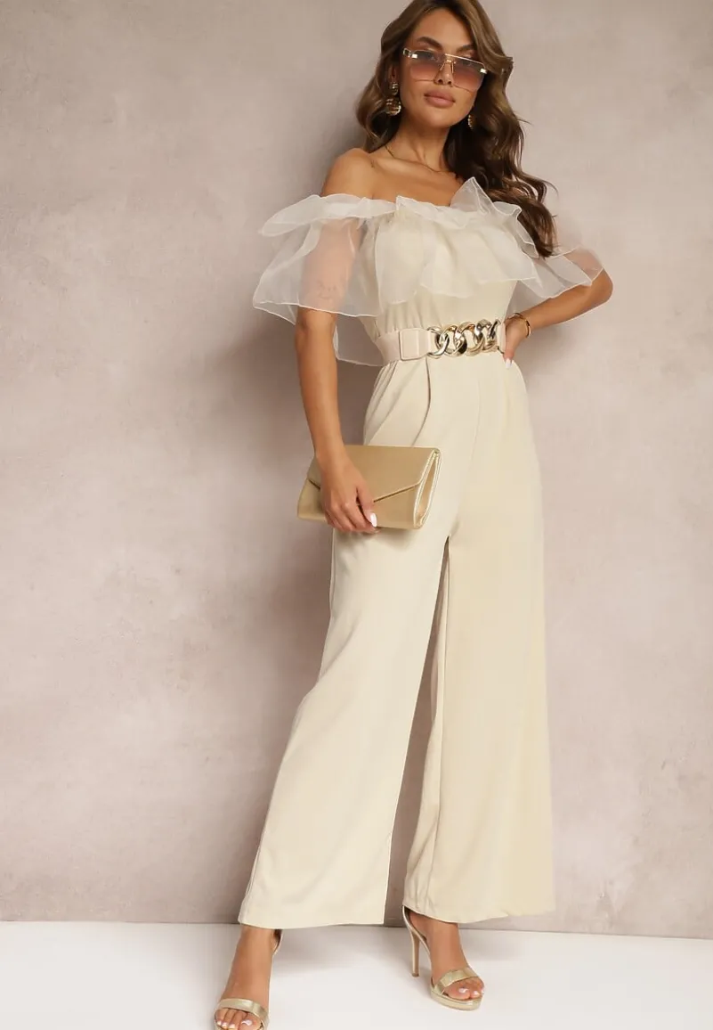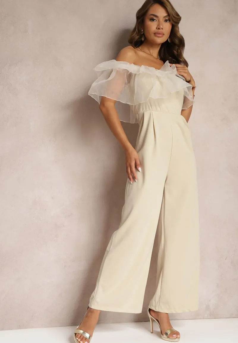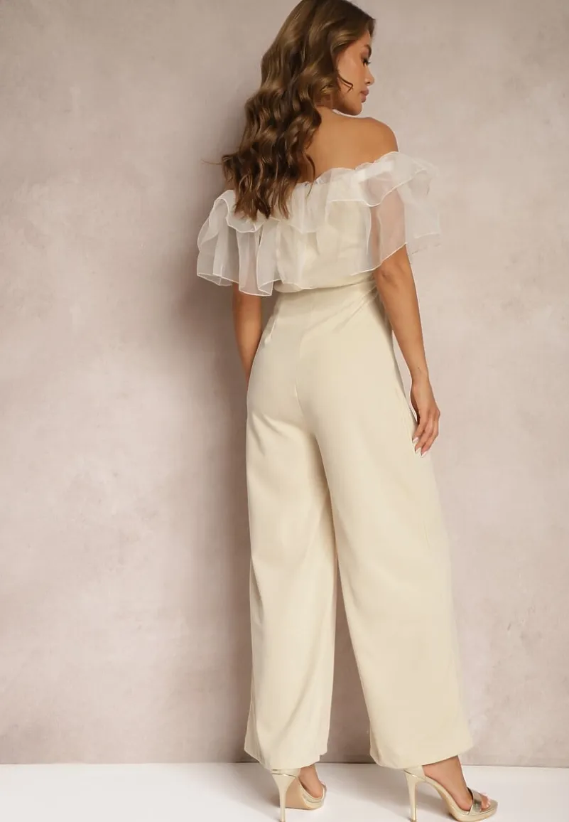 Beżowy Koktajlowy Kombinezon z Falbanką przy Dekolcie bez Rękawów Tessita