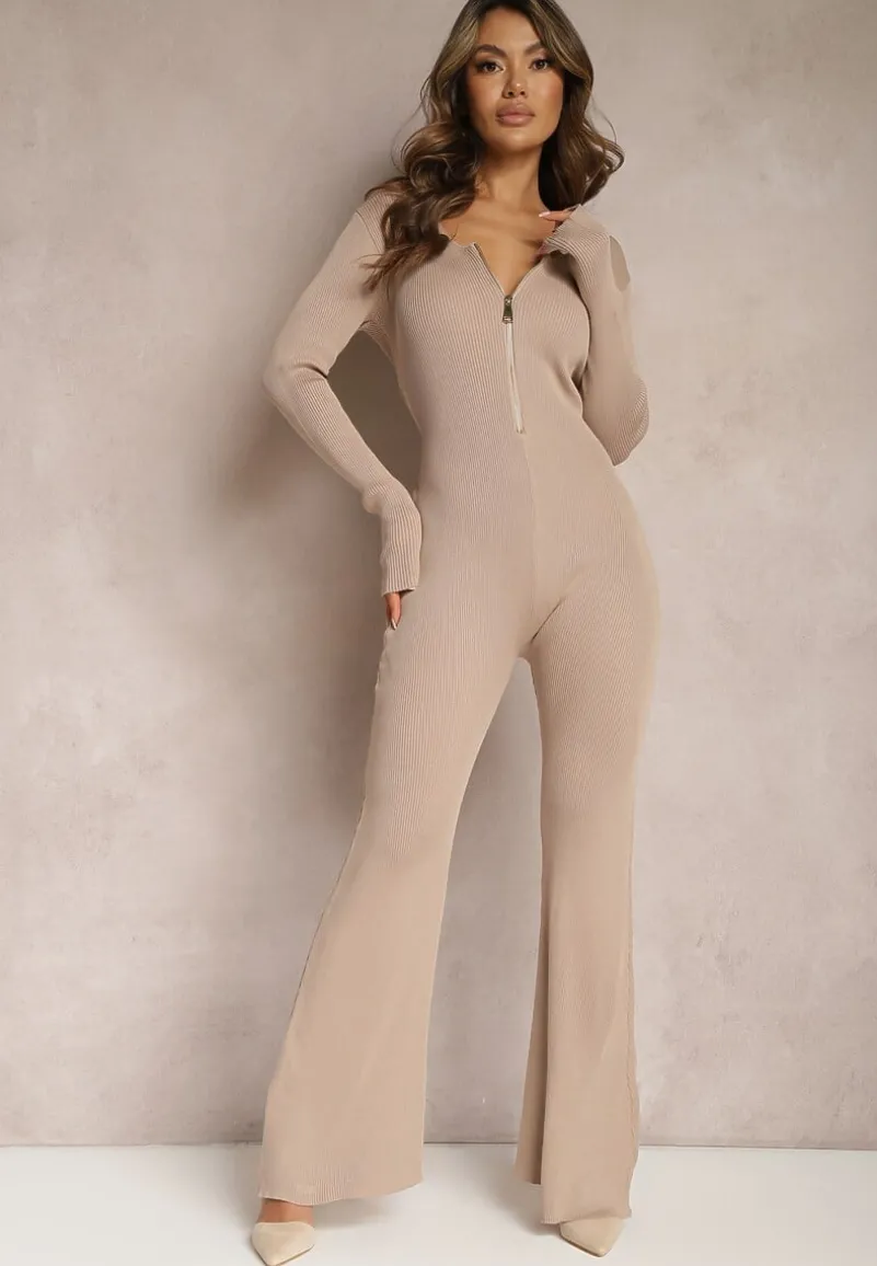 Beżowy Kombinezon Bodycon z Prążkowanej Wiskozy ze Spodniami Typu Dzwony i Suwakiem Lavirna