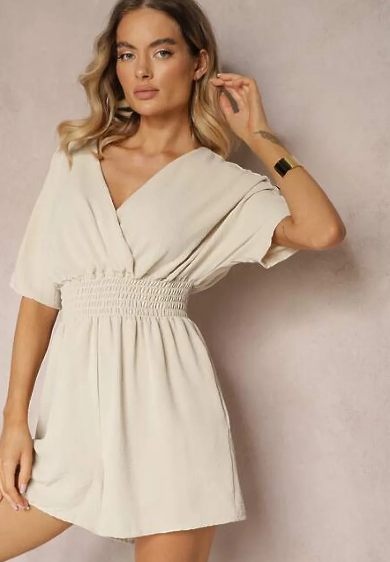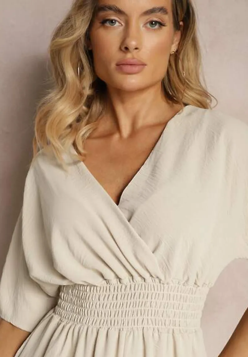 Beżowy Kombinezon Kopertowy z Gumką w Pasie Fandrea