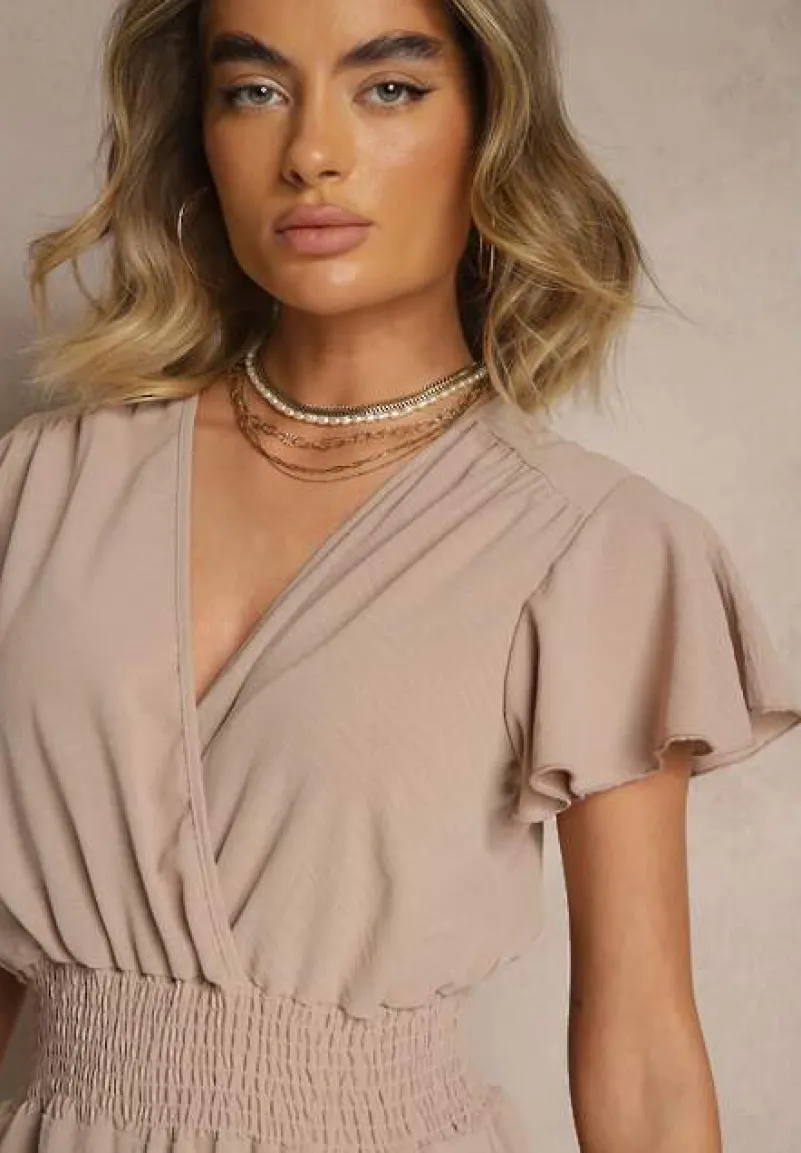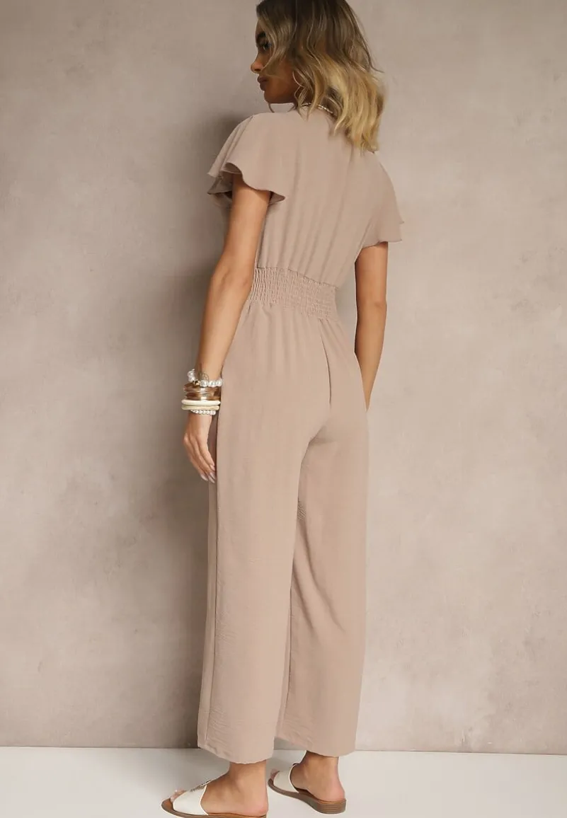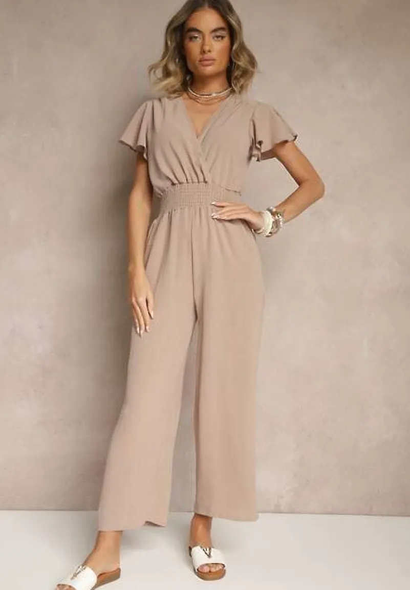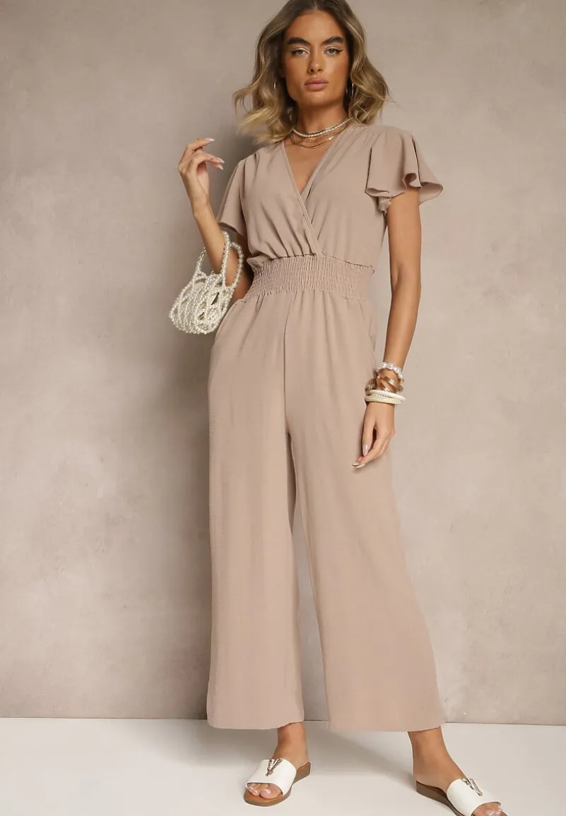 Beżowy Kombinezon o Kopertowym Kroju z Gumką w Talii Martalia