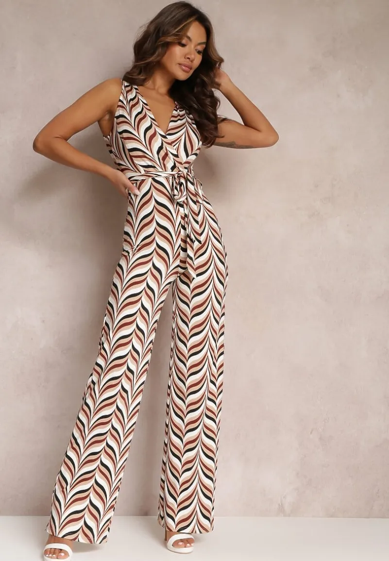 Kombinezon Phellaera to model, z którym stworzysz ciekawą stylizację w klimacie lat 70. Zdobiony kolorowym, geometrycznym wzorem, który przyciąga spojrzenia. Z kopertowym dekoltem, bez rękawów. Długa, luźna nogawka. W pasie cienki, materiałowy pasek, który możesz zawiązać na kokardkę. Polacz z sandałami na platformie i wysokim, słupkowym obcasie.