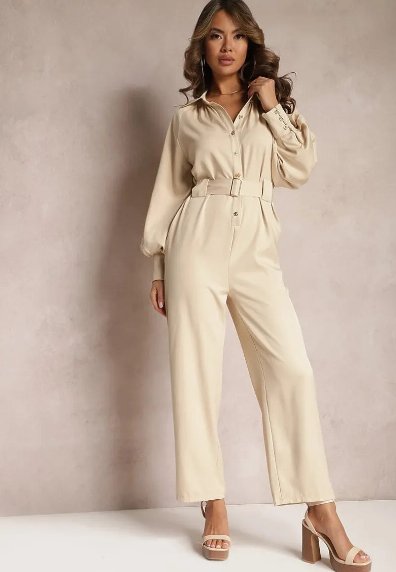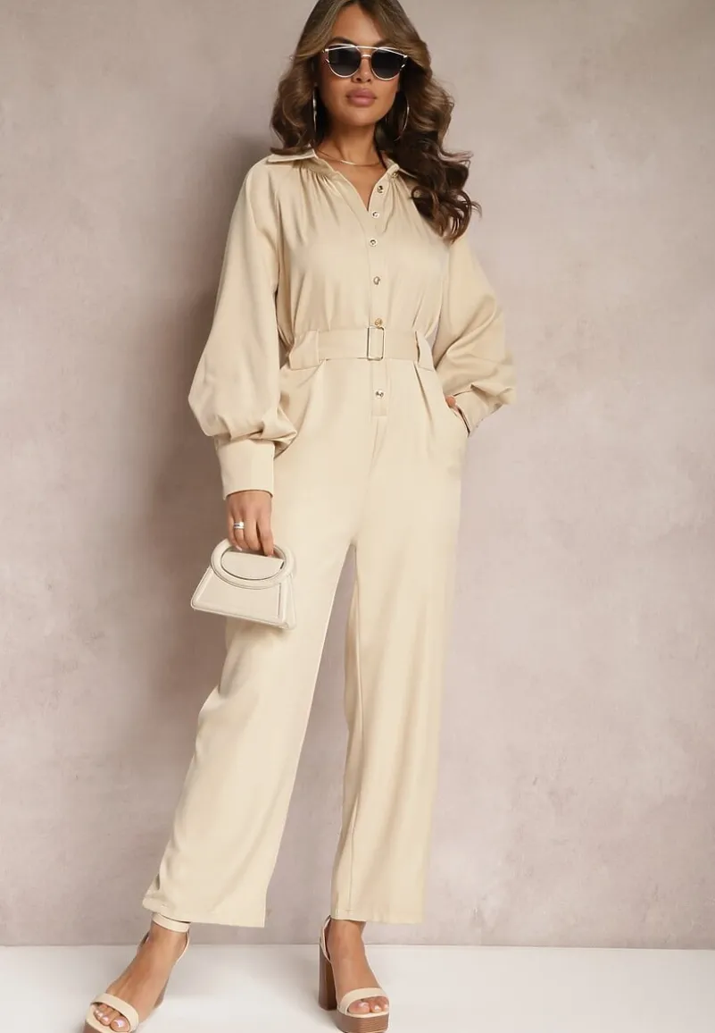 Beżowy Kombinezon z Bufiastymi Rękawami i Paskiem ze Sprzączką Falda