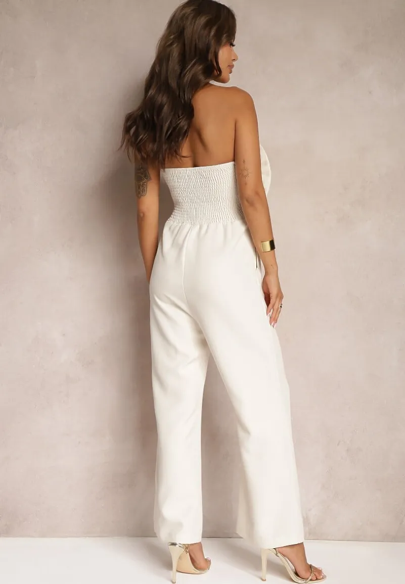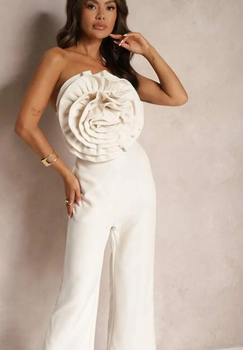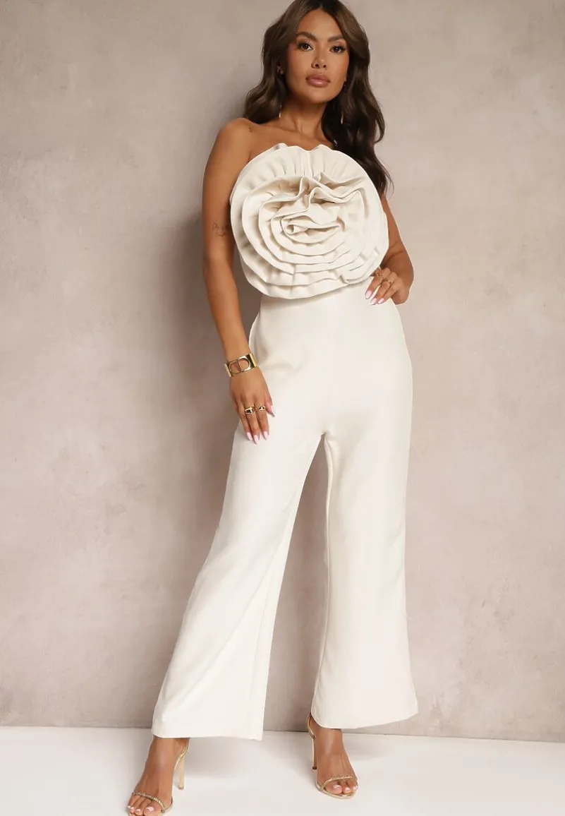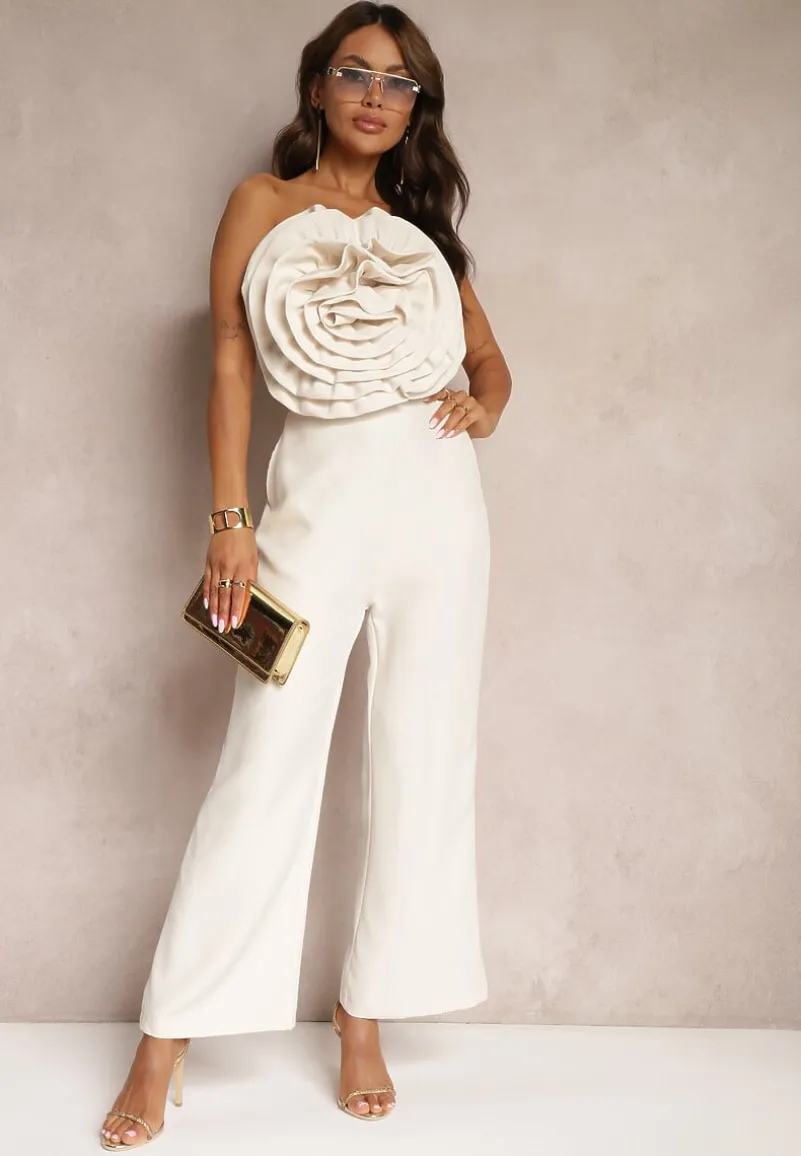 Beżowy Kombinezon z Dużym Naszytym Kwiatem bez Rękawów Usemia