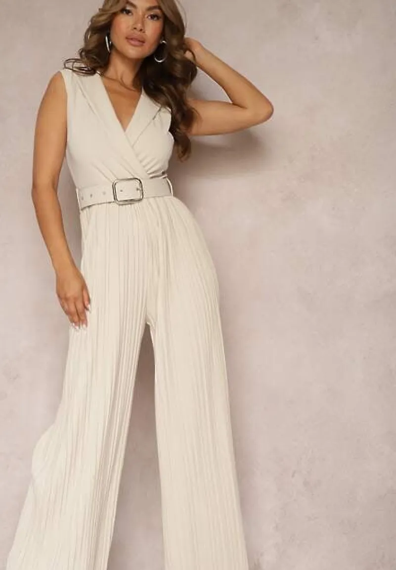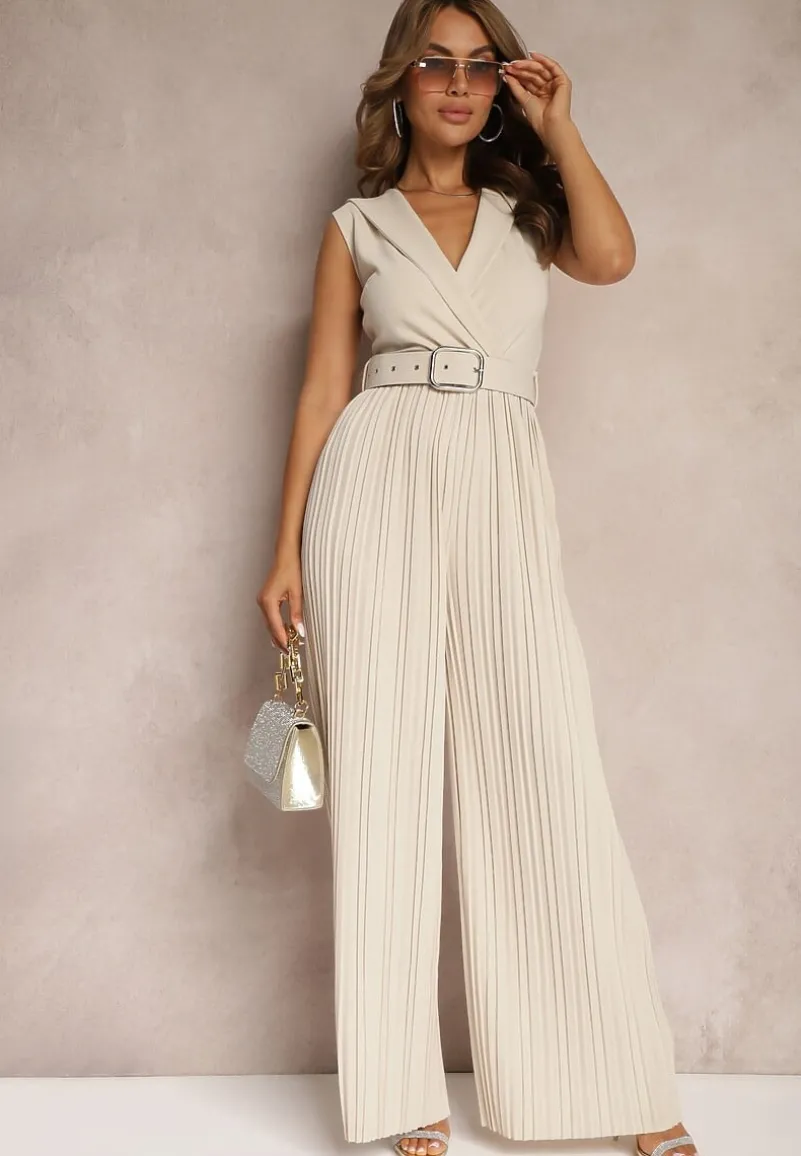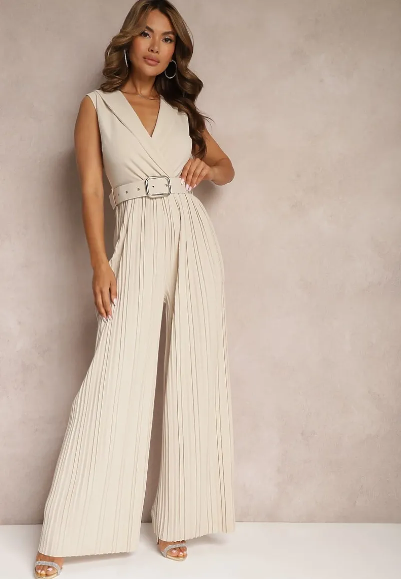 Beżowy Kombinezon z Trójkątnym Dekoltem i Szerokimi Plisowanymi Nogawkami z Paskiem Moncilla