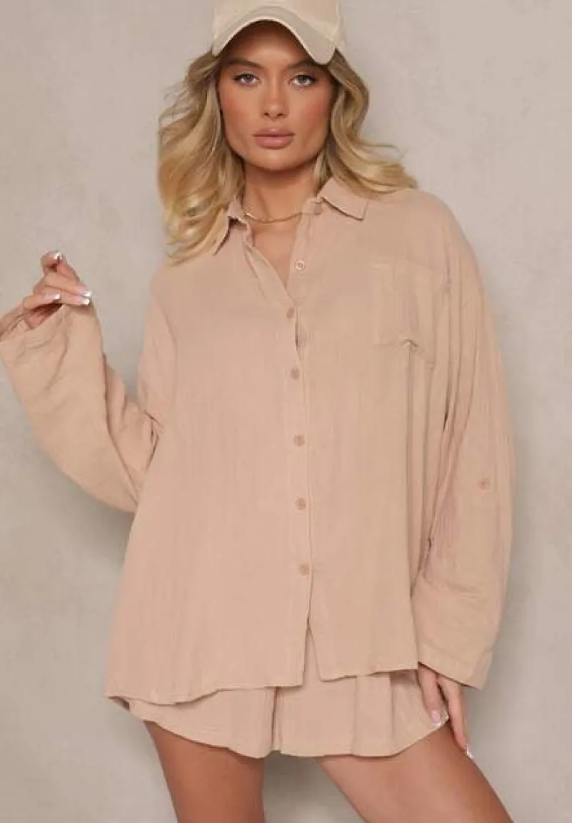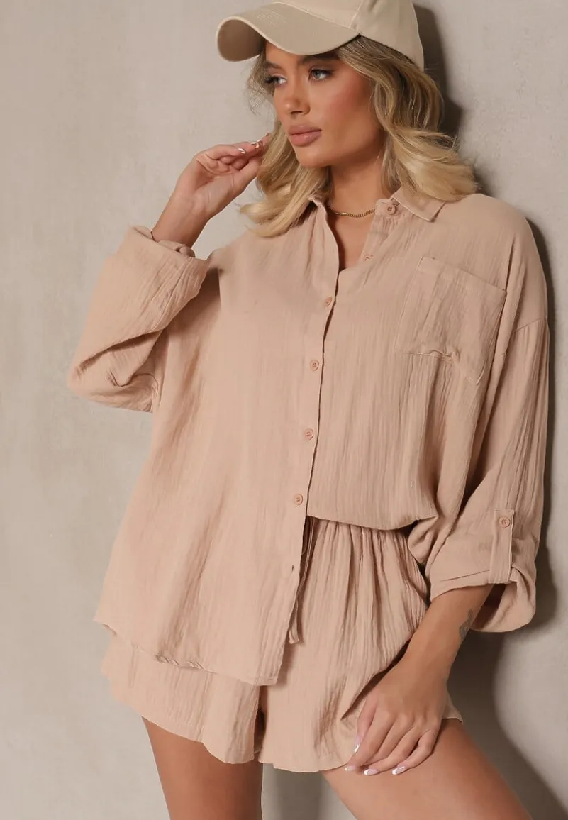 Komplet Eleamari z bawełny to idealne połączenie stylu – dzięki regulacji przy rękawach, łatwo dopasujesz go do swoich potrzeb. Doskonale sprawdzi się w sezonie wiosenno-letnim. Szorty z gumką w pasie oraz wsuwanymi kieszeniami i koszula tworzą zgrany duet na codzienne spacery po mieście.
