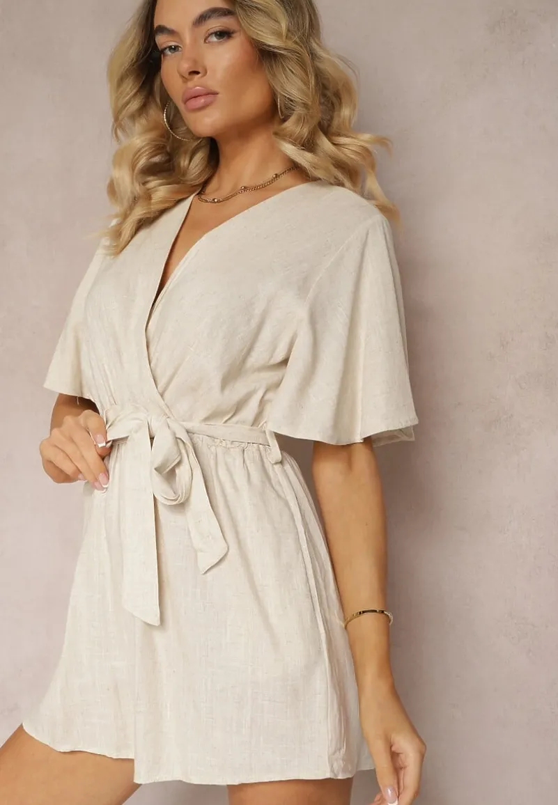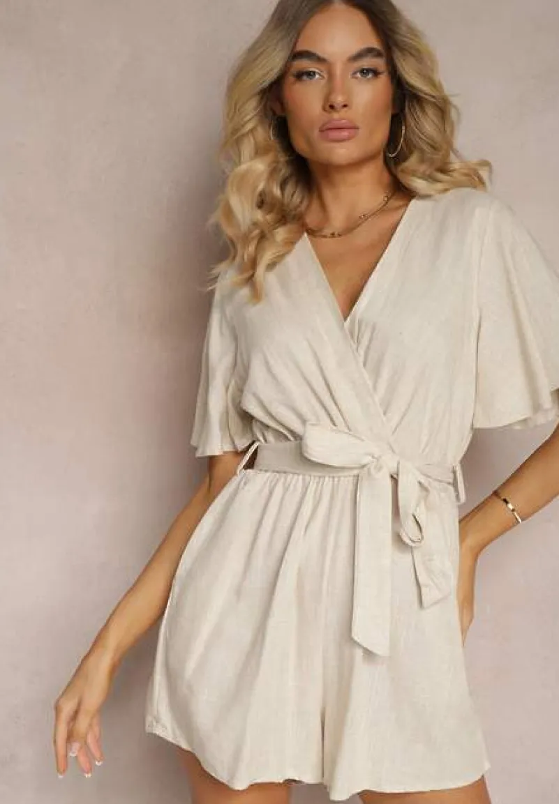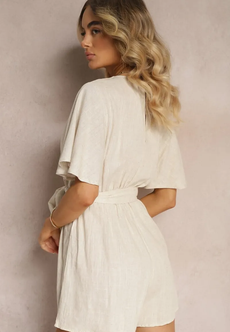 Beżowy Kopertowy Kombinezon z Bawełny Wiązany w Talii Materiałowym Paskiem Vikly