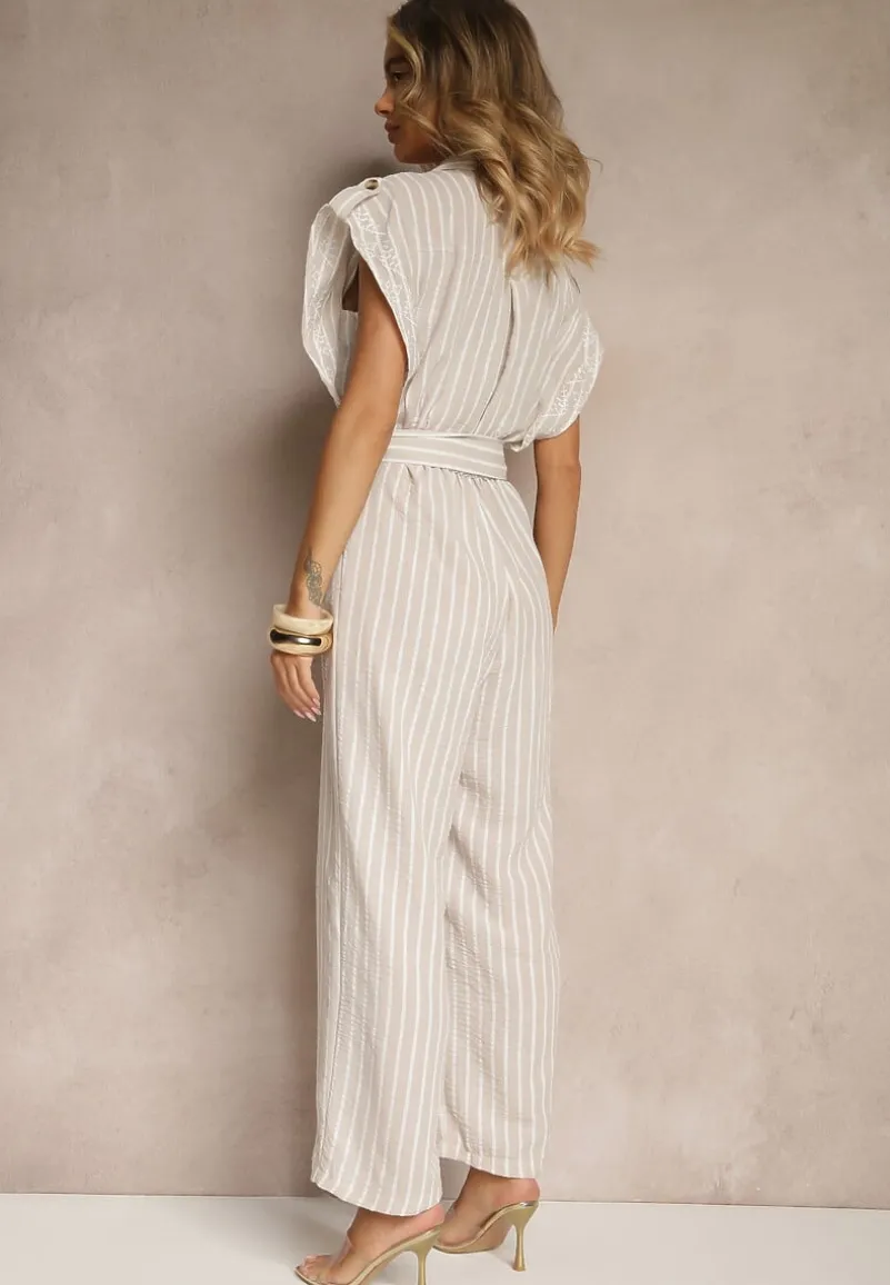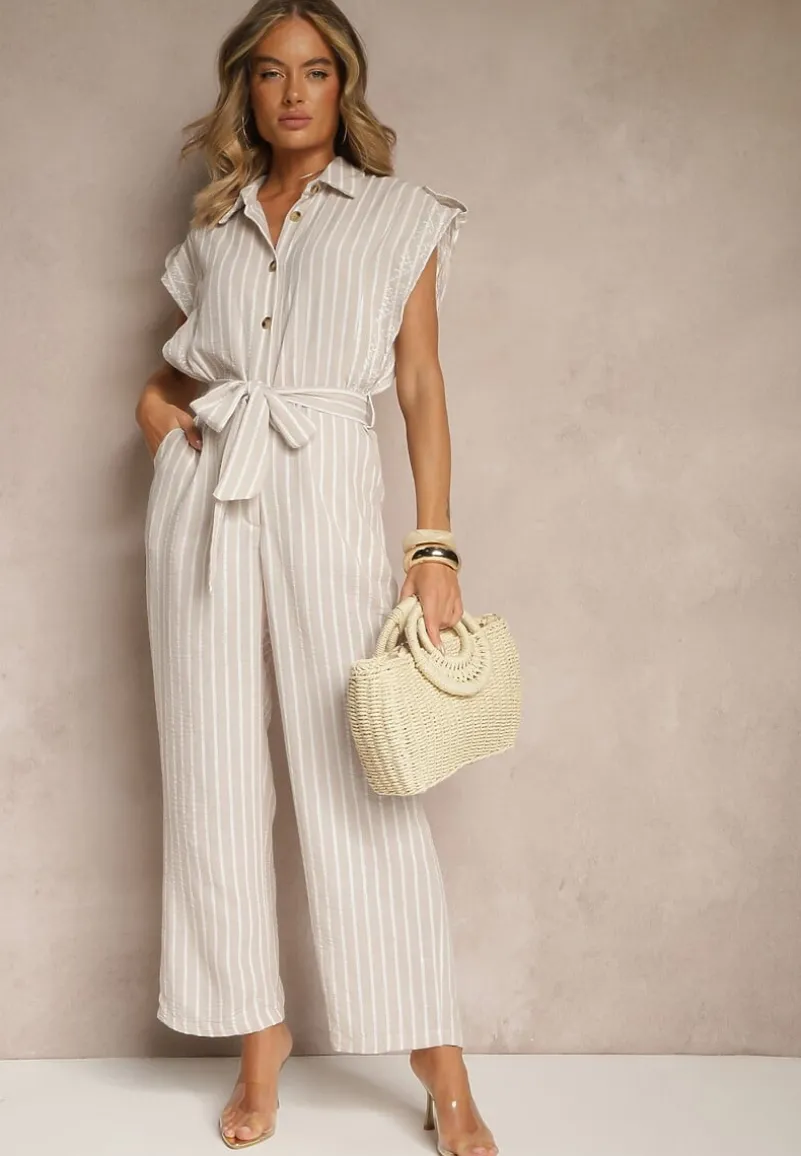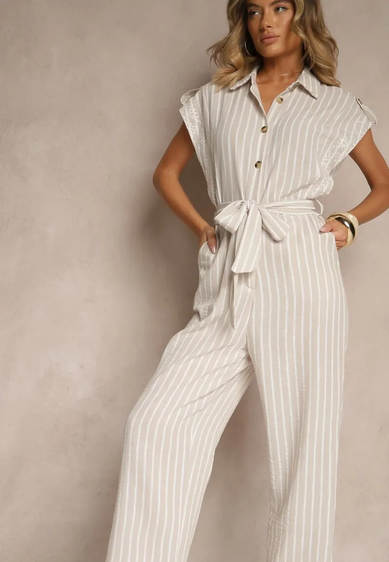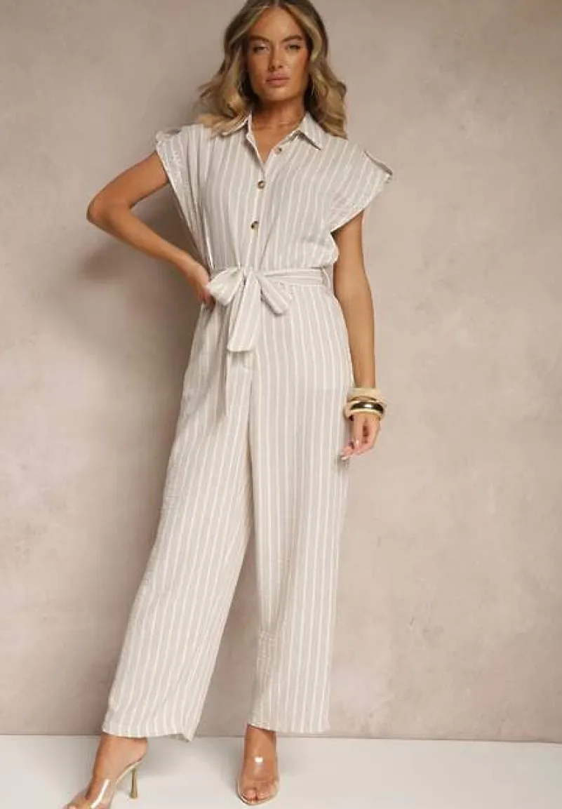 Beżowy Koszulowy Kombinezon z Bawełny z Wiązanym Paskiem Amevilia