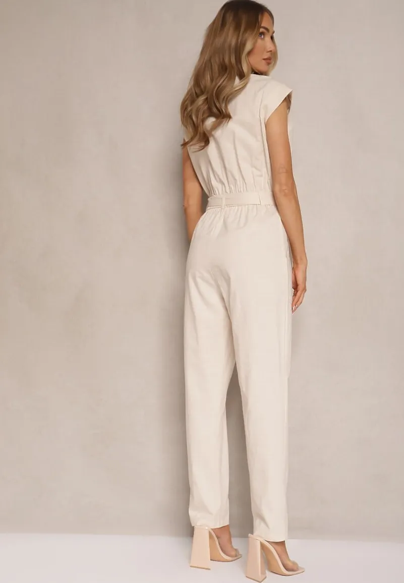 Beżowy Koszulowy Kombinezon z Wiskozą Zdobiony Napami i Wiązanym Paskiem Sepirise