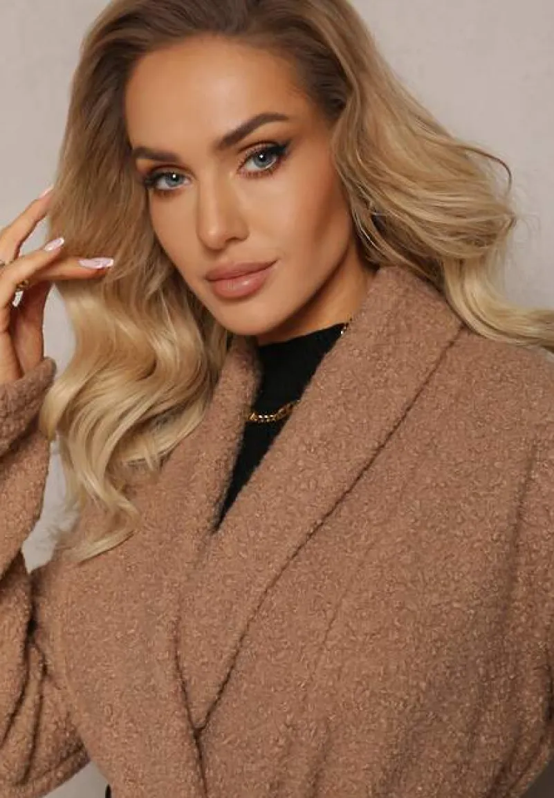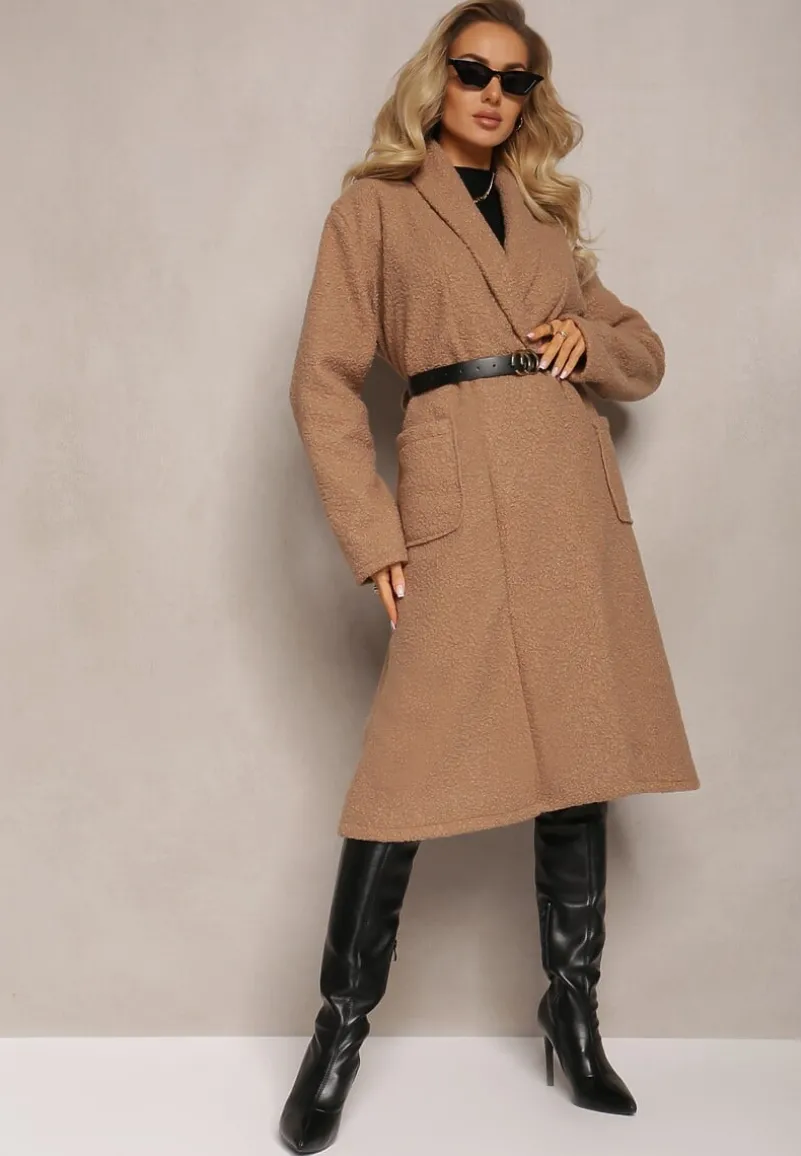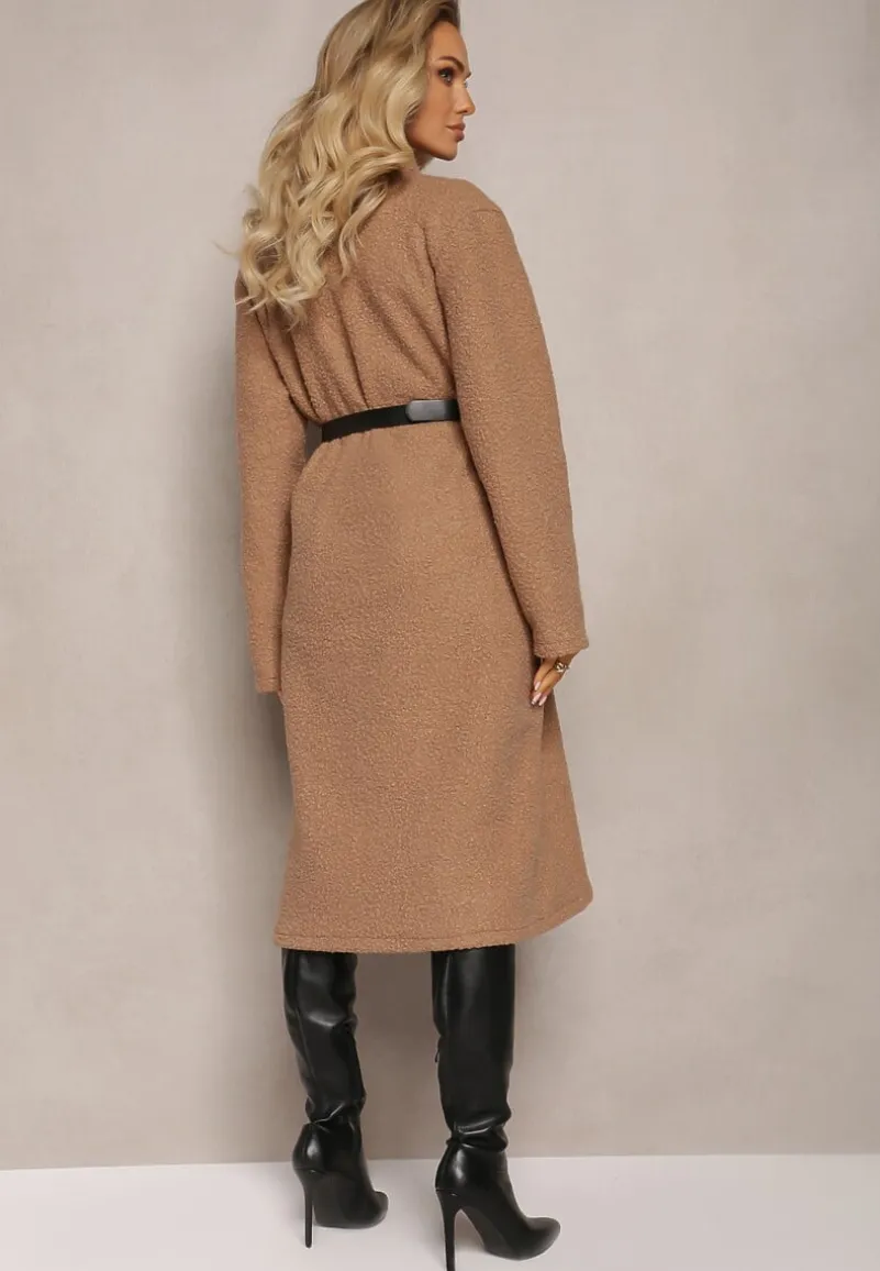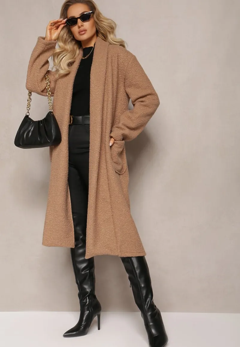Płaszcz Acompana sięgający za kolano, o luźnym i niezapinanym kroju. Na wysokości pasa naszyte kieszenie. W pasie pasek z ekoskóry.
