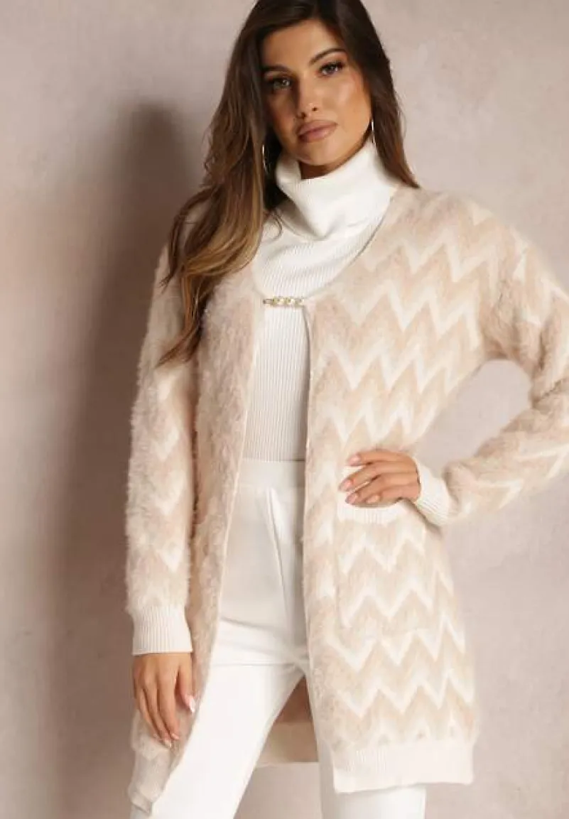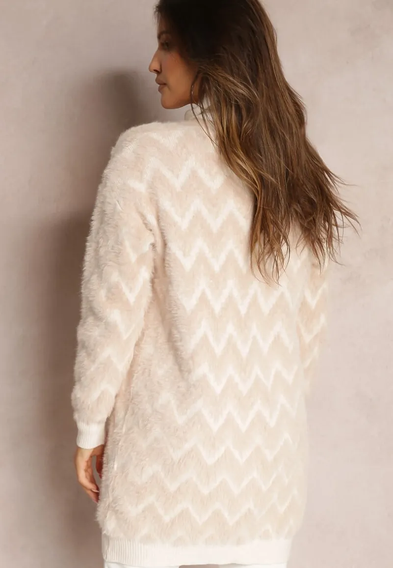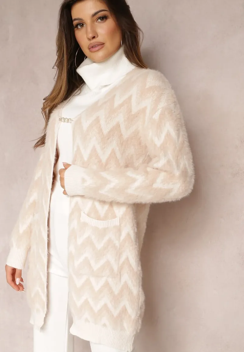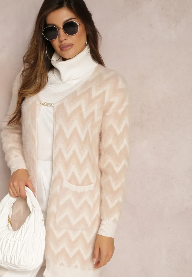 Niezapinany kardigan Oherna o fasonie przed kolano. Na wysokości bioder wsuwane kieszenie. Wykonany z przyjemnej w dotyku tkaniny o dłuższym włosiu w paski typu chevron. Dół i rękawy swetra zakończone ściągaczem.