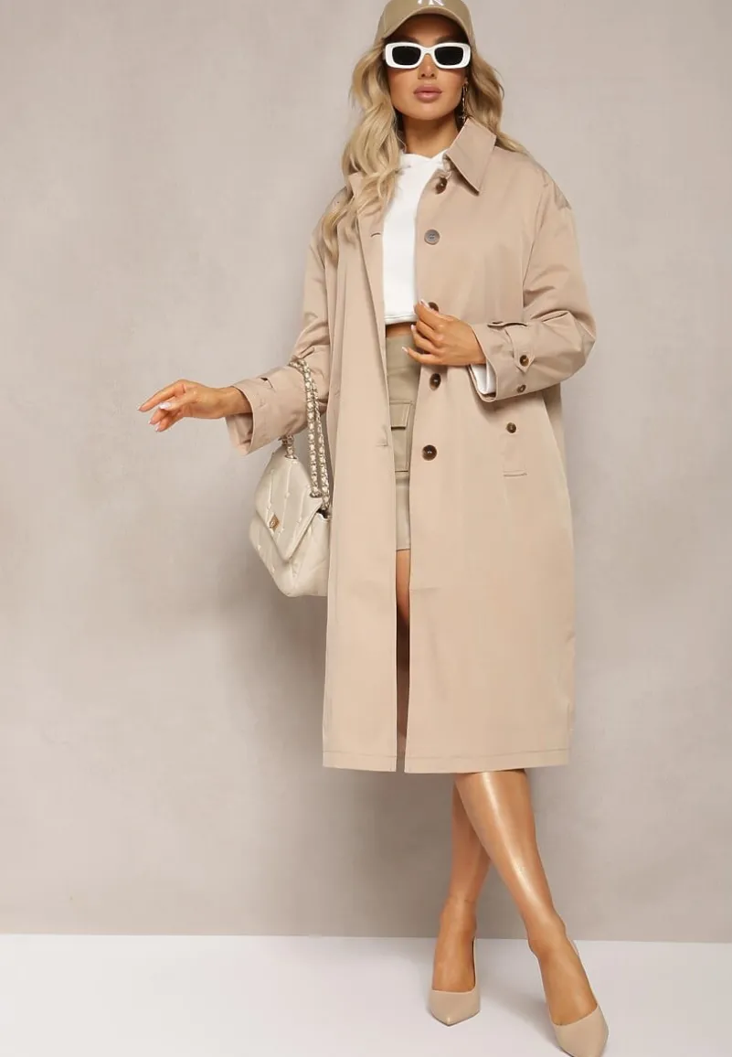 Płaszcz Flilia to modny, oversizowy trencz zapinany na rząd guzików. Przy dekolcie kołnierzyk, na dole po bokach wsuwane kieszonki, na dole rękawów krótkie patki. Na plecach klapa, a niżej krótkie rozcięcie.