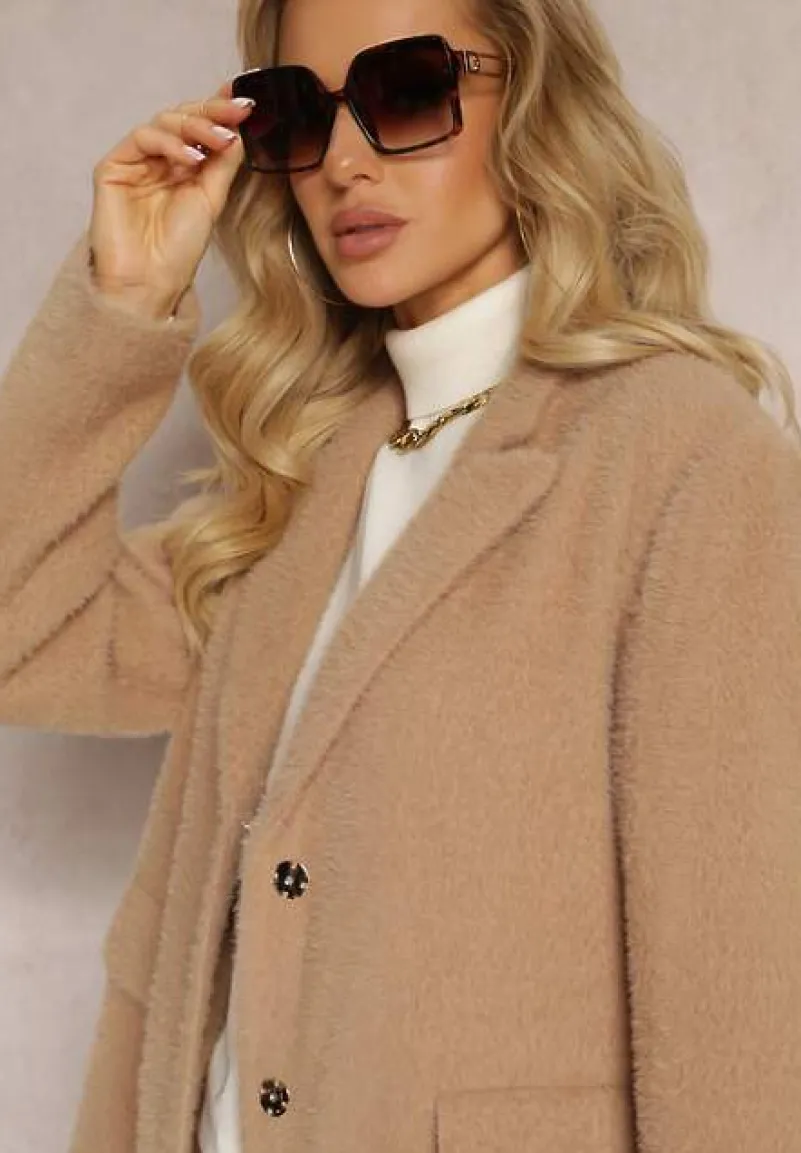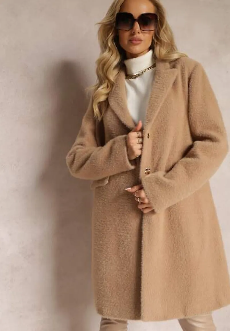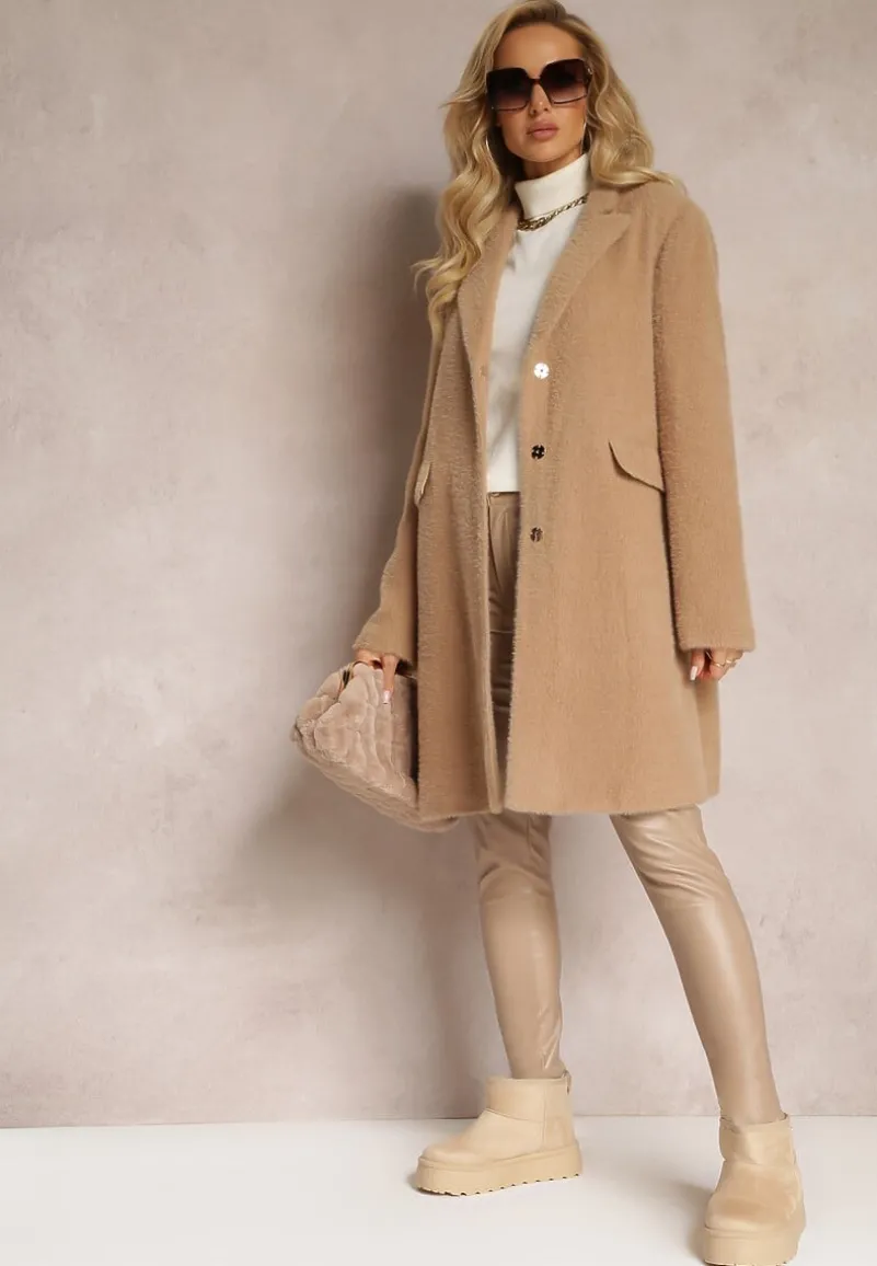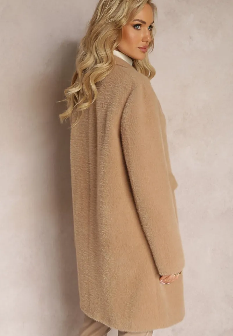 Płaszcz Erisse sięgający przed kolano, zapinany z przodu na napy. Wykonany z puchatej dzianiny. Posiada podszewkę. Na wysokości pasa kieszenie z klapami.