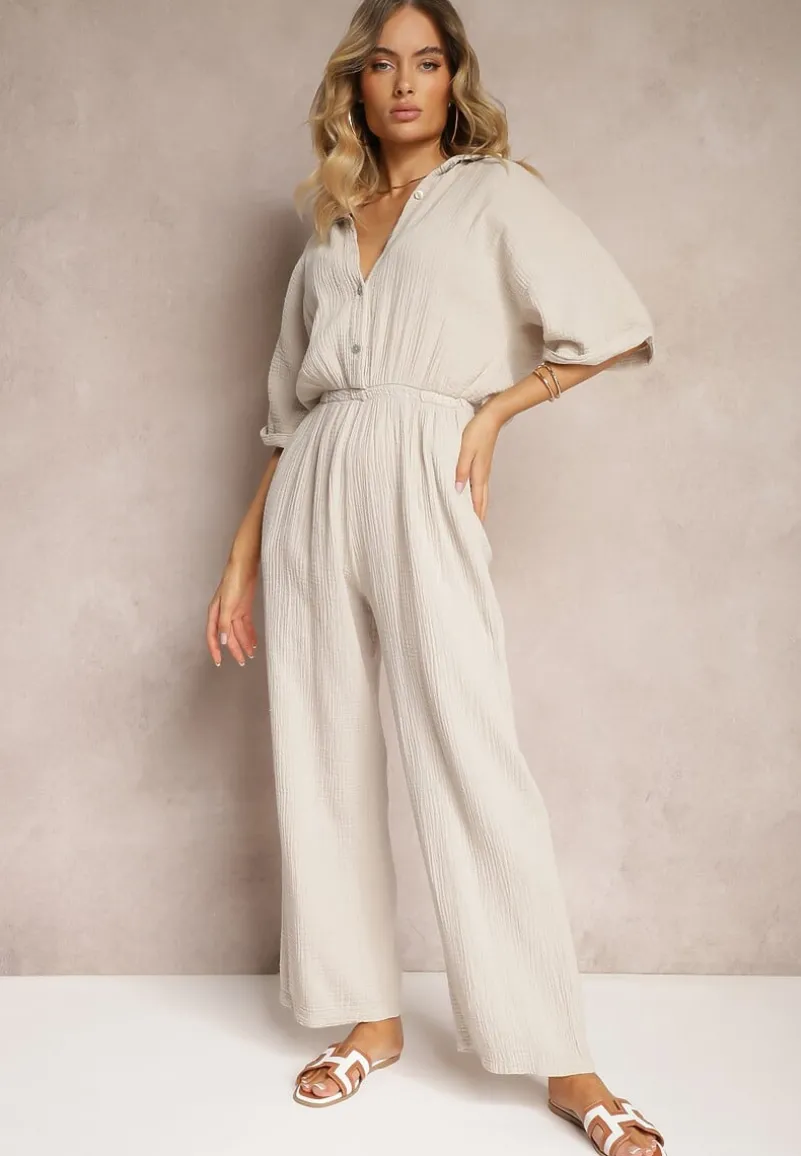 Beżowy Taliowany Kombinezon z Bawełny Góra w Formie Koszuli oraz Luźne Spodnie Namsorin