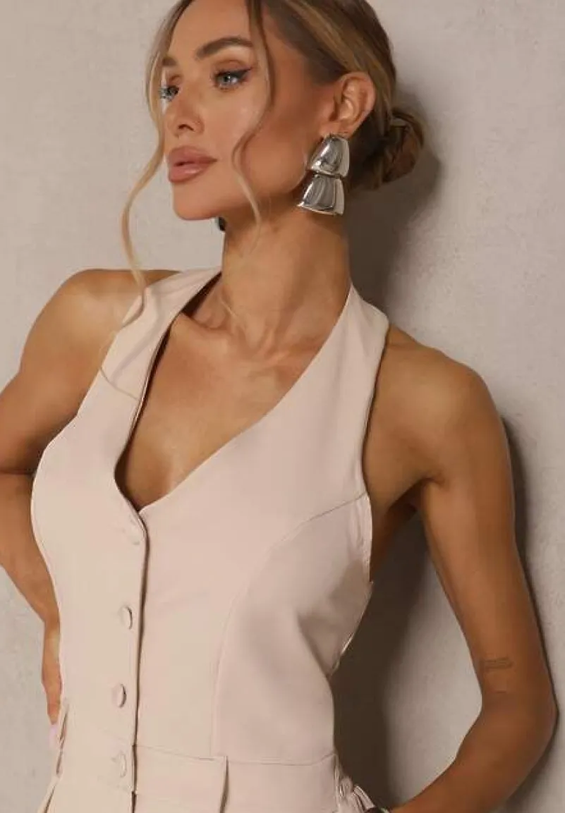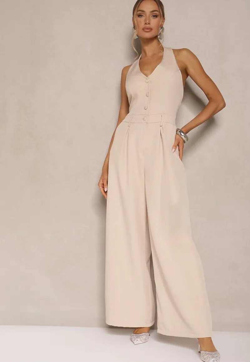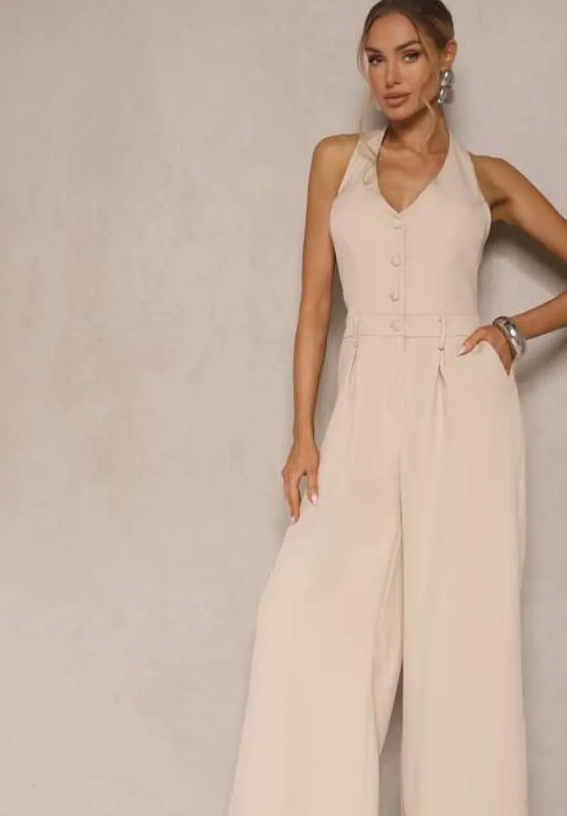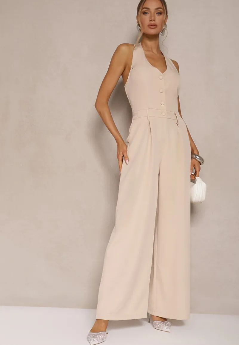 Beżowy Taliowany Kombinezon z Guzikami Nilaviella