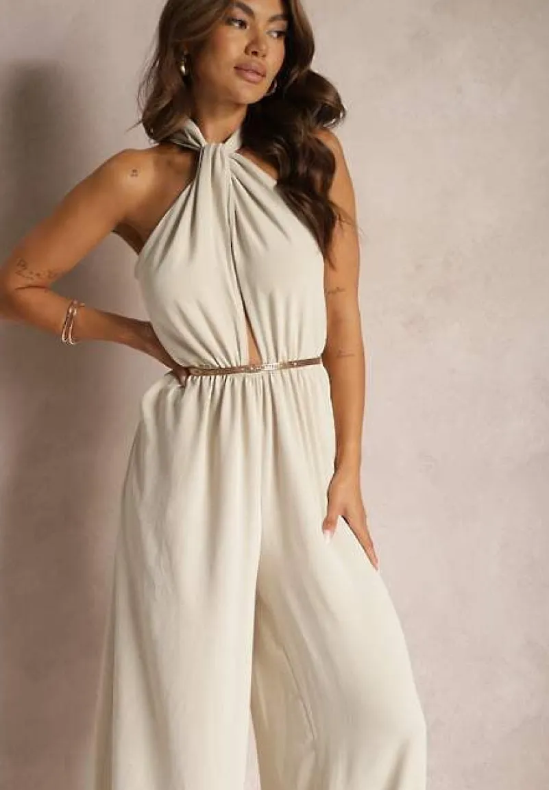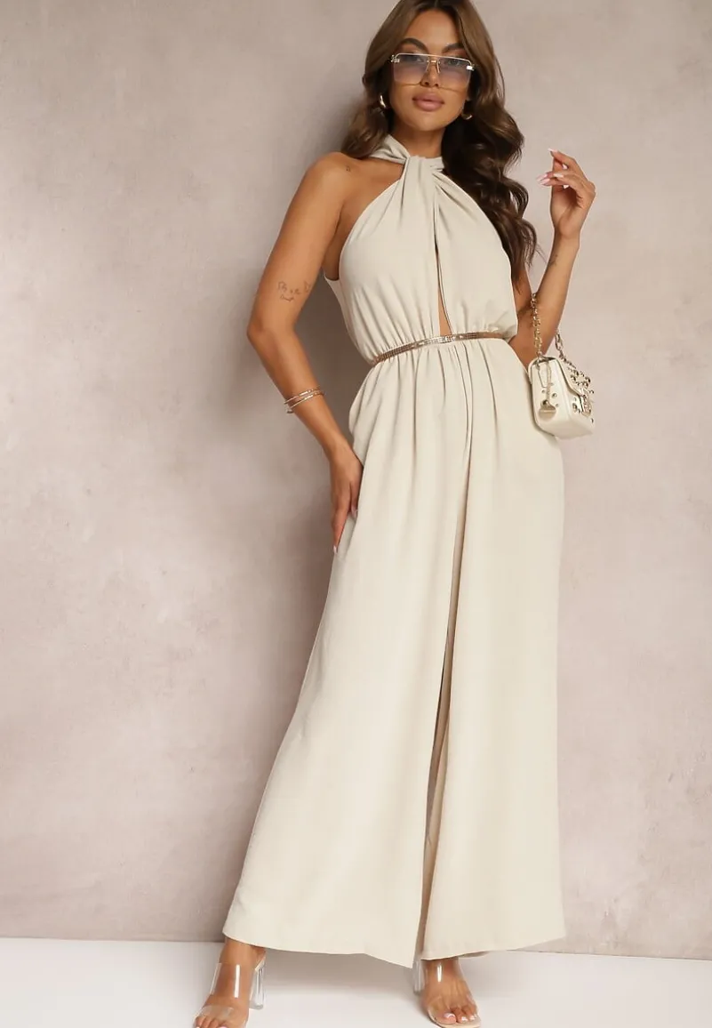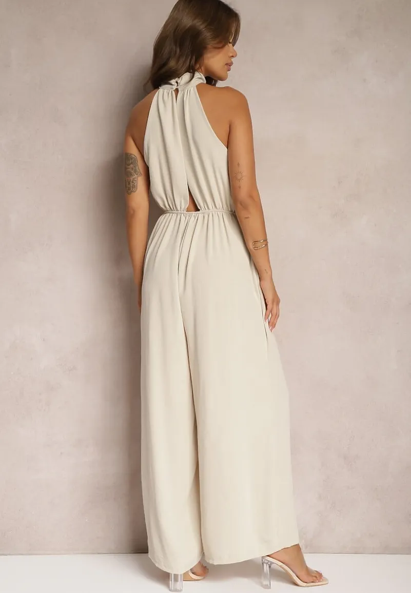 Beżowy Taliowany Kombinezon ze Ściągaczem w Talii i Wiązaniem przy Szyi Rivasiris