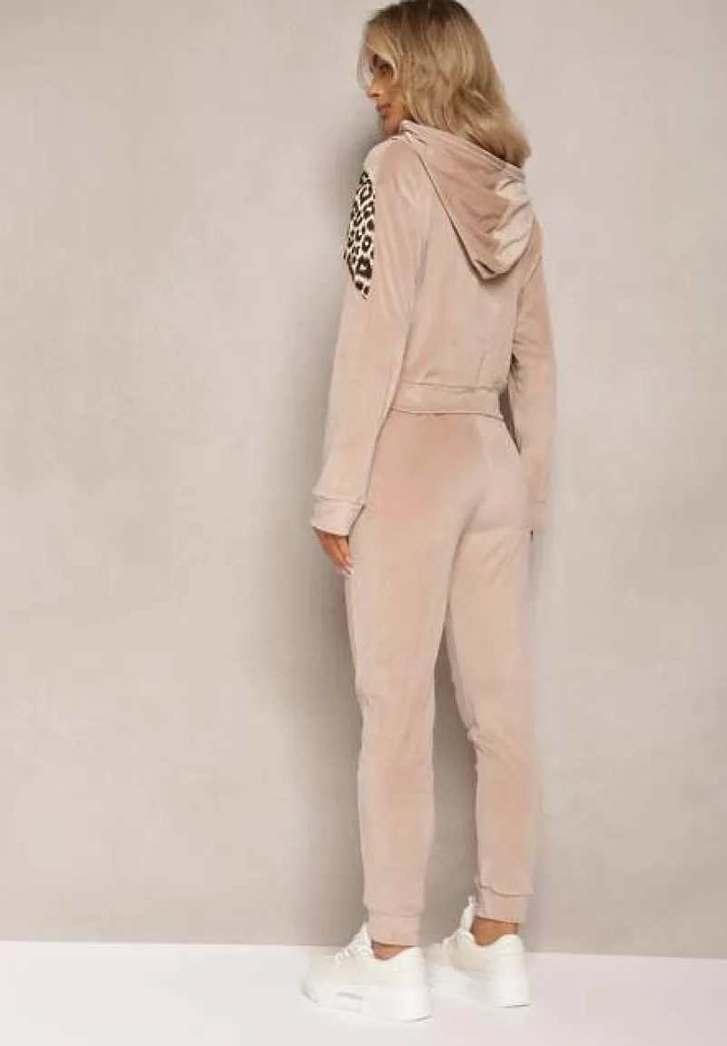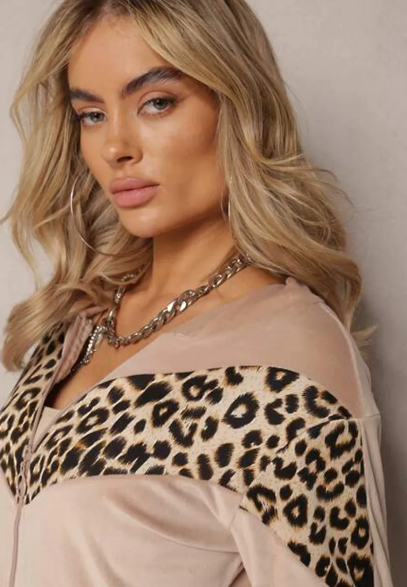 Komplet Dresowy Anilwo ozdobiony lampasami w cętki, wykonany z miękkiego weluru – idealny outfit na co dzień! Posiada wsuwane kieszenie w bluzie i w spodniach. Bluza z kapturem, zapinana na suwak, spodnie z gumką w pasie.