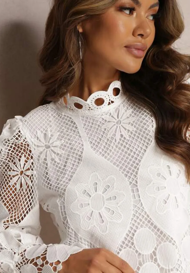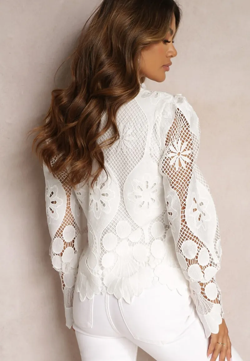 Bluzka z ażurowej koronki z bufiastymi rękawami i elegancką stójką. Zapięcie na guzik przy karku, pod spodem podszewka.