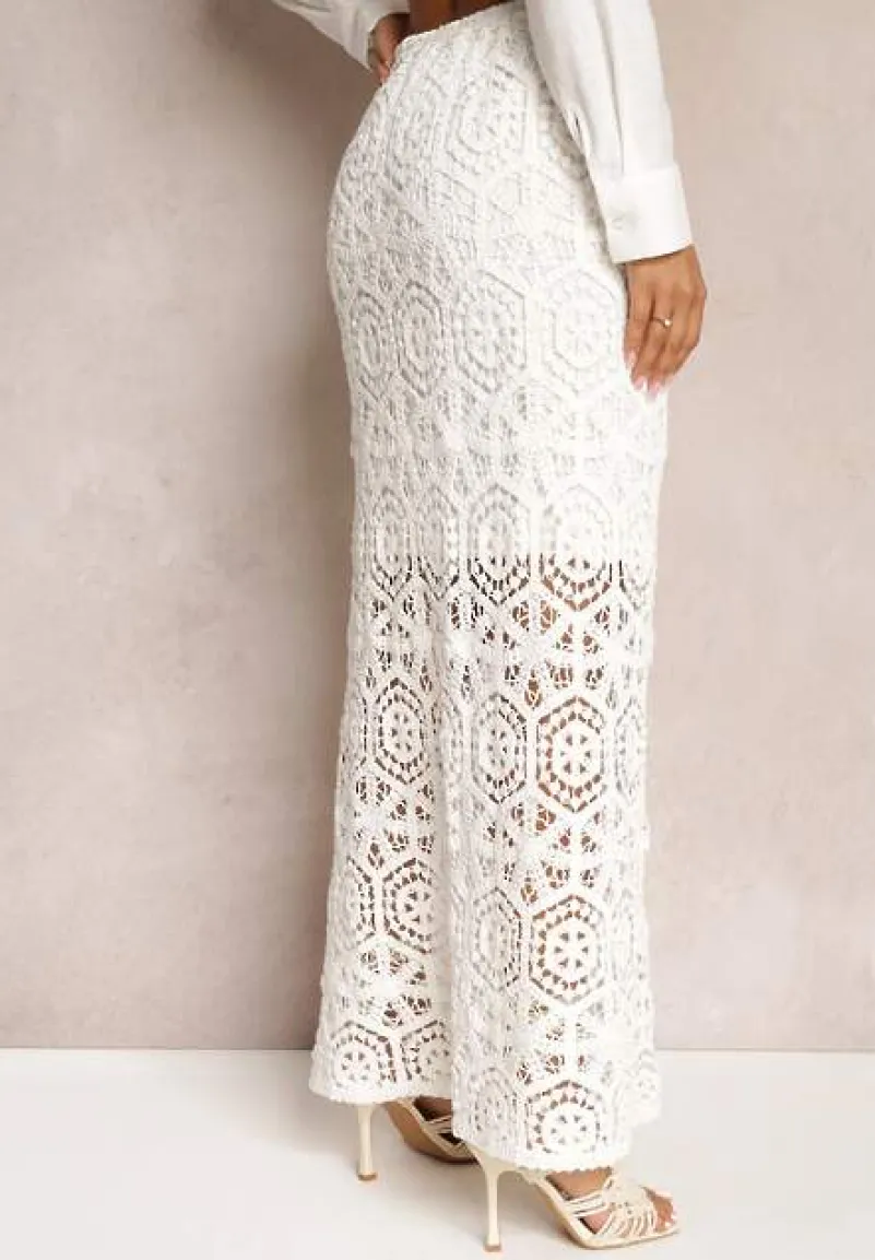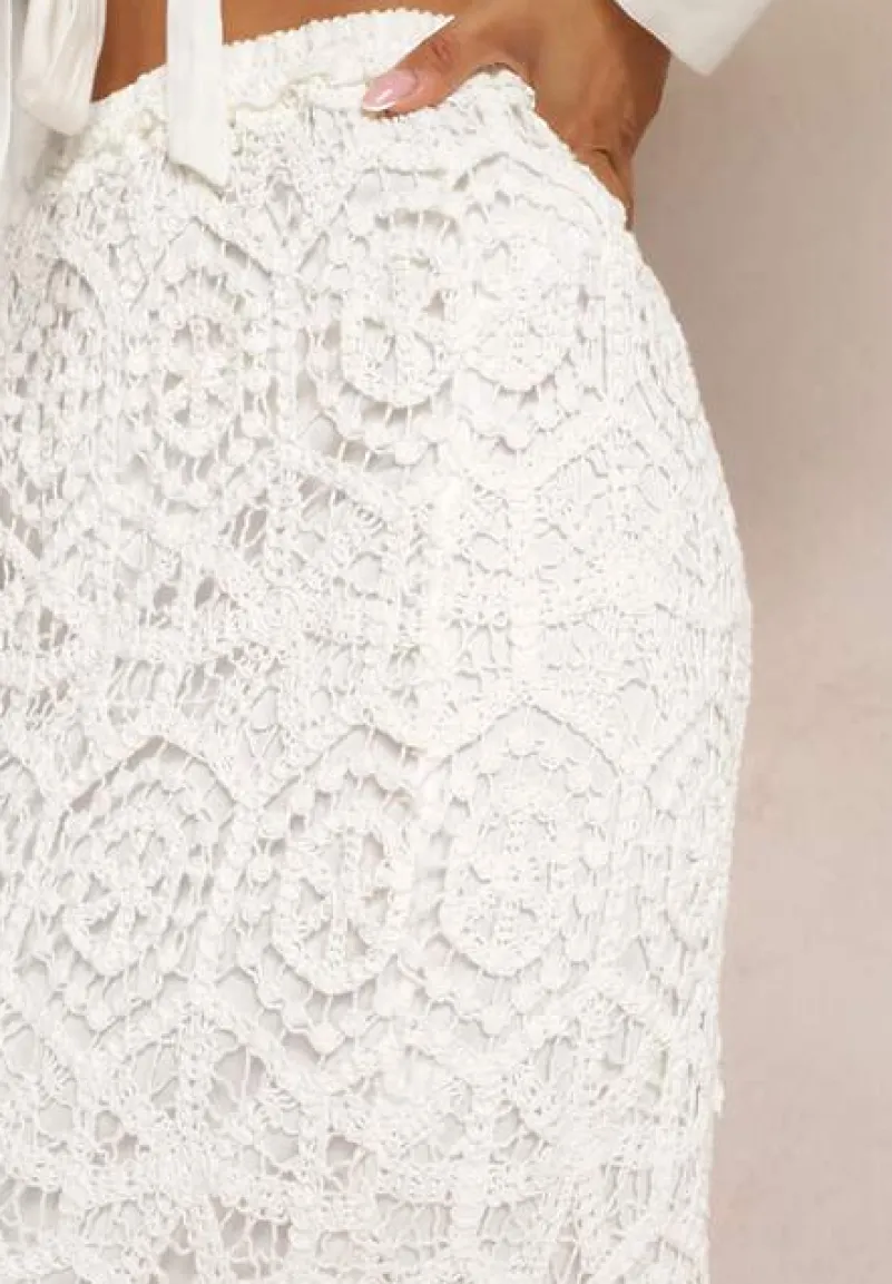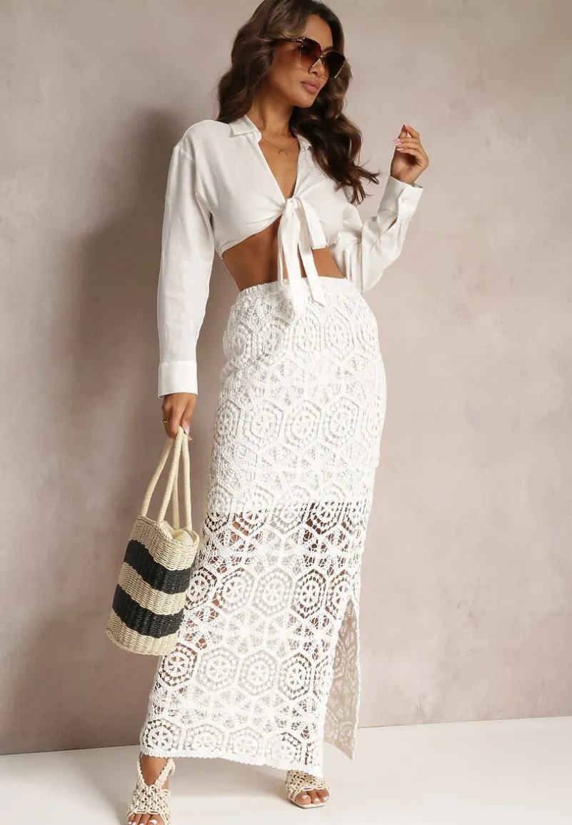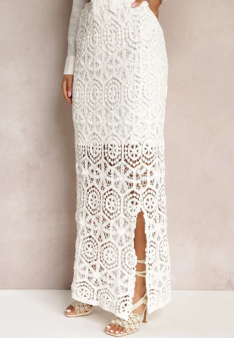 Zjawiskowa spódnica maxi o ażurowym wykończeniu. Zdobiona subtelnym rozcięciem z boku. Posiada elastyczną podszewkę. W pasie wszyta gumka.