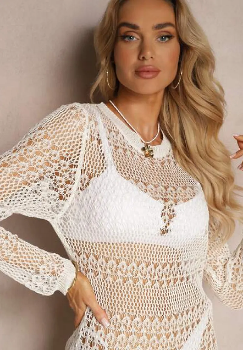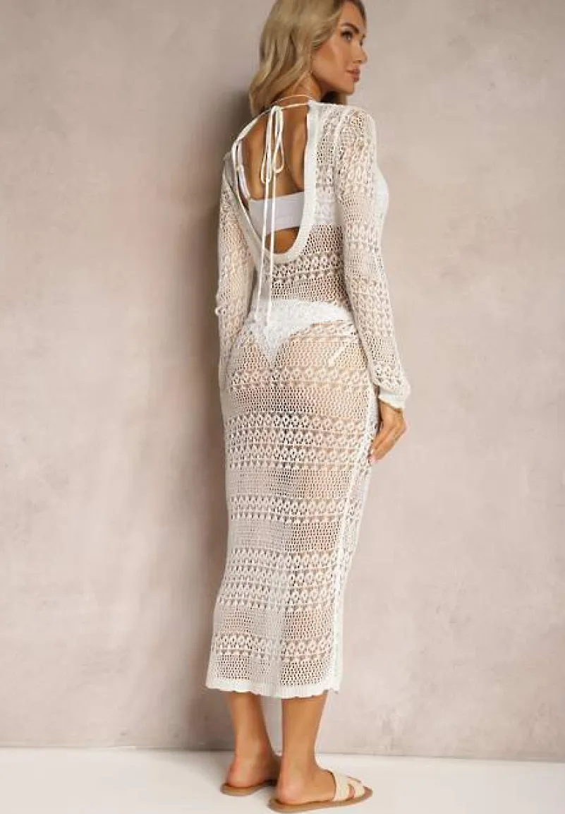 Ażurowa sukienka Odemia z długimi rękawami. Model w stylu narzutki, wiązany na plecach troczkiem.