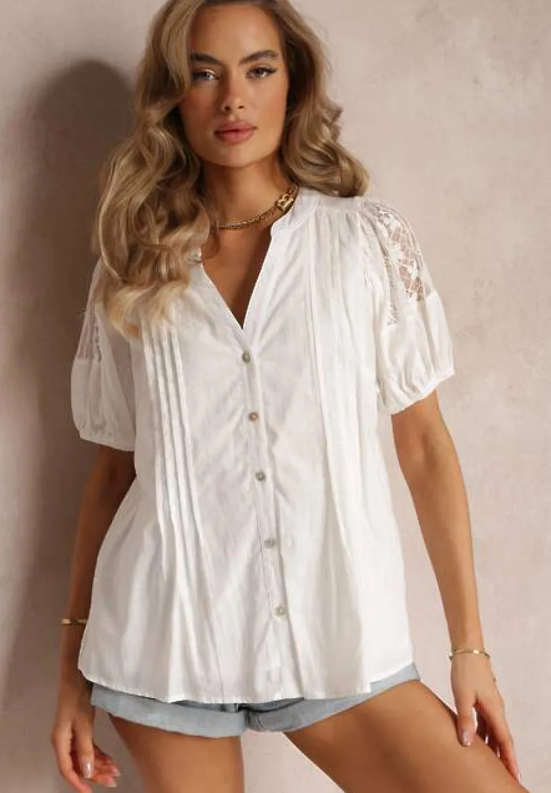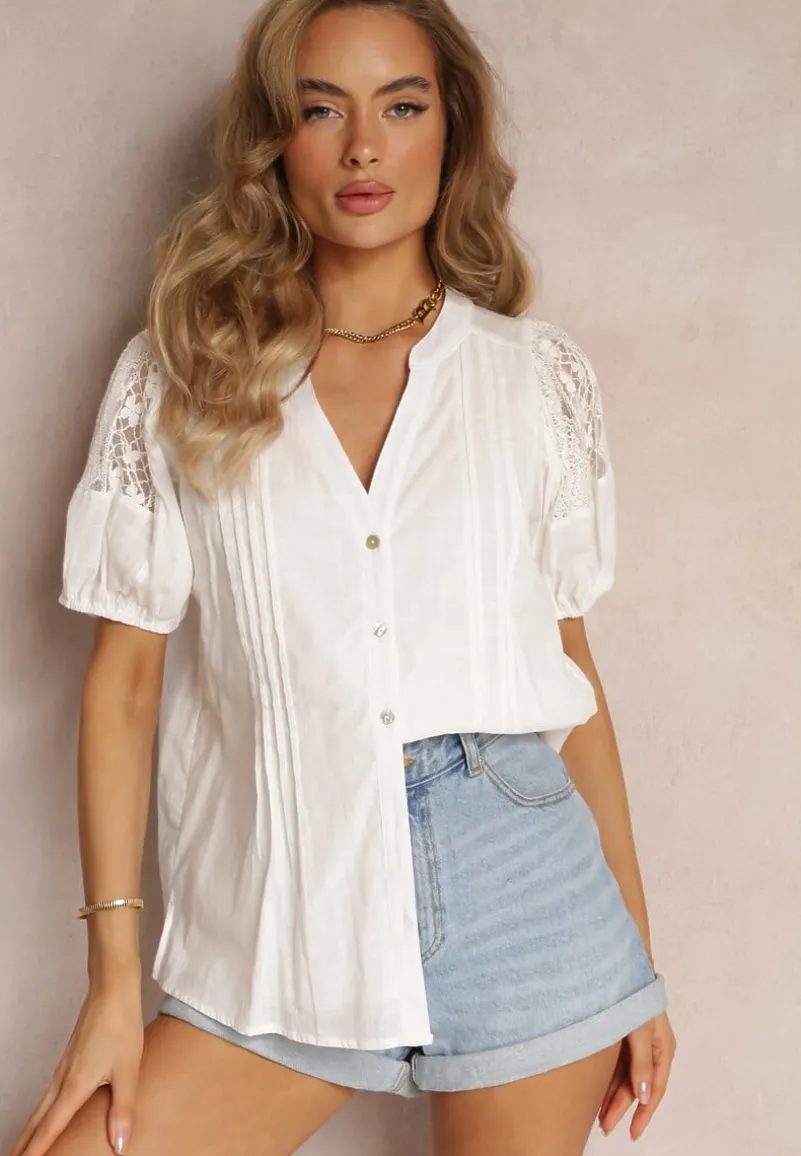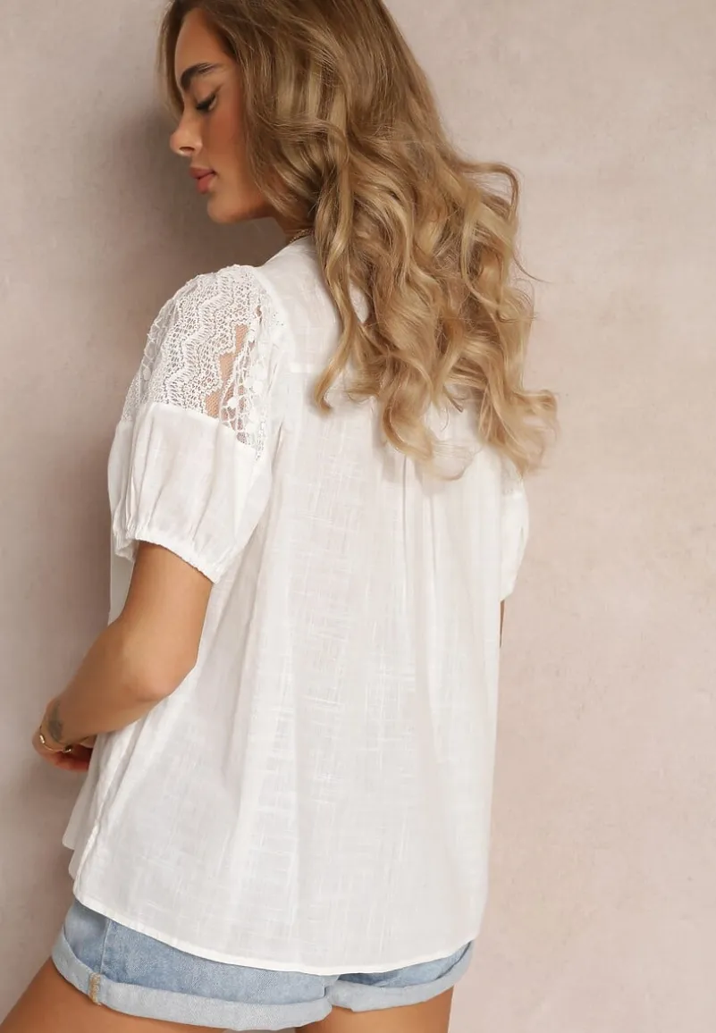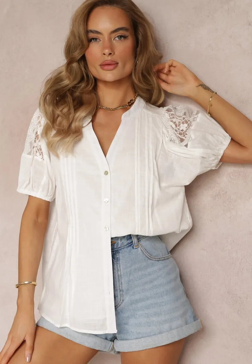 Koszula Shafira zapinana z przodu na guziki. Krótkie, bufiaste rękawy z koronkowymi wstawkami. Model wykonany z bawełnianej tkaniny.