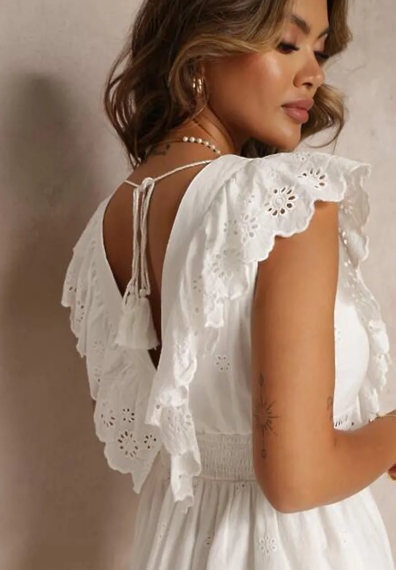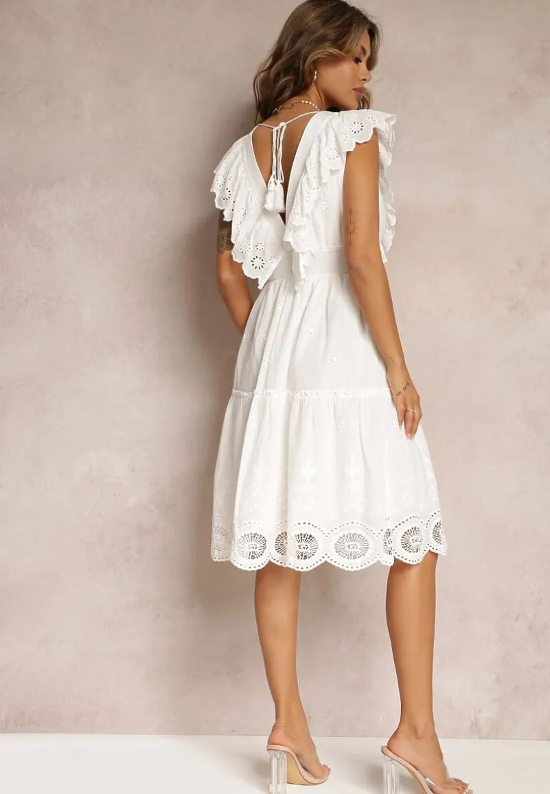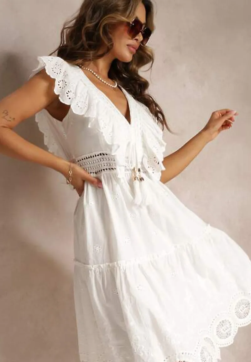 Sukienka Casira o długości midi i rozkloszowanym kroju, zakończona falbanką na dole i przy ramionach. Dekorowana haftem i koronkowymi wstawkami na całej długości. Z tyłu wycięcie oraz wiązanie. Z przodu ozdobne sznurki z chwostami. Posiada podszewkę.