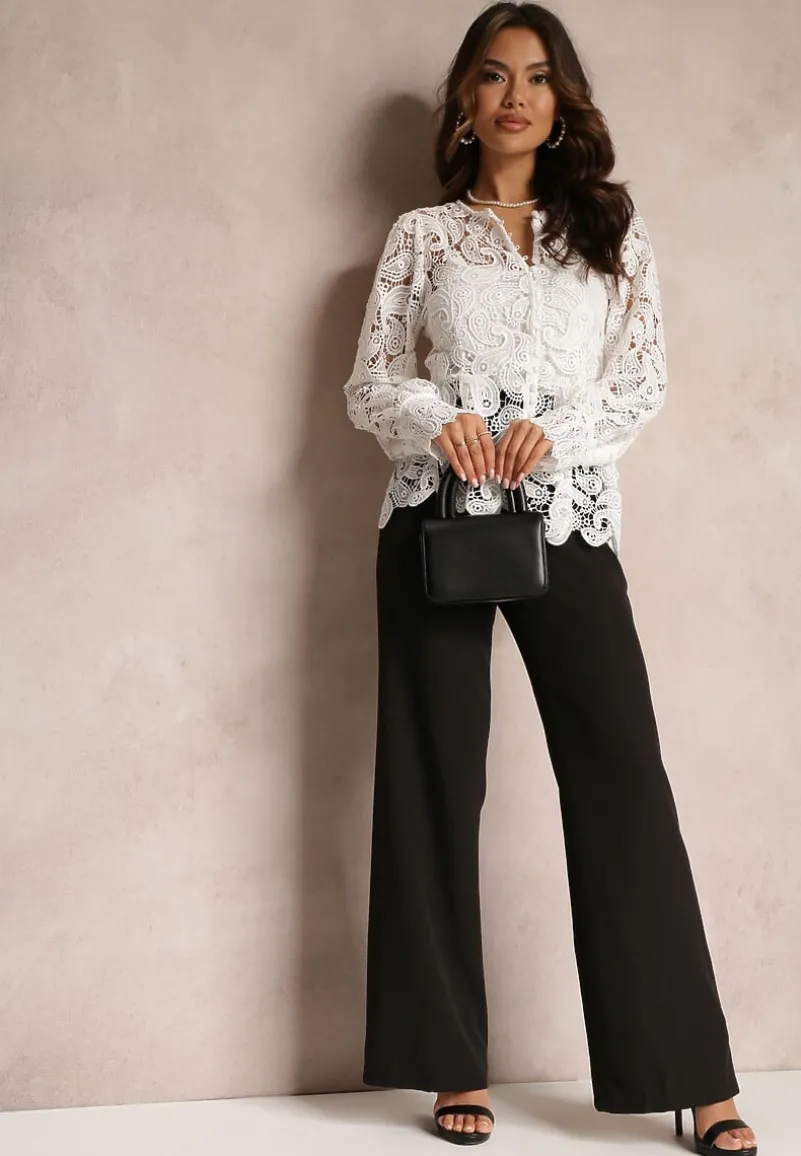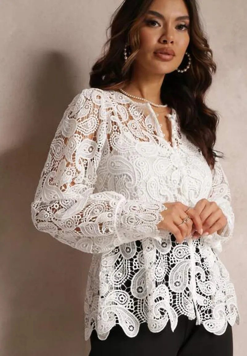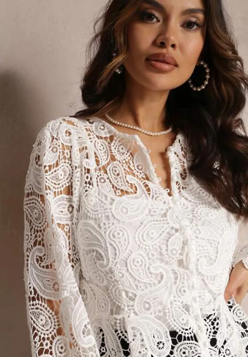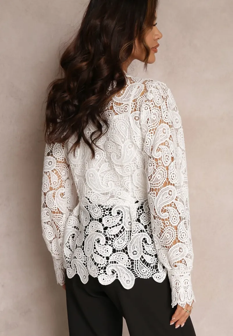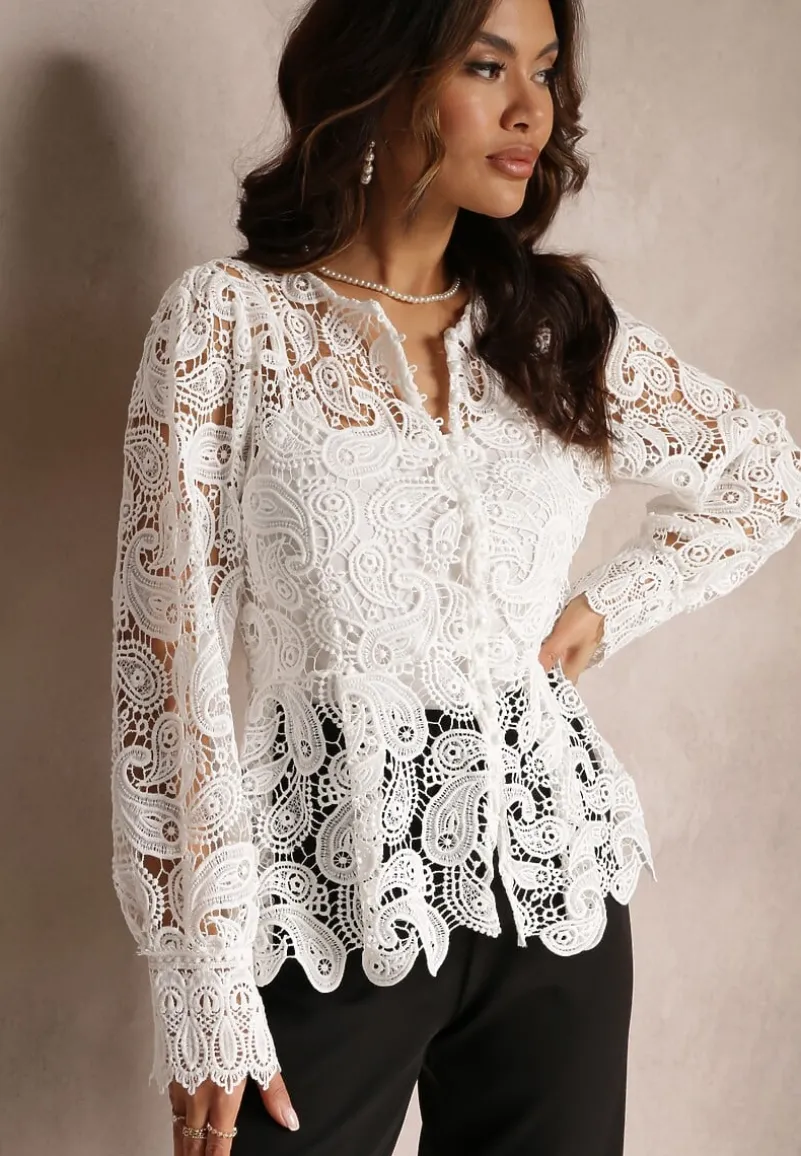 Bluzka Fermin z długim rękawem i płytkim, zaokrąglonym dekolcie. Wykonana z koronkowej tkaniny. Pod spodem gładki top na cienkich ramiączkach. Z przodu zapinana na rząd guzików.