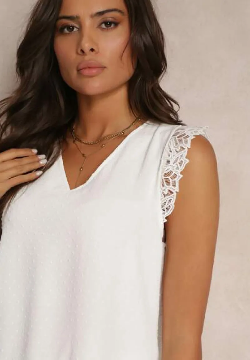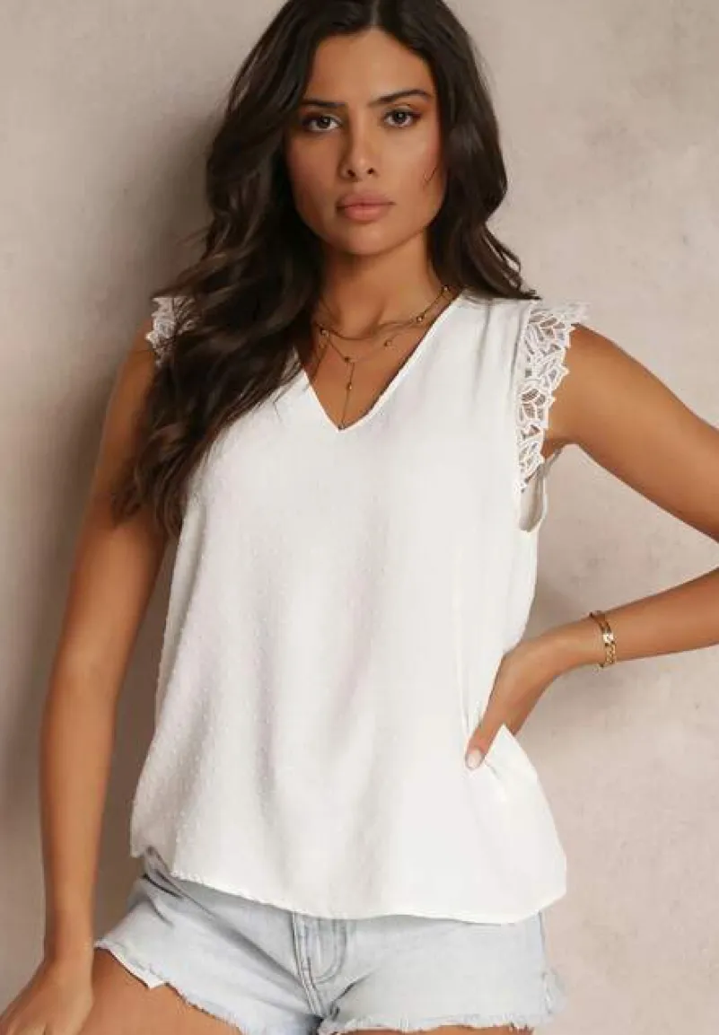 Bluzka Caliya z ozdobnymi, koronkowymi wstawkami na ramionach. Model z trójkątnym dekoltem. Top wykonany z tkaniny plumeti (50% wiskoza, 50% bawełna). Idealny do codziennych outfitów.