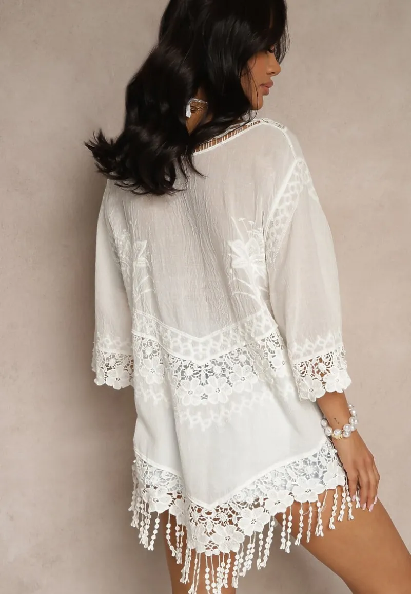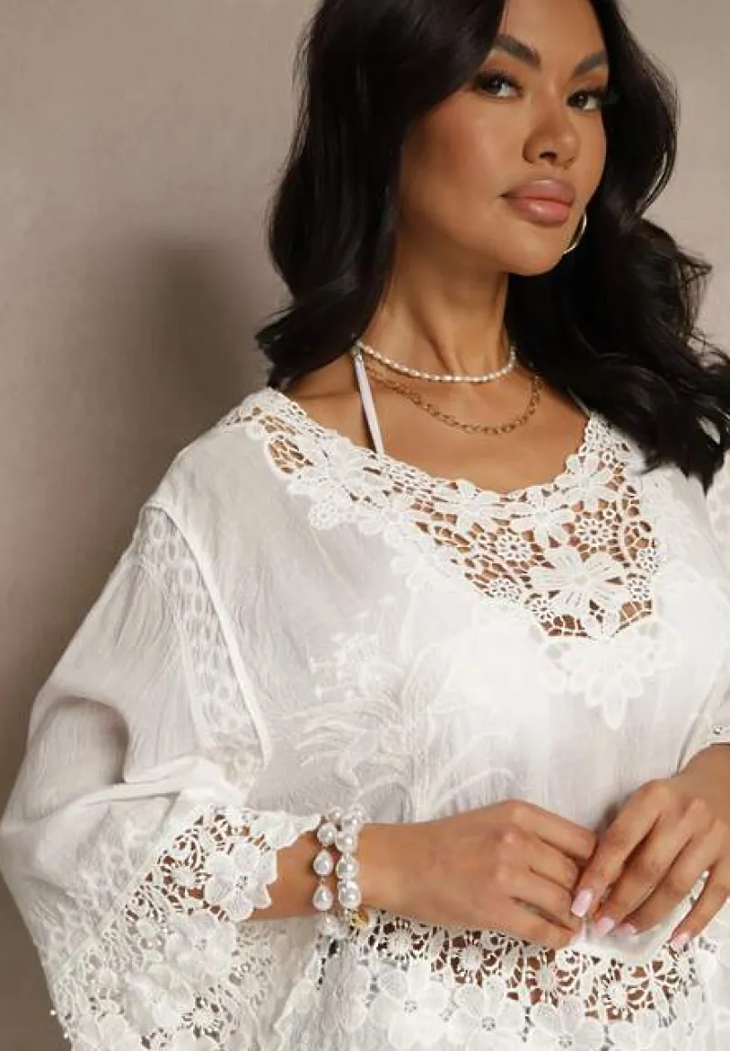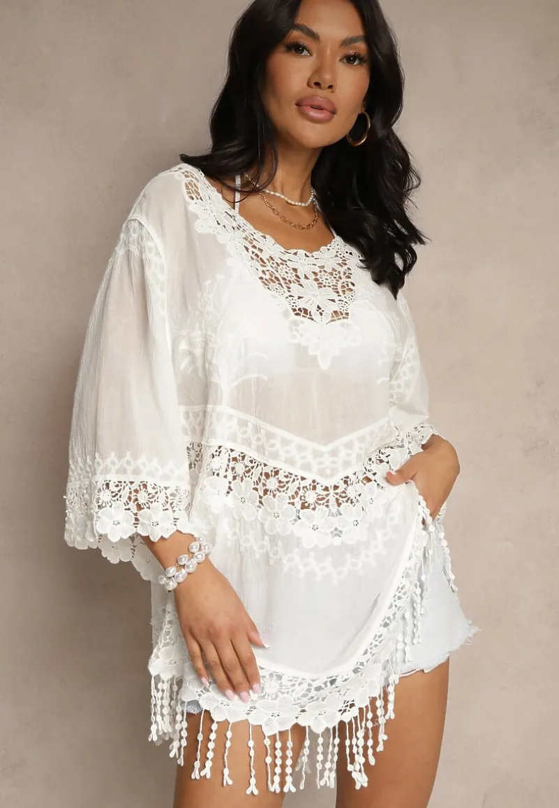 Bluzka z Bawełny Ozdobiona Koronką Frędzlami i Haftem Puviane to absolutny must-have w Twojej garderobie! Jej luźny krój oraz delikatny dekolt sprawiają, że jest to idealny wybór zarówno na codzienne wyjścia, jak i eleganckie spotkania. Koronkowe zdobienia oraz frędzle wprowadzają nutę bieliźnianego klimatu, który doskonale uzupełni Twoje ulubione jeansy lub spódnicę maxi. Stylizując ją z klasycznymi cygaretkami i sandałami na obcasie, zyskasz wyjątkowy look, który podkreśli Twoją pewność siebie i wyczucie stylu!