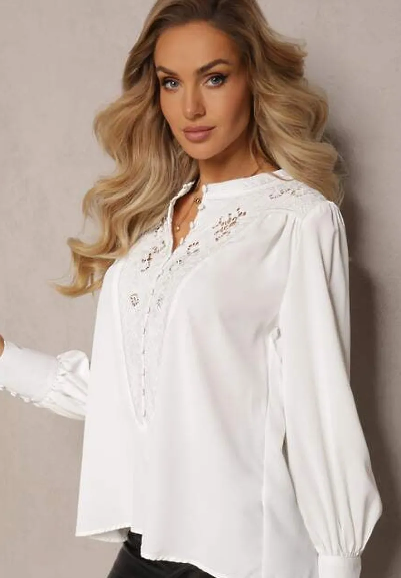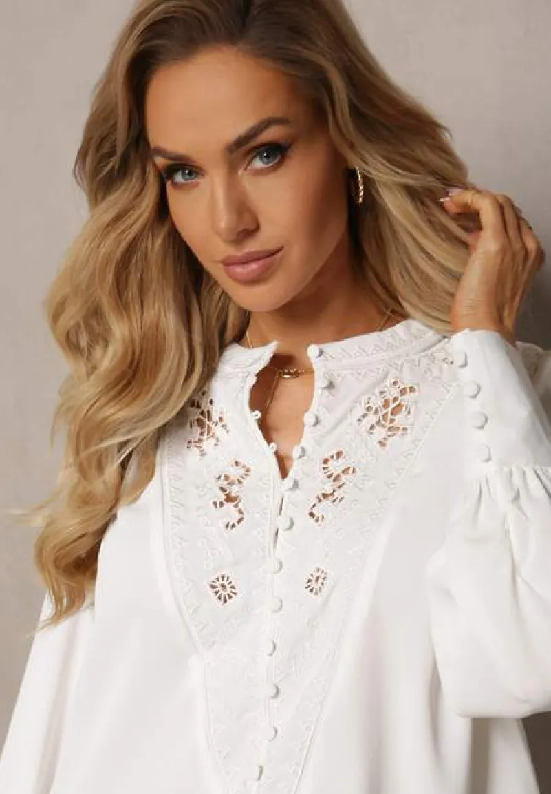 Bluzka Zanya wykonana z tkaniny dekorowanej haftowanymi wstawkami. Zapinana z przodu na rząd guzików przy dekolcie. Płytki, okrągły dekolt. Luźne rękawy zakończone mankietami na guziki.