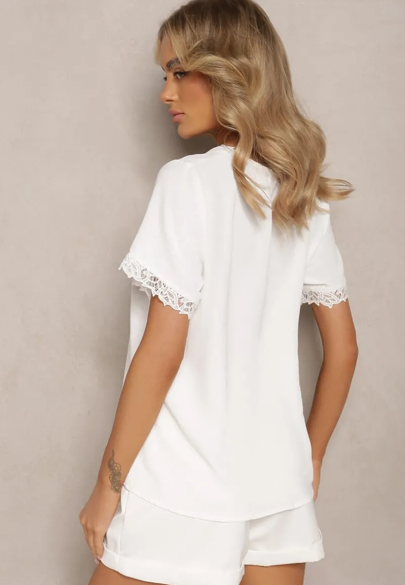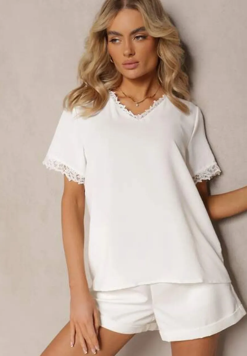 Bluzka Tirvana o luźnym fasonie z trójkątnym dekoltem. Krawędzie dekoltu i krótkich rękawów ozdobione siateczką. Stwórz z nią casual look – dodaj jeansy, mokasyny i shopperkę.