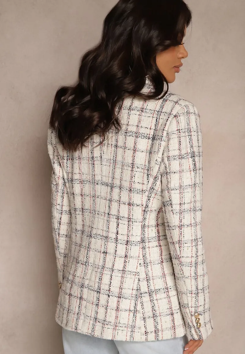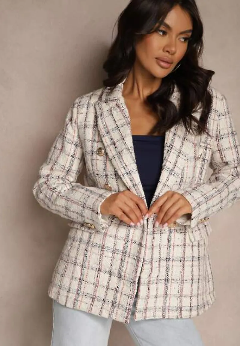Dzianinowa marynarka Elilona z klasycznym kołnierzem i ozdobnymi guzikami. Model z długim rękawem, dwurzędowy. Kieszenie z klapami na wysokości pasa. Wykonana z grubszej dzianiny w kratę z błyszczącą nitką. Sprawdzi się w połączeniu ze spodniami skinny i botkami.