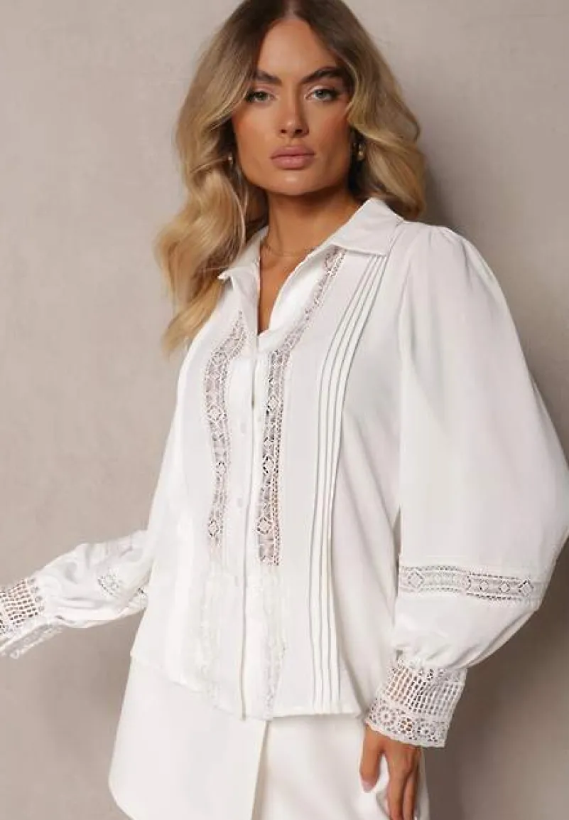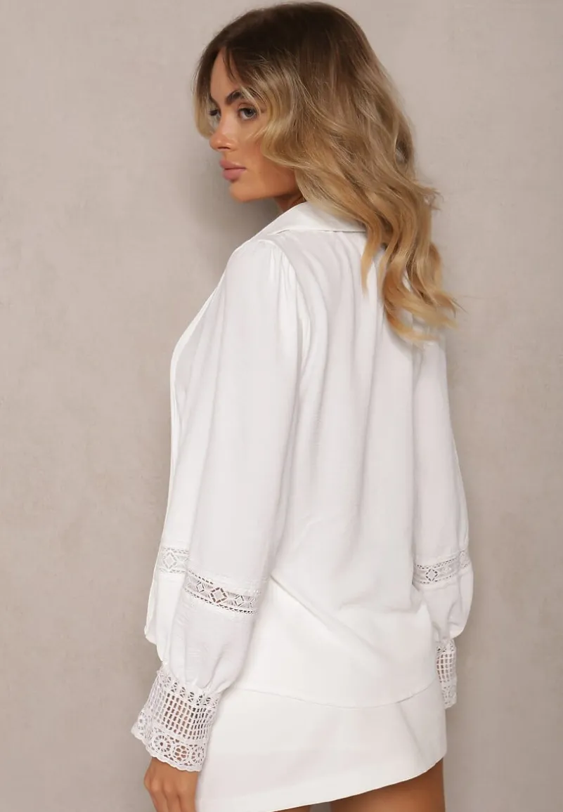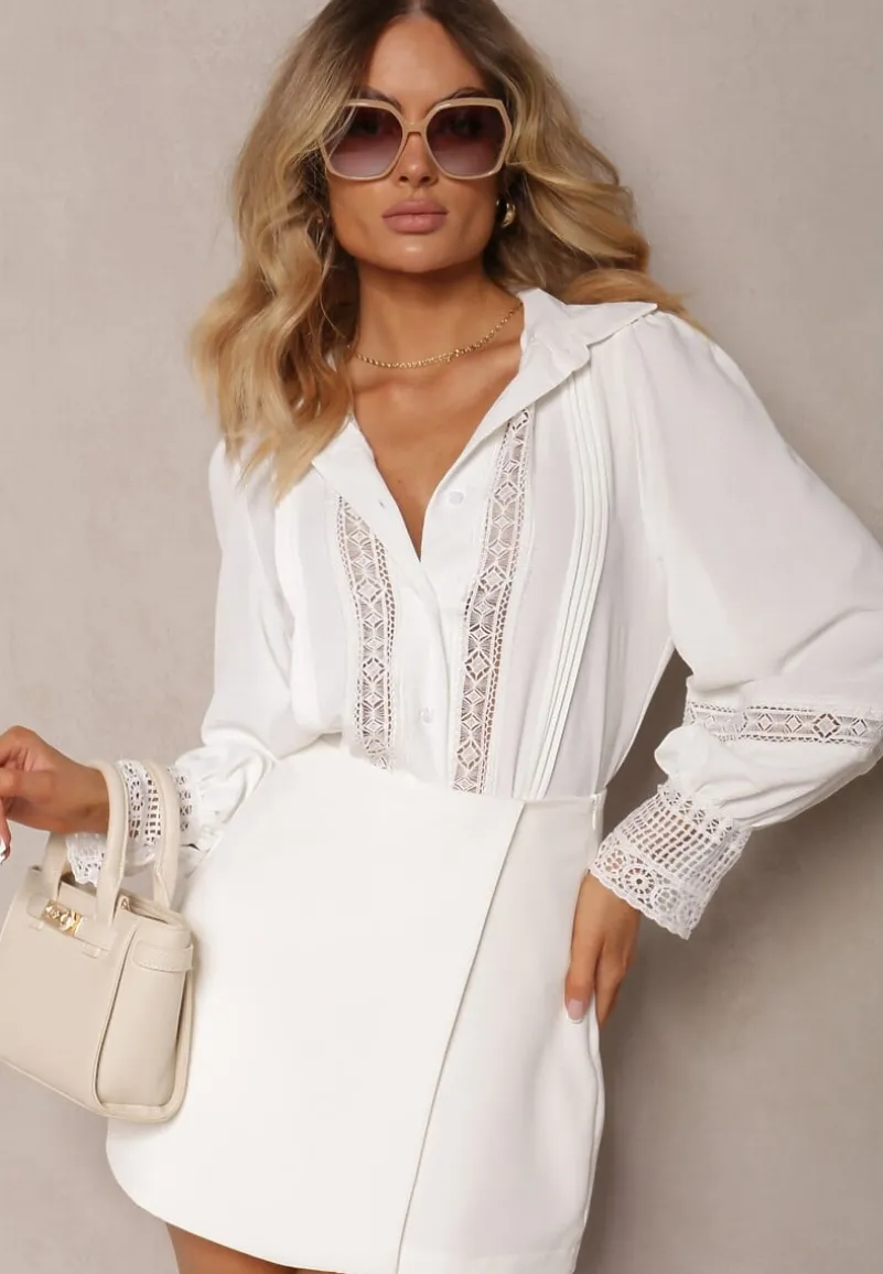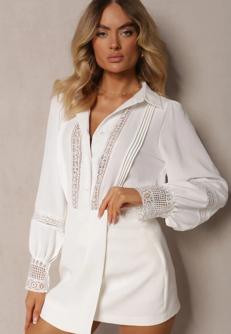 Koszula Haya z klasycznym kołnierzem i guzikami. Z przodu ozdobne wstawki z koronkowego materiału. Model z długimi rękawami. Świetnie sprawdzi się w wielu stylizacjach.