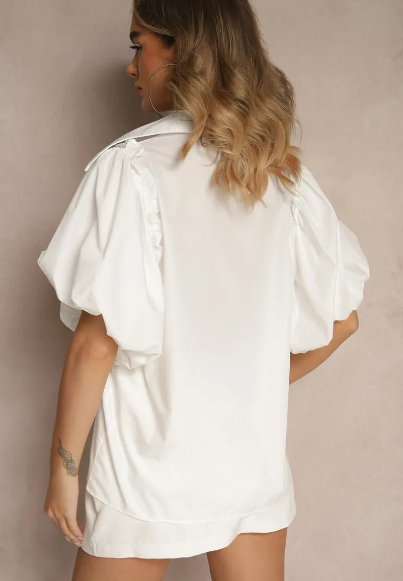 Koszula Klymamene zapinana z przodu na rząd dekoracyjnych guzików. Przy szyi wykładany kołnierz. Wykonana z gładkiej tkaniny, utrzymana w jednolitej kolorystyce. Krótkie, bufiaste rękawy, dekorowane imitacją cyrkonii. Koszulę Klymamene noś w towarzystwie materiałowych spodni lub ulubionych jeansów!