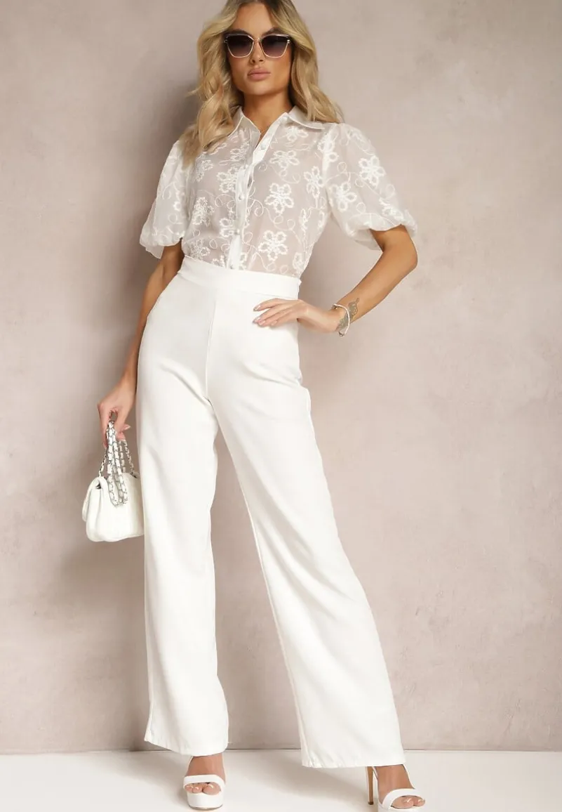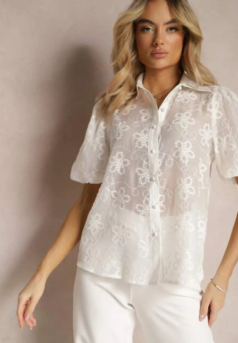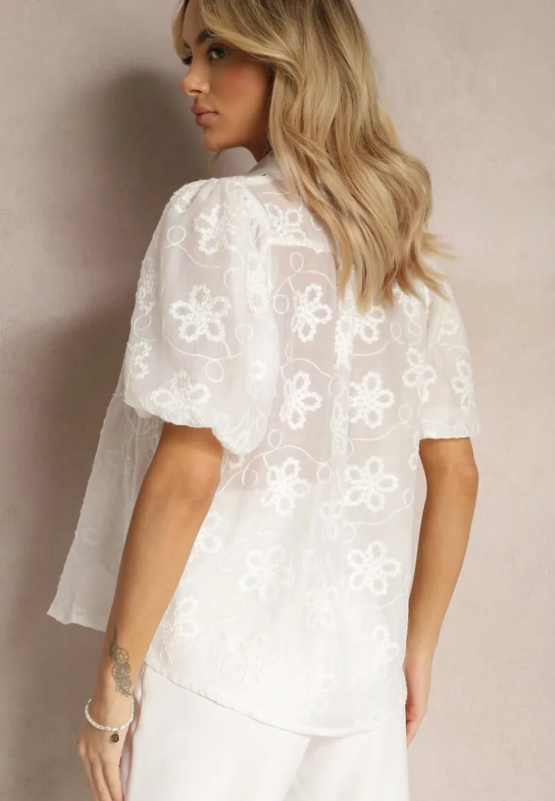 Koszula Binuria z krótkim, bufiastym rękawem. Wykonana z przeźroczystego materiału, z ozdobnym, kwiatowym haftem. Posiada klasyczny kołnierz. Doda Twojej stylizacji subtelnej elegancji!