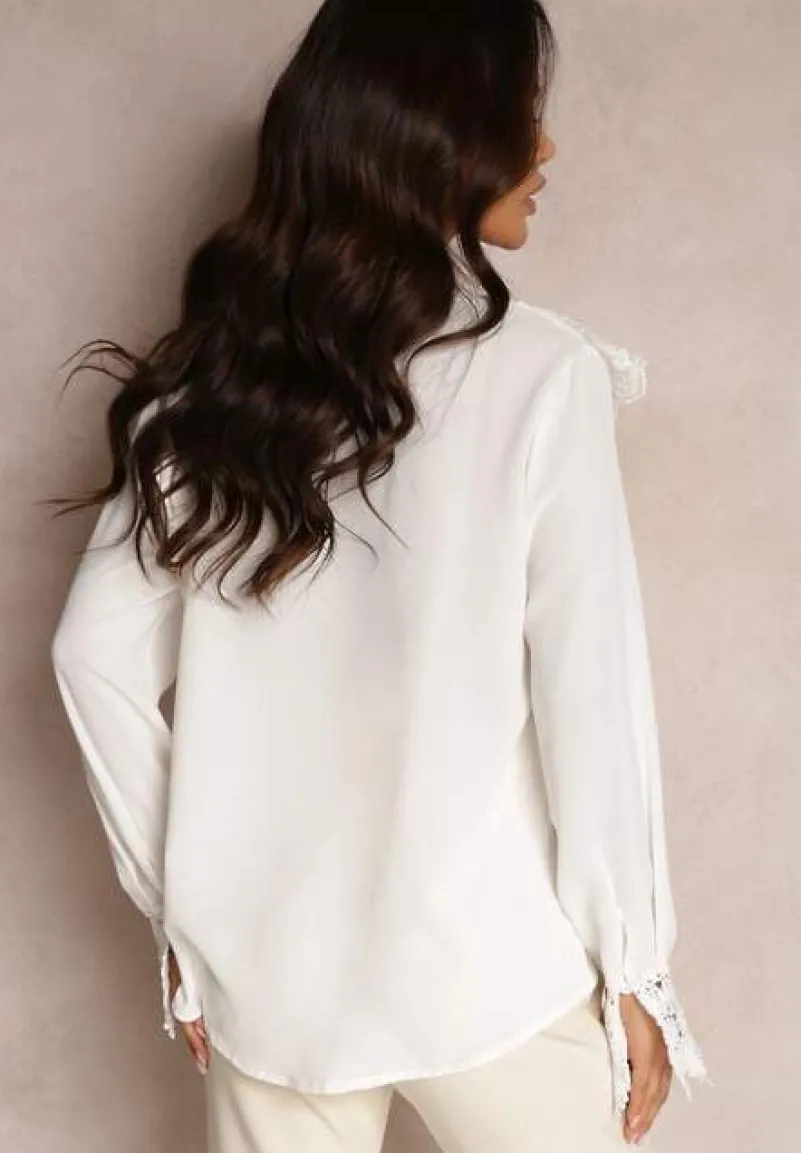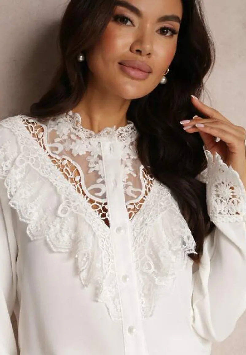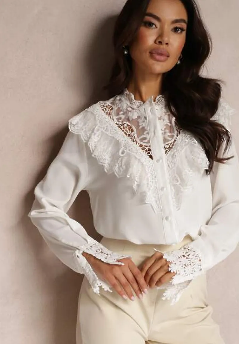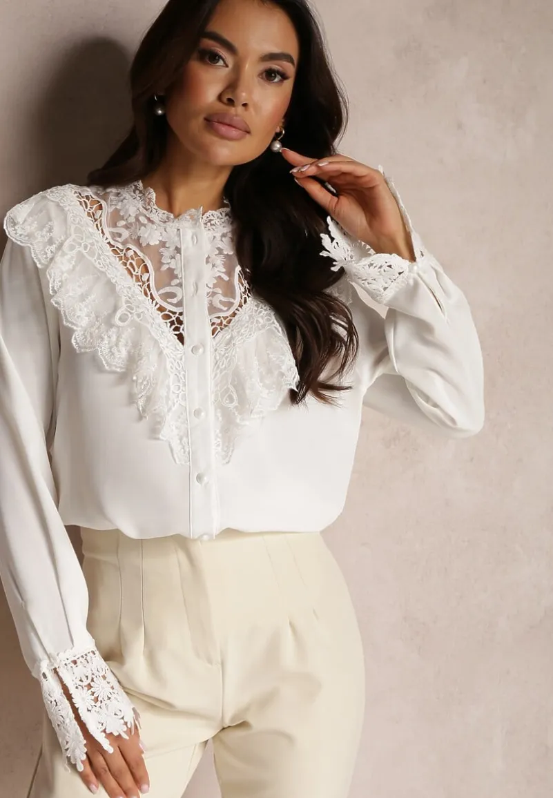 Koronkowa koszula Hassei zapinana na ozdobne guziki w kształcie pereł. Ozdobiona piękną koronką wszytą przy dekolcie oraz na końcu długich rękawów. Modna koszula Hassei sprawdzi się w stylizacjach o każdej porze roku.