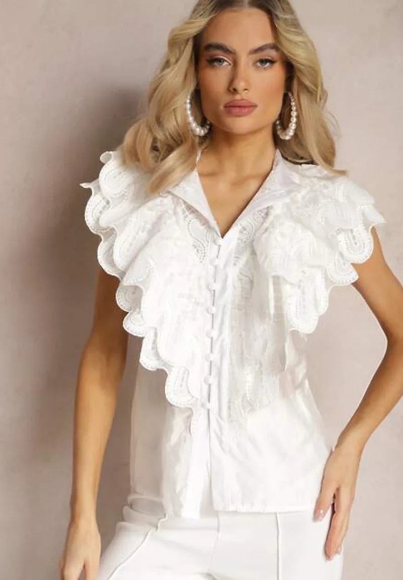 Wyjątkowa koszula Clioni z guzikami i kołnierzykiem. Na przodzie i ramionach wszyte szerokie, koronkowe falbany, dzięki którym wyróżnisz się z tłumu. Idealna na wiosnę i lato.