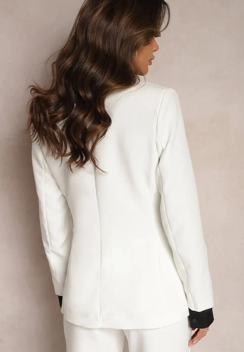 Marynarka Timatea w eleganckim stylu. Dwurzędowy fason z biżuteryjnymi guzikami. Góra z kołnierzykiem i klapami, na dole imitacja wsuwanych kieszeni. Z długim rękawem. Na wysokości ramion, pod spodem, wszyte poduszeczki. Koktajlowa, dwurzędowa marynarka będzie się świetnie prezentować w duecie z satynową spódnicą.