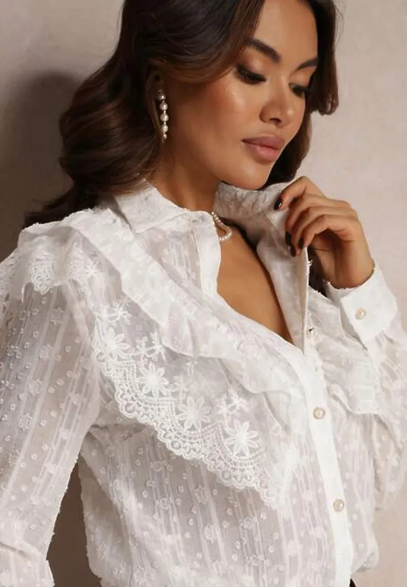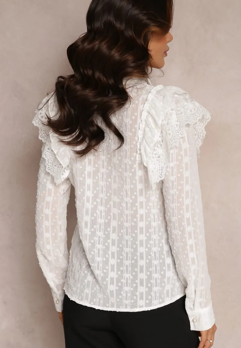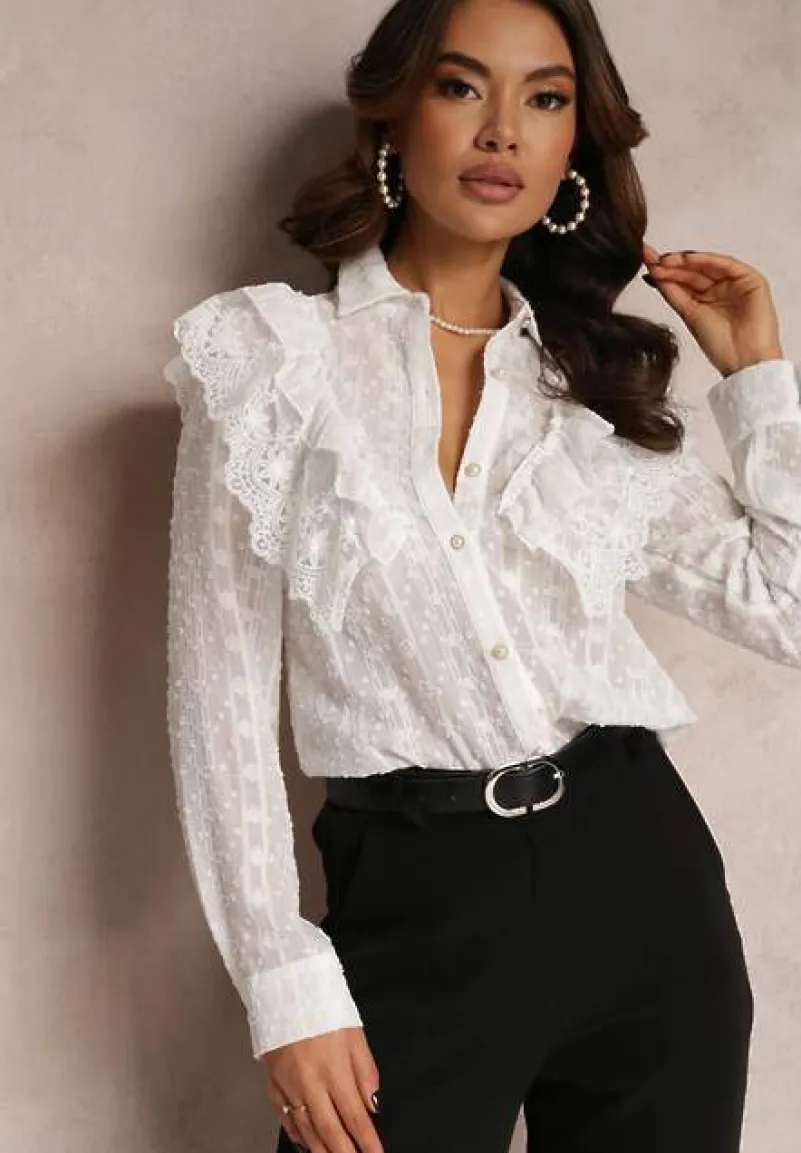 Koszulowa bluzka Ettawel z klasycznym kołnierzem, zapinana na guziki. Wykonana z prześwitującego materiału z ozdobną, metaliczną nitką i wzorami. Na przodzie falbanka. Metaliczna bluzka Ettawel idealna do spódnic i jeansów.