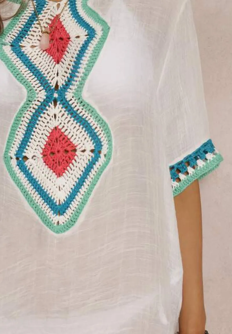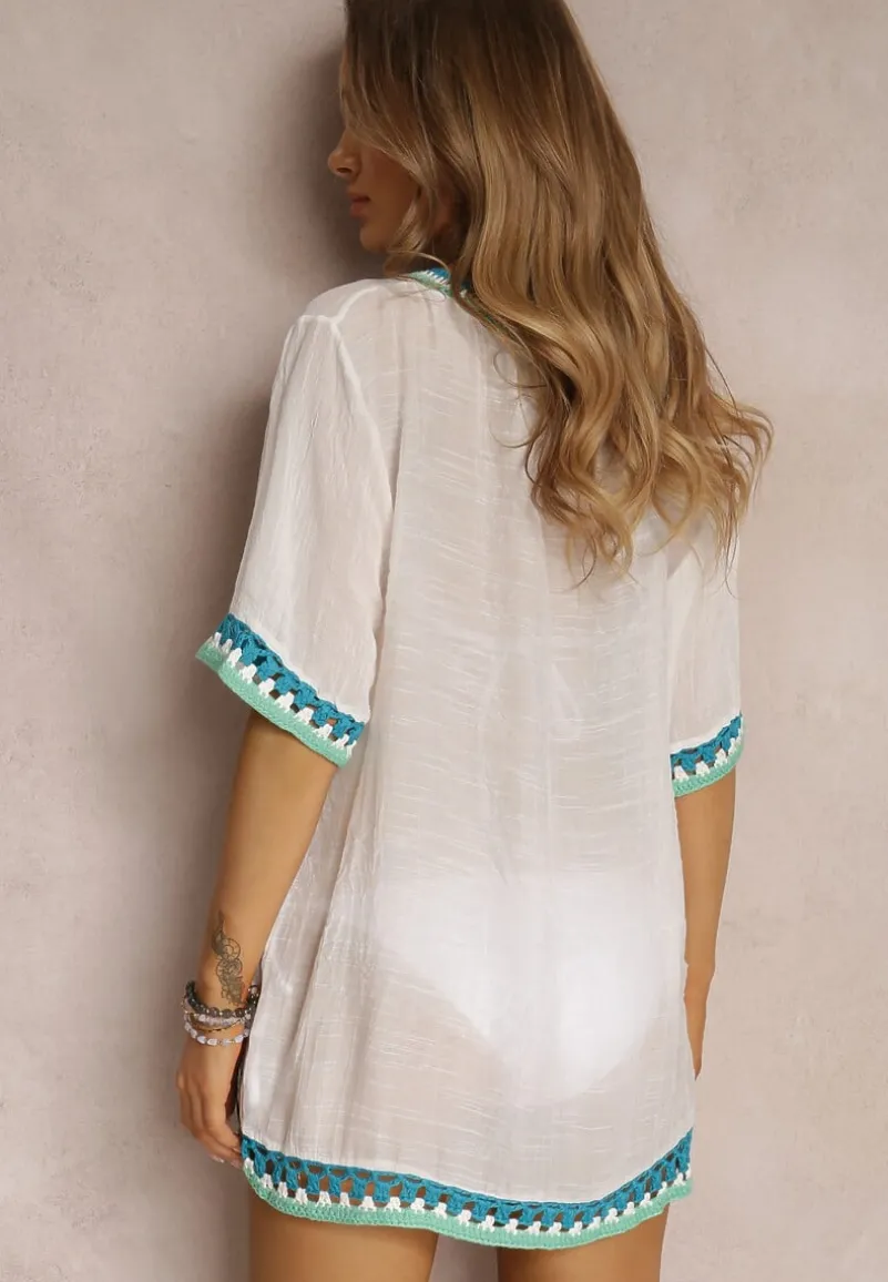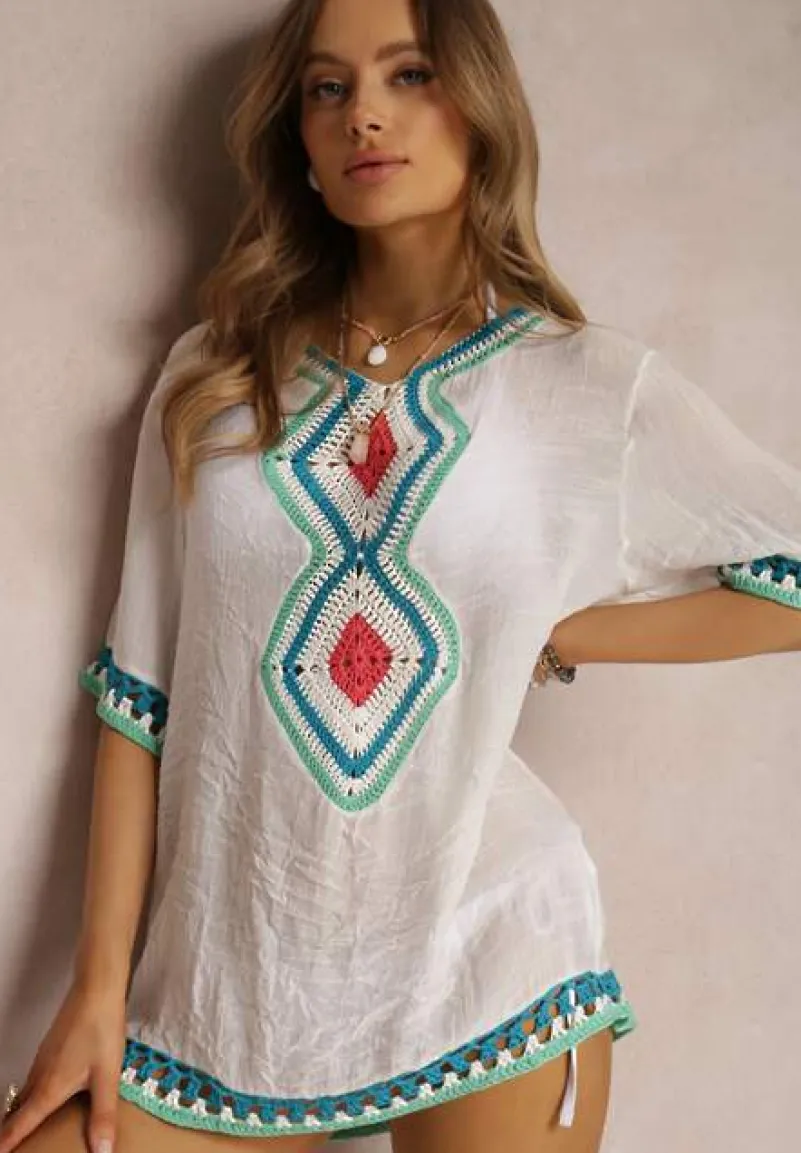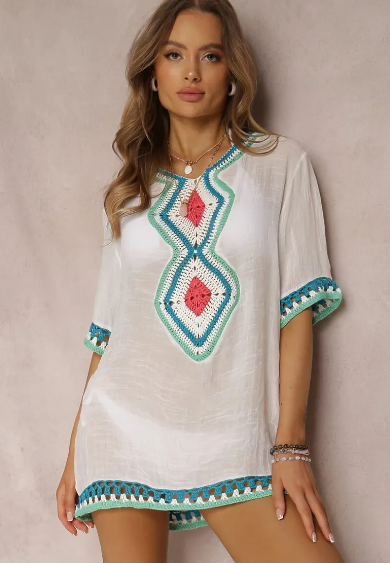 Narzutka Devillers o lekko przedłużonym, luźnym fasonie. Wykonana z lekko prześwitującej tkaniny wykonanej z bawełny (100%). Z krótkim rękawem i trójkątnym dekoltem. Uroku dodają szydełkowe wstawki przy dekolcie, rękawach i na dole. Idealna do codziennych looków w stylu boho!