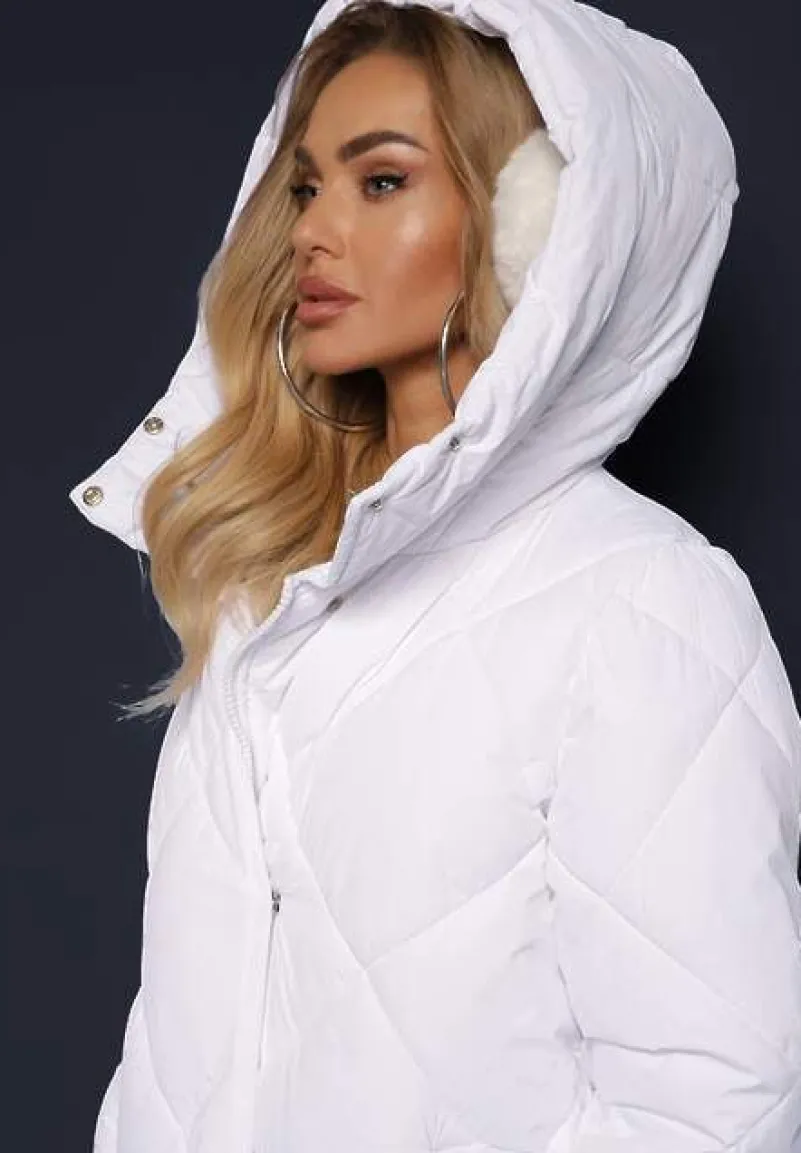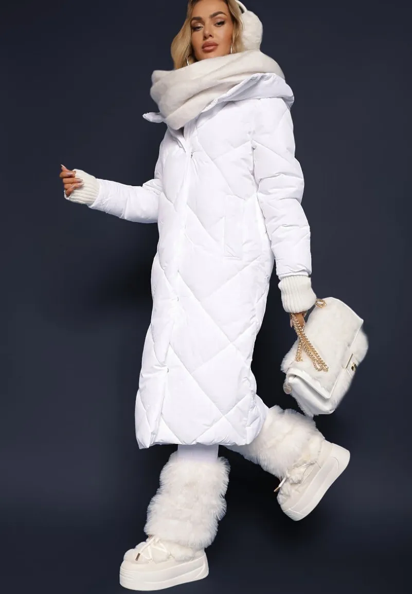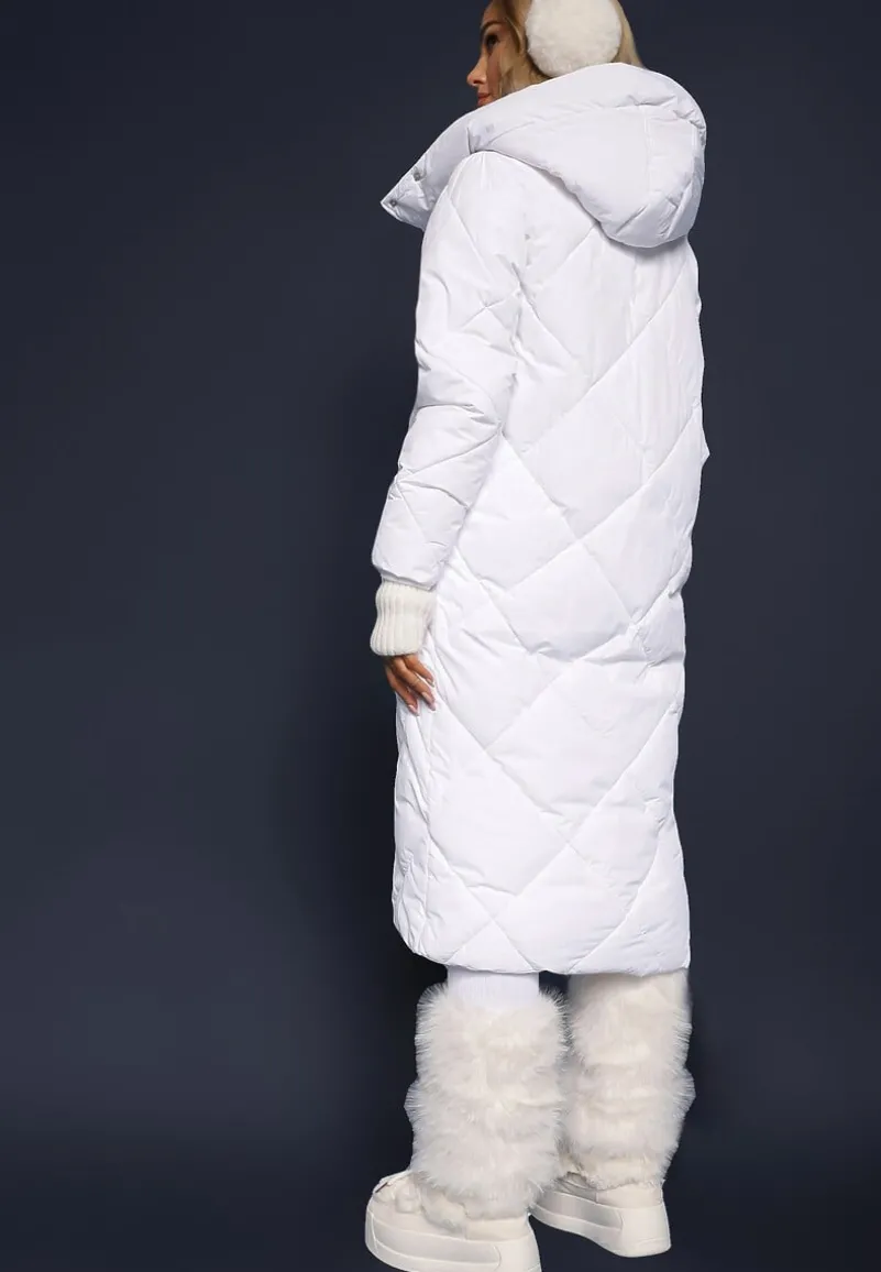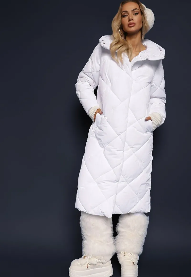 Kurtka Kinassan sięgająca za kolano, zapinana z przodu na zamek błyskawiczny, ukryty pod plisą na napy. Model dekorowany geometrycznym pikowaniem. Średnio ocieplana. Posiada nieodpinany kaptur. Na wysokości pasa wsuwane kieszenie.