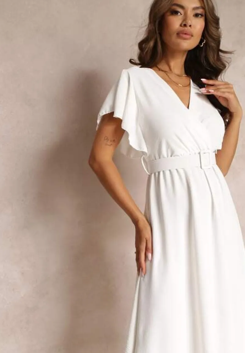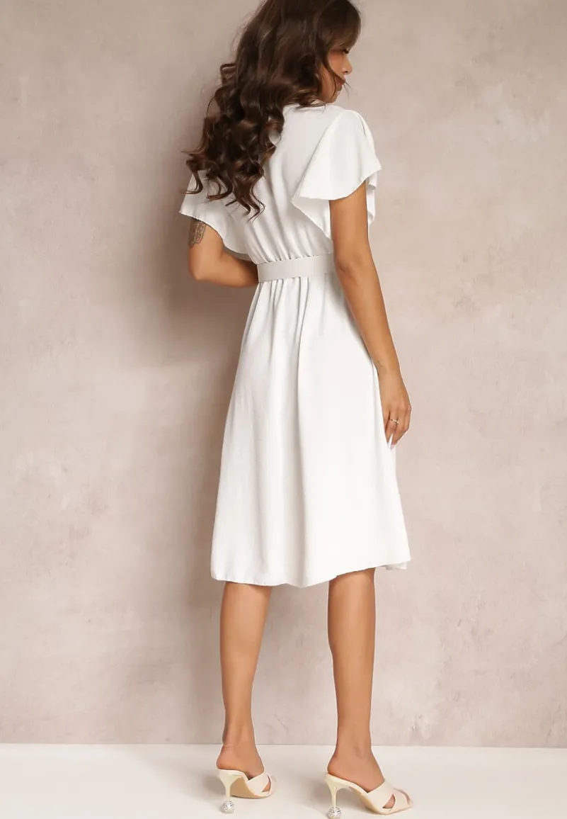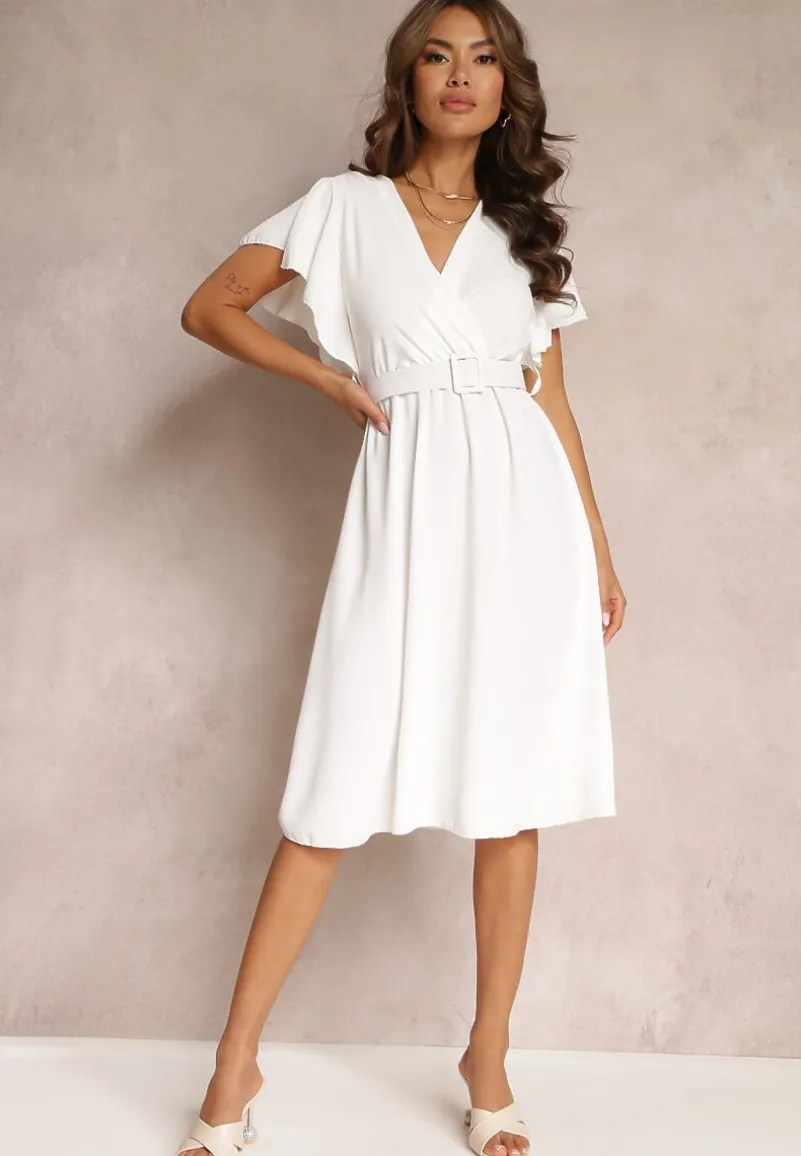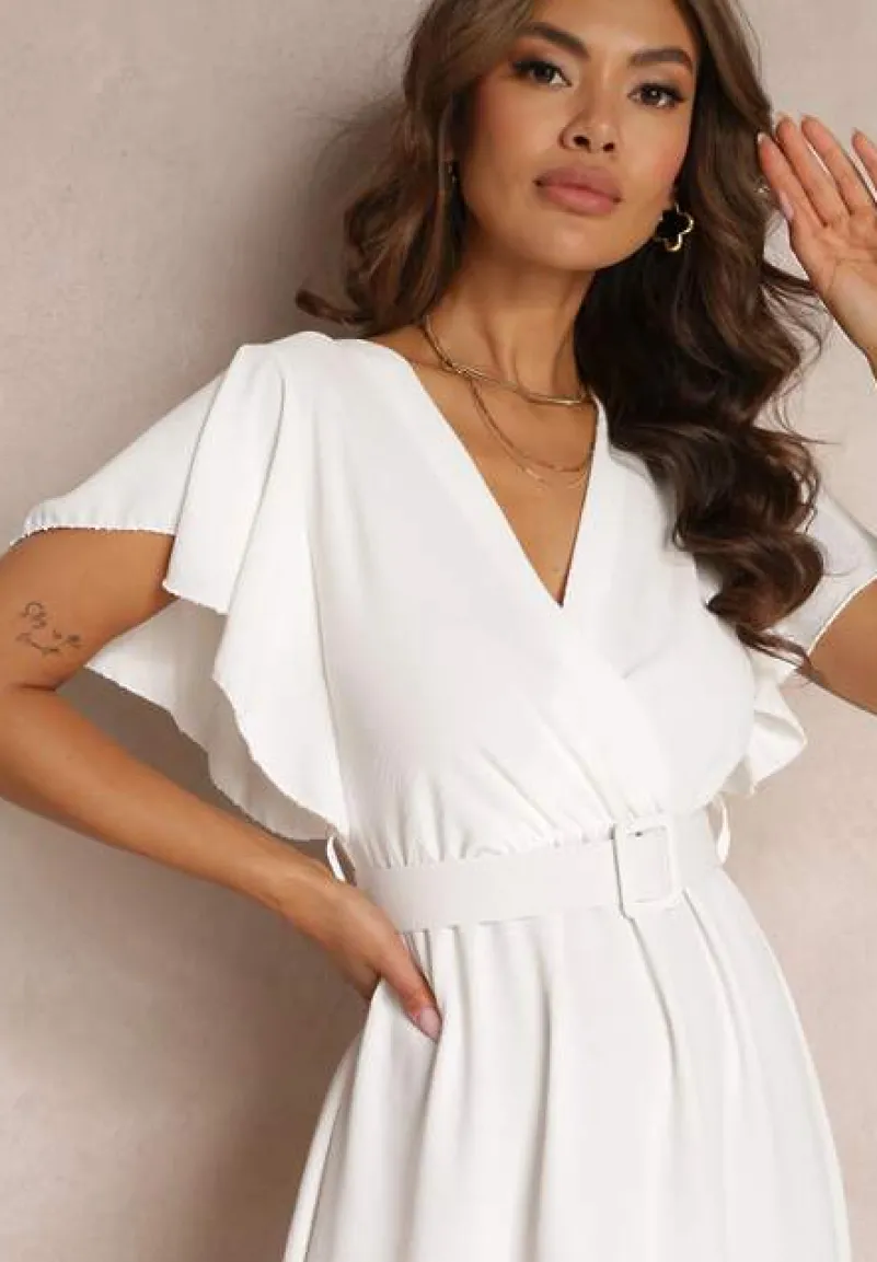 Zwiewna, wakacyjna Sukienka Brinea z kopertowym dekoltem. Przy ramionach dekorowana ozdobnymi falbankami. Bez podszewki. W pasie pasek z klamerką oraz wszyta gumka, która po rozciągnięciu dla rozmiaru S/M mierzy 89 cm.