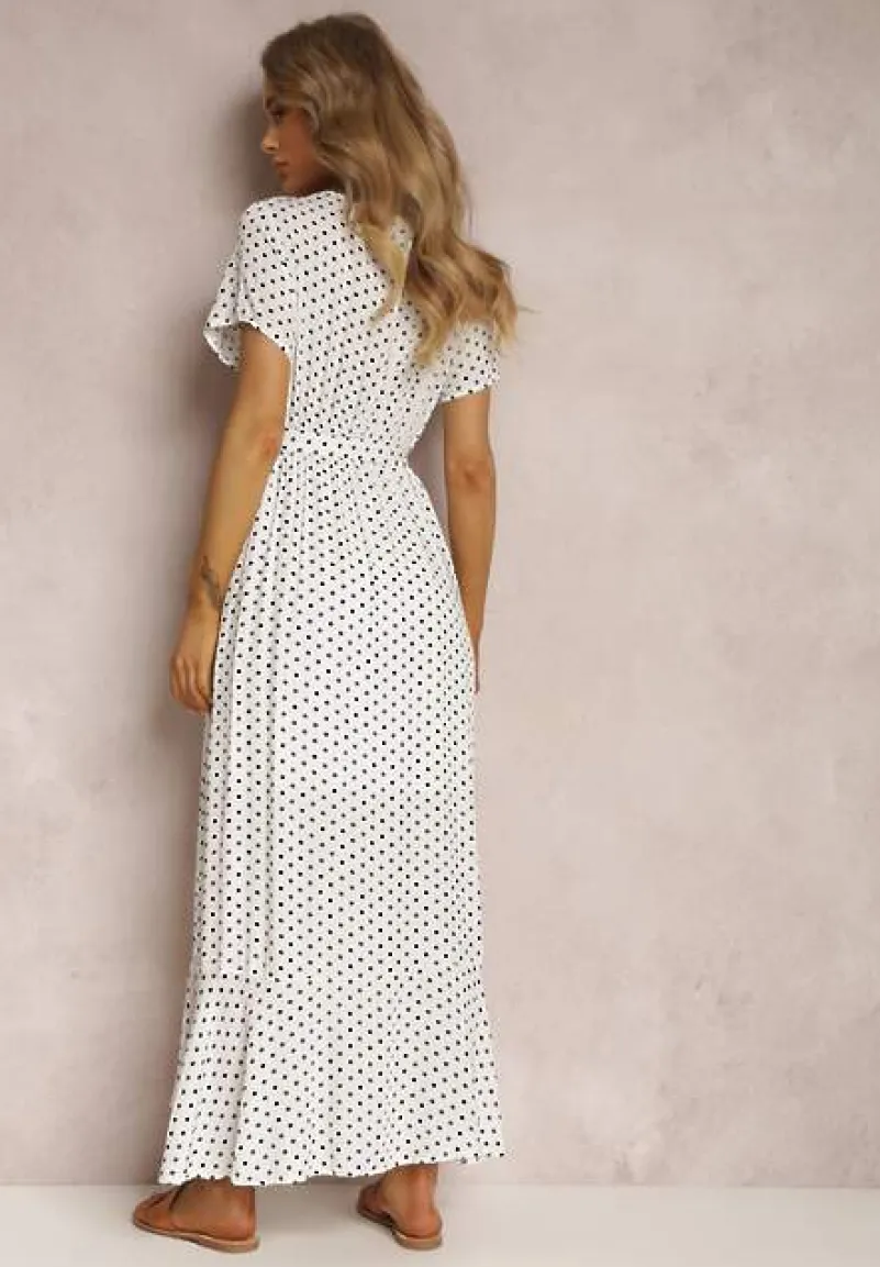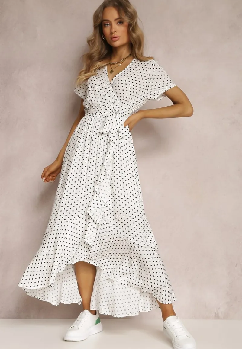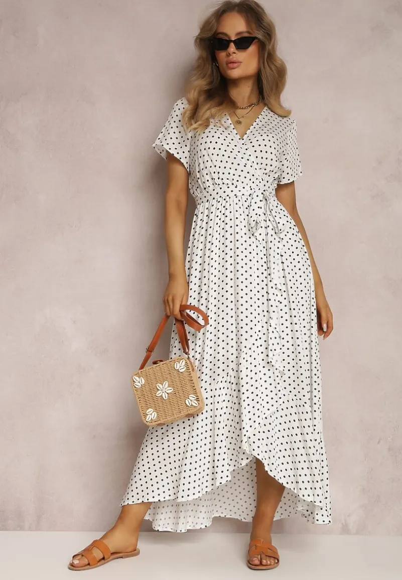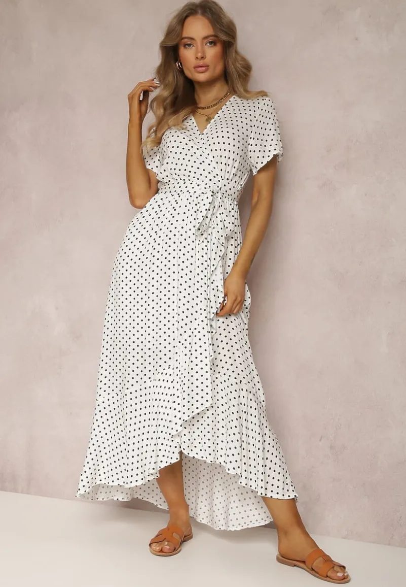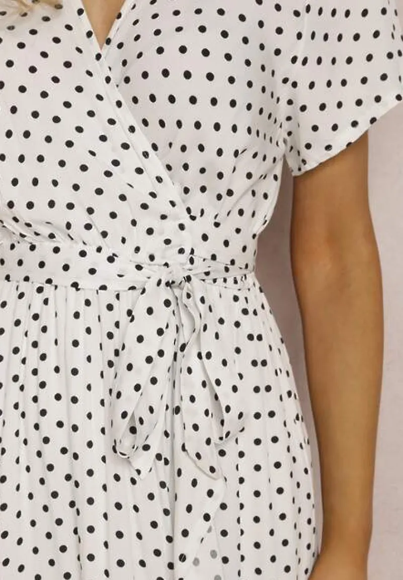 Sukienka Boliphise kopertowa, z krótkim rękawem i głębokim dekoltem. Wykończona falbaną na dolnych krawędziach. Wiązana na boku. W pasie elastyczna gumka. Wykonana z tkaniny w kropki. Bez podszewki. Szerokość w pasie po naciągnięciu gumki to: S = 95 cm, M = 99 cm, L = 103 cm, XL = 107 cm. Noś ją do sandałów na niskim słupku albo klasycznych balerinek.