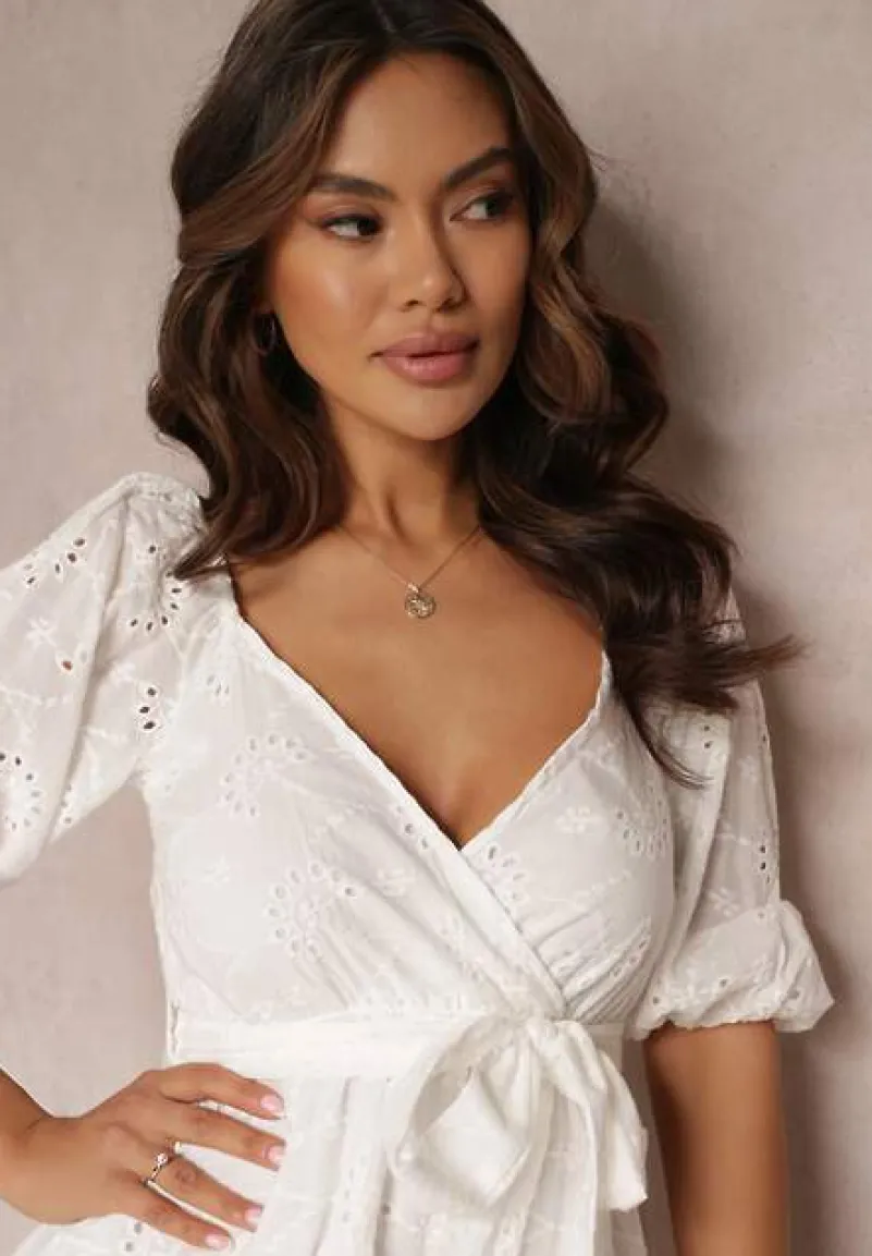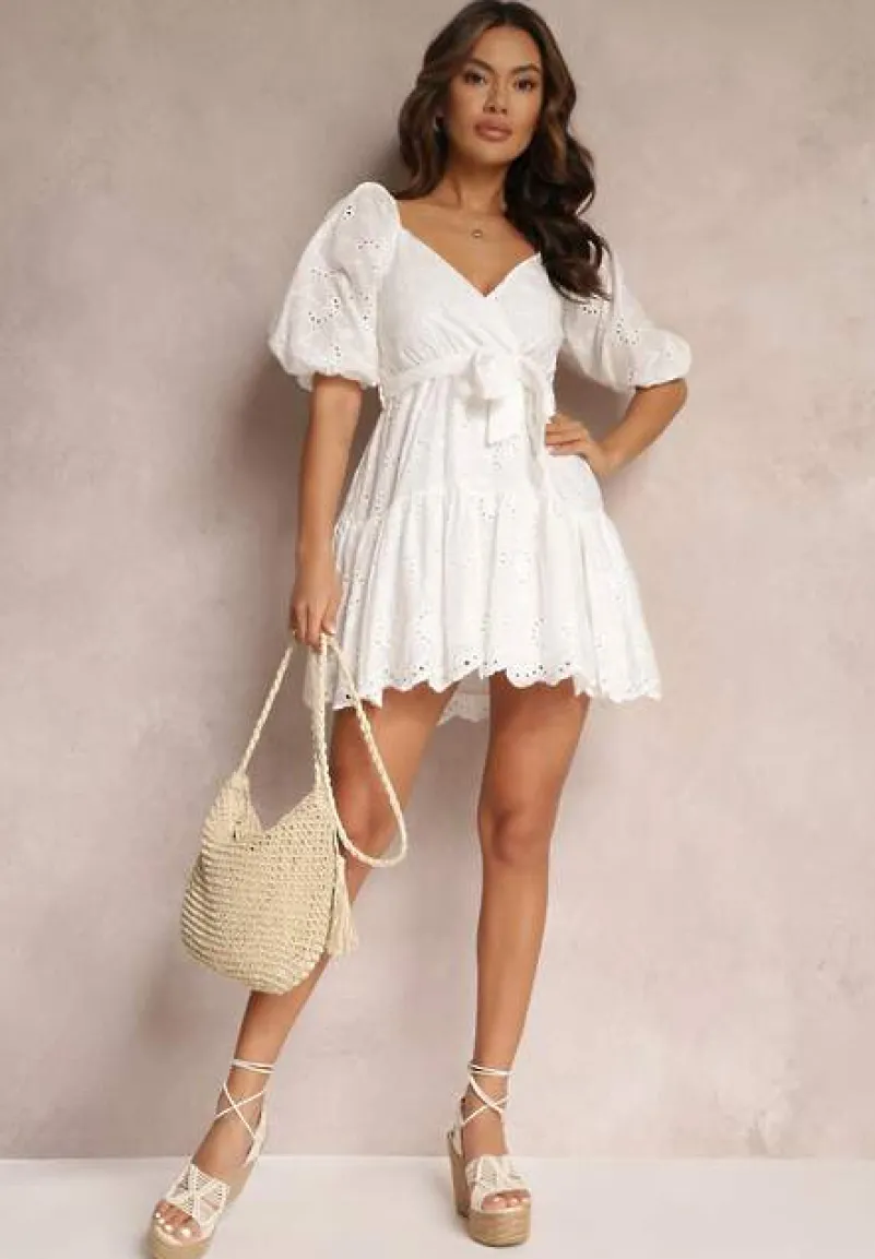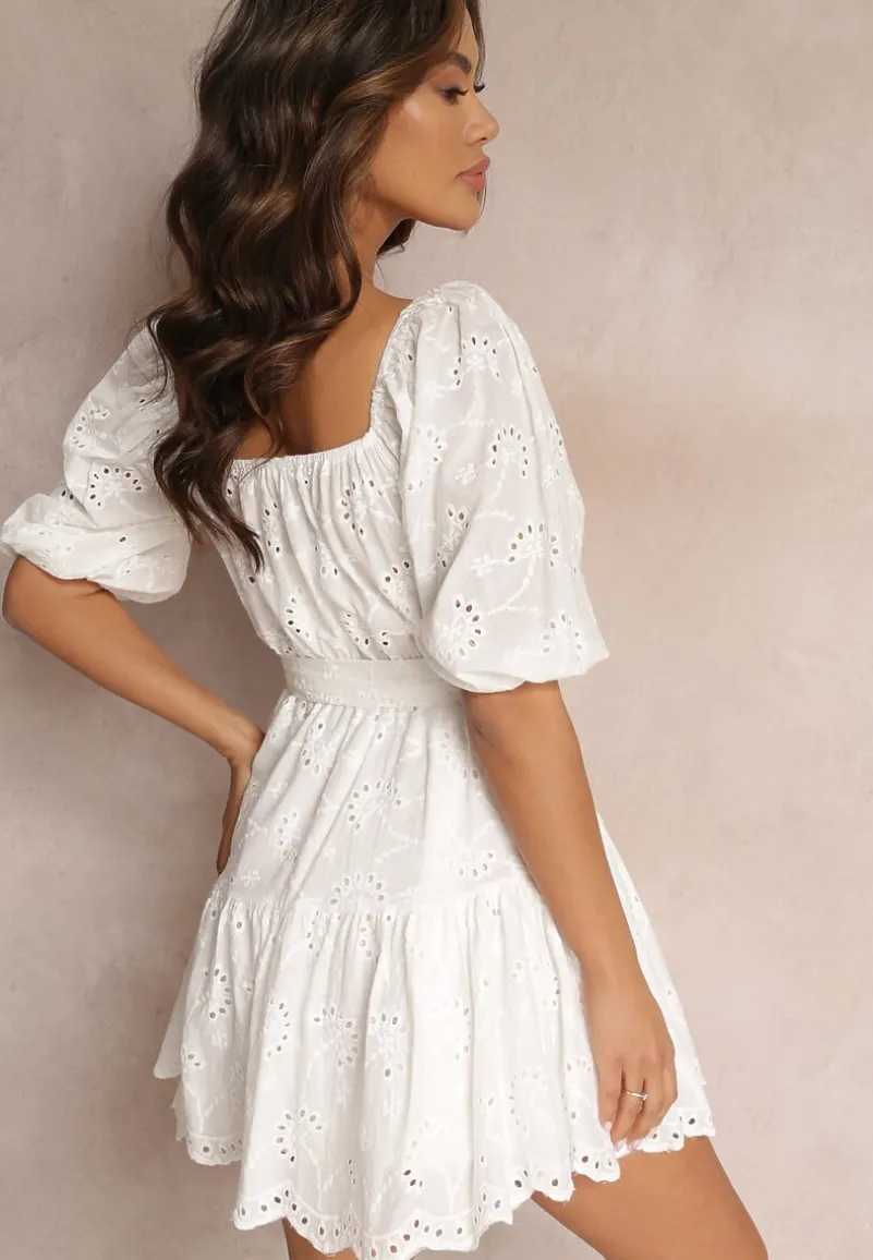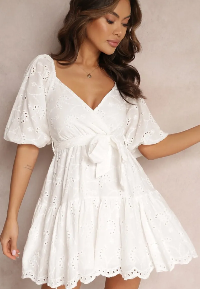 Sukienka Echopeia uszyta z bawełnianej tkaniny z haftem. Z głębokim, kopertowym dekoltem oraz bufiastymi rękawami zakończonymi gumeczkami. Ze ściągaczem w talii oraz dodatkowym paskiem z materiału. Dół rozkloszowany, o długości mini, ozdobiony przy krawędzi falbanką. Z podszewką pod spodem. To romantyczna, a jednocześnie zmysłowa sukienka, która skrada serca!
