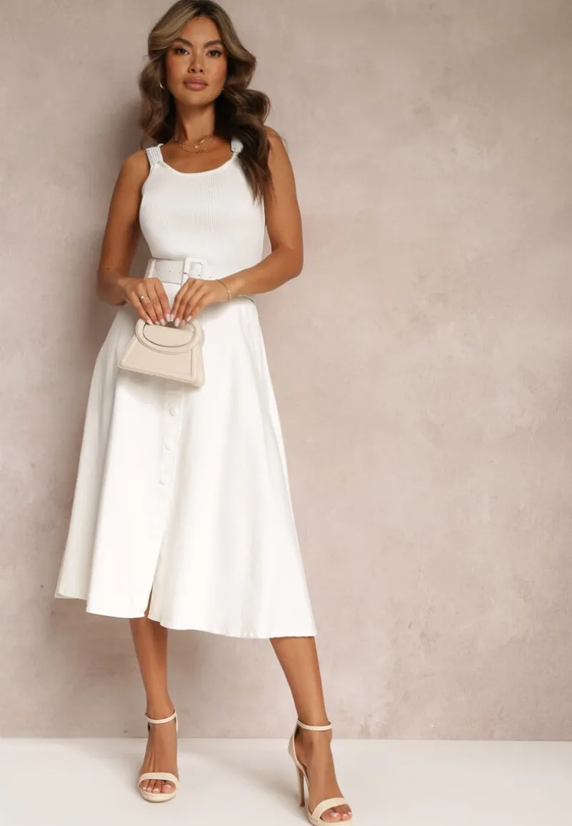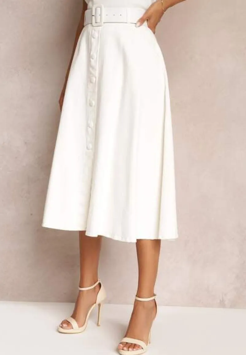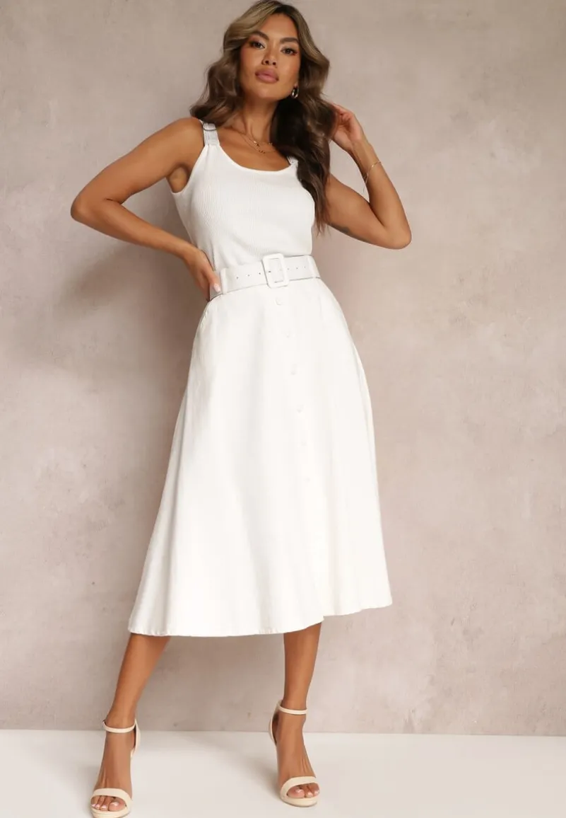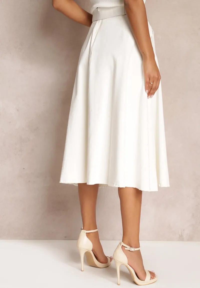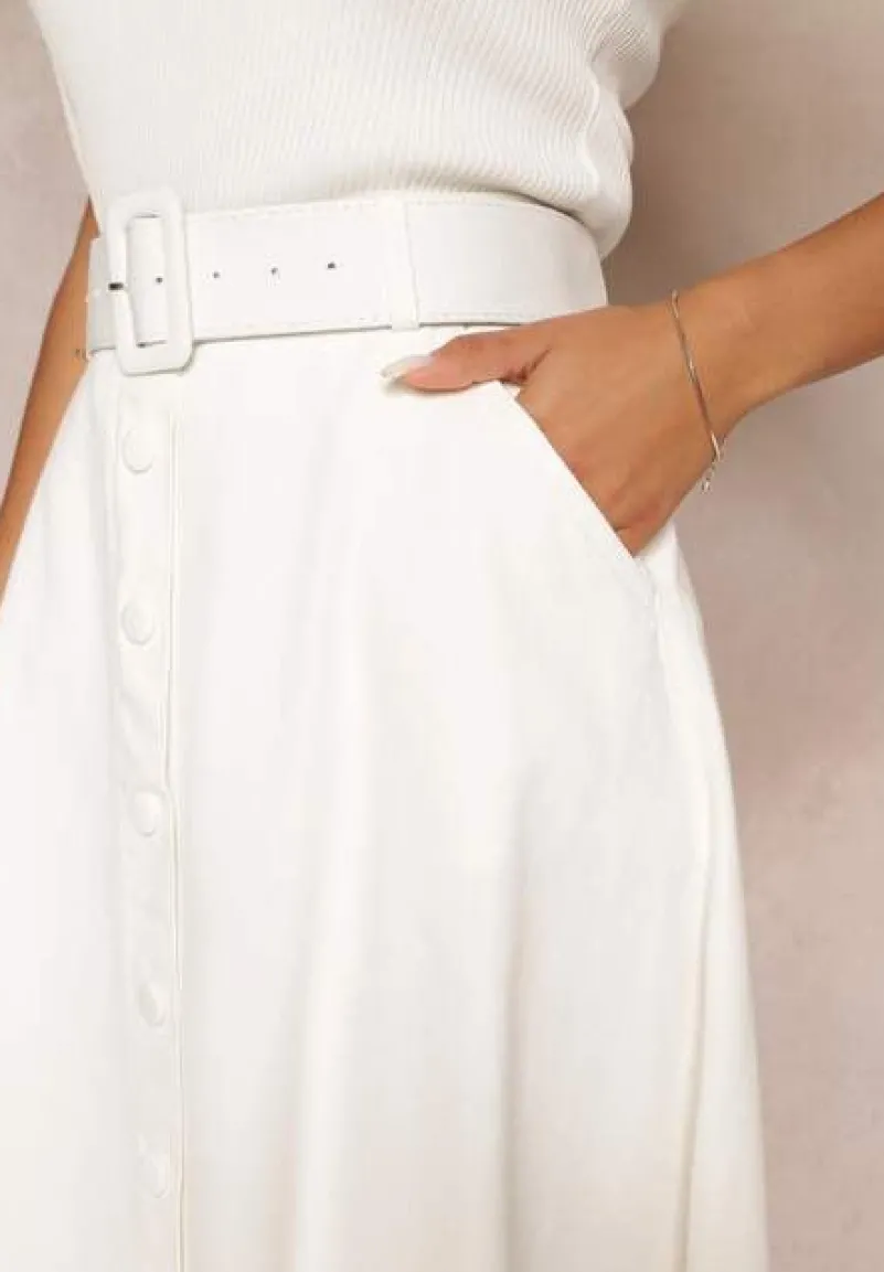 Trapezowa spódnica Marydevi z materiałowym paskiem ze sprzączką. Wykonana z bawełny i wiskozy. Suwak wszyty z tyłu. Ozdobiona guzikami i rozcięciem z przodu. Posiada wsuwane kieszenie na wysokości bioder. Model o długości midi. Świetnie sprawdzi się w codziennych outfitach.
