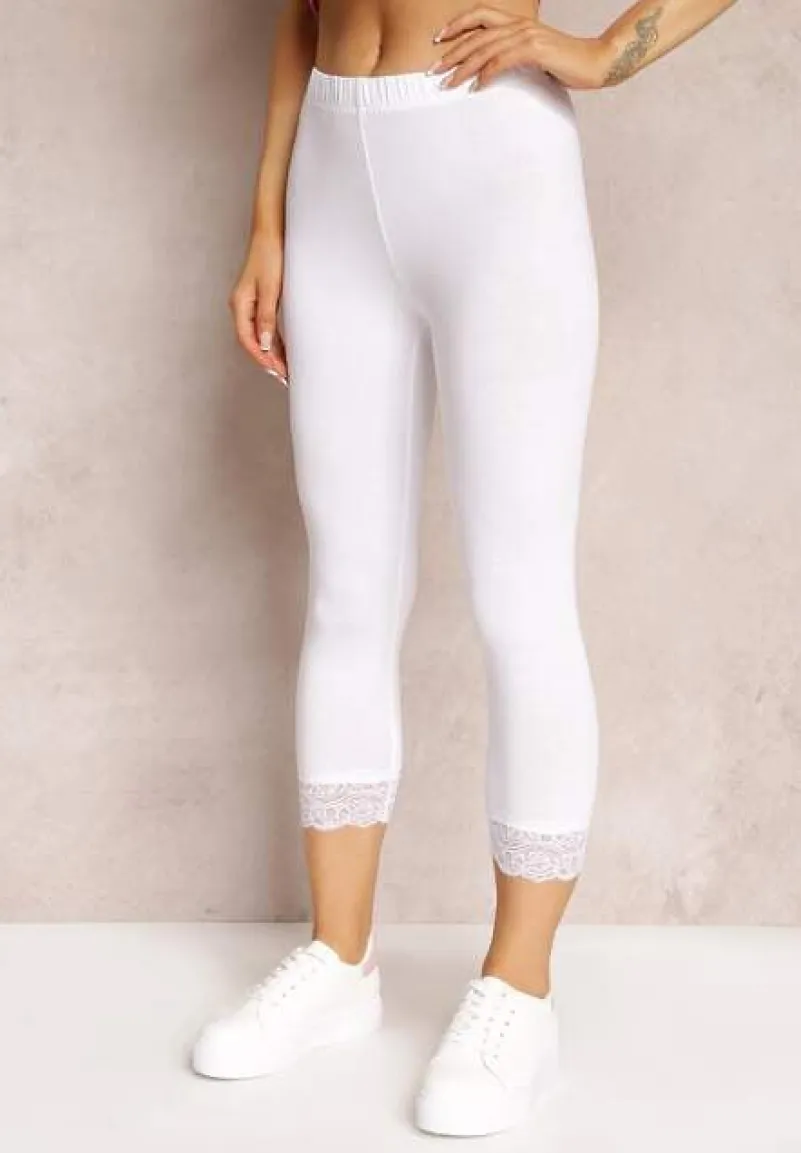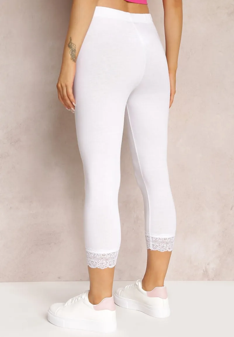 Legginsy Harine z nogawką o długości 3/4. Wykonane z miękkiej tkaniny z dużą zawartością bawełny w składzie. Zakończone wstawkami z koronką. W pasie wszyta gumka.