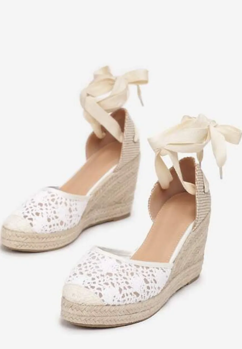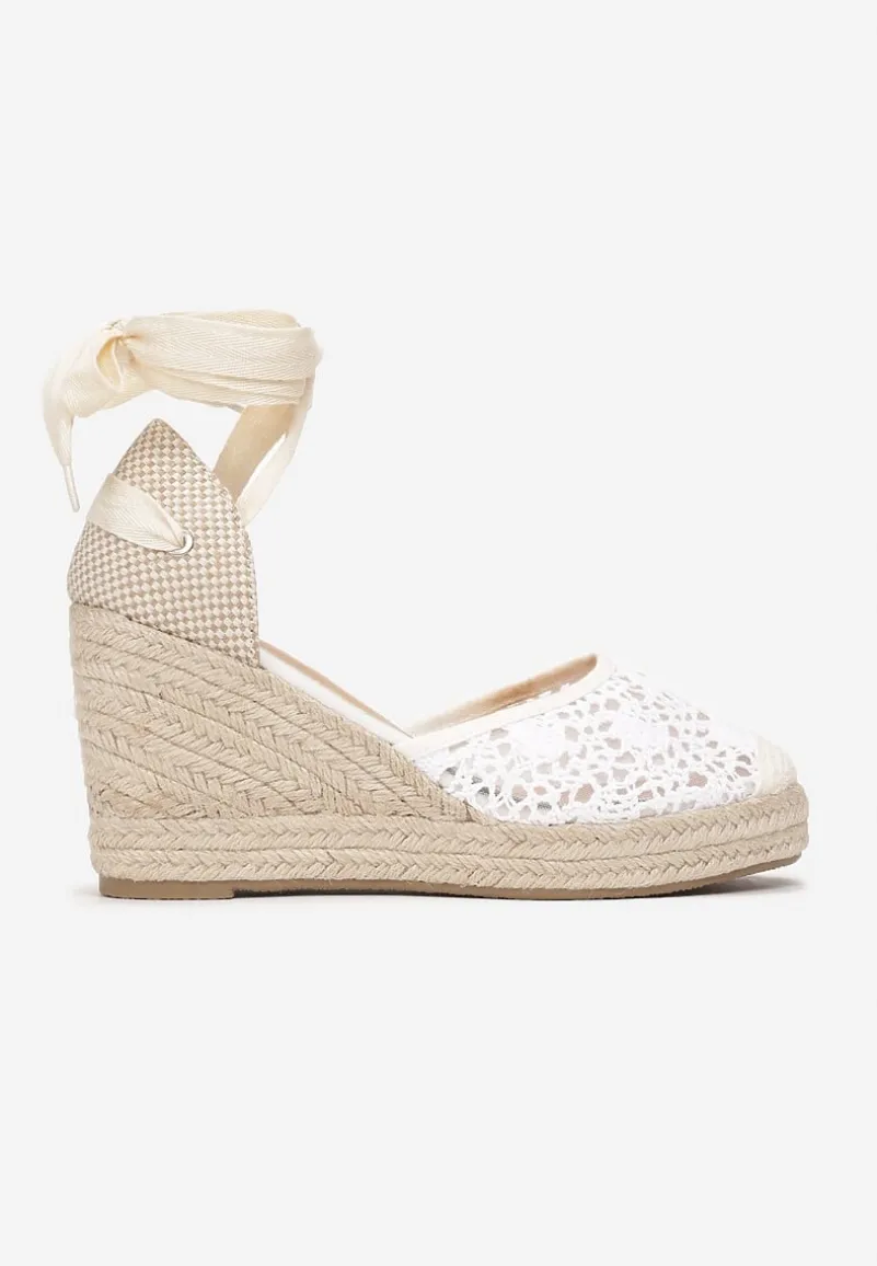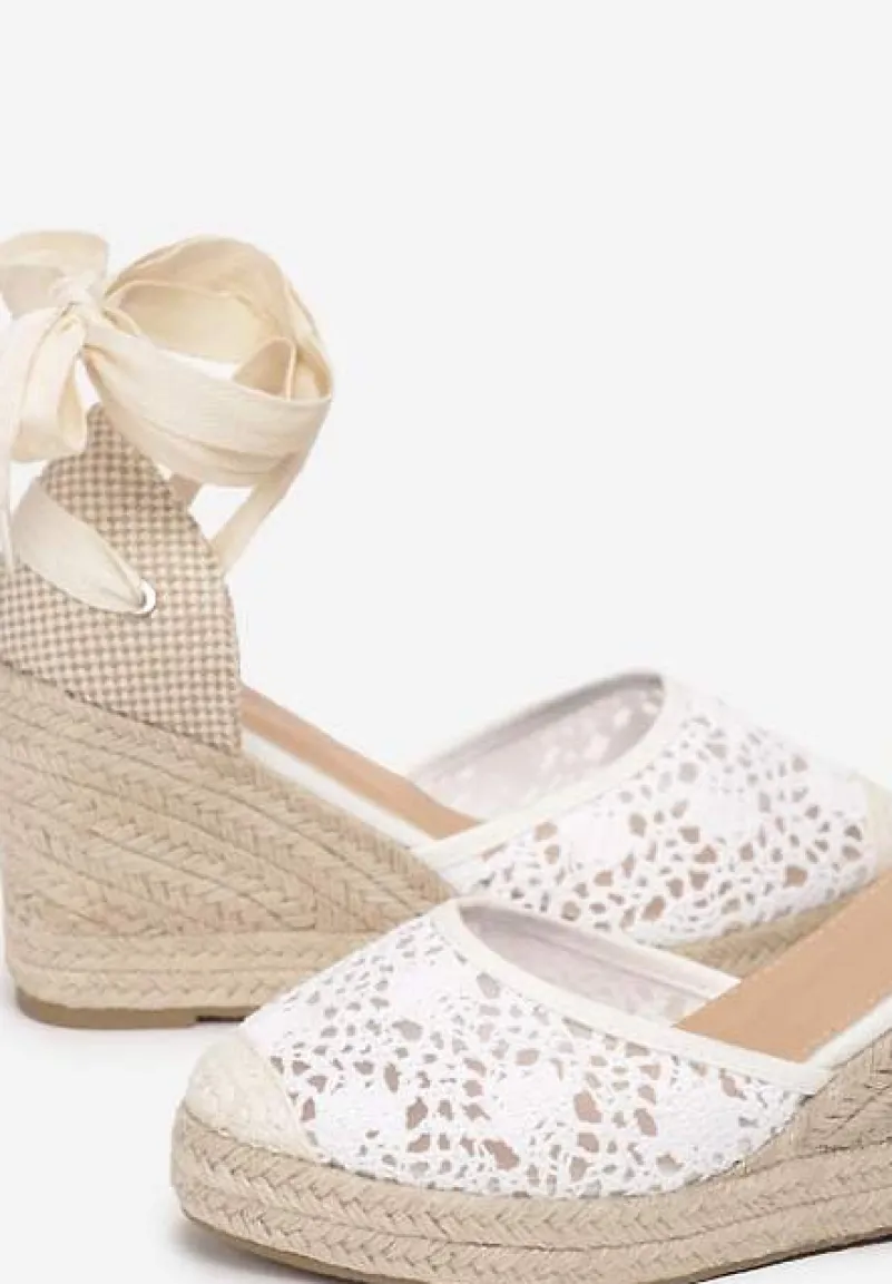 Sandały Jennileh na platformie i wysokim koturnie, które pokryte zostały warkoczykami z juty. Cholewka z przodu z koronki, ze wstawką na nosku. Pięta z delikatnym wzorem w szachownicę. Wiązane na taśmę wokół kostki. Wykonane z materiału tekstylnego. Sugerujemy wybór większego rozmiaru. Fantastycznie wyeksponują nogi, dlatego wyglądają obłędnie z krótkimi szortami i spódnicami! Dobierz do nich koronkowy top dla maksymalnej spójności!