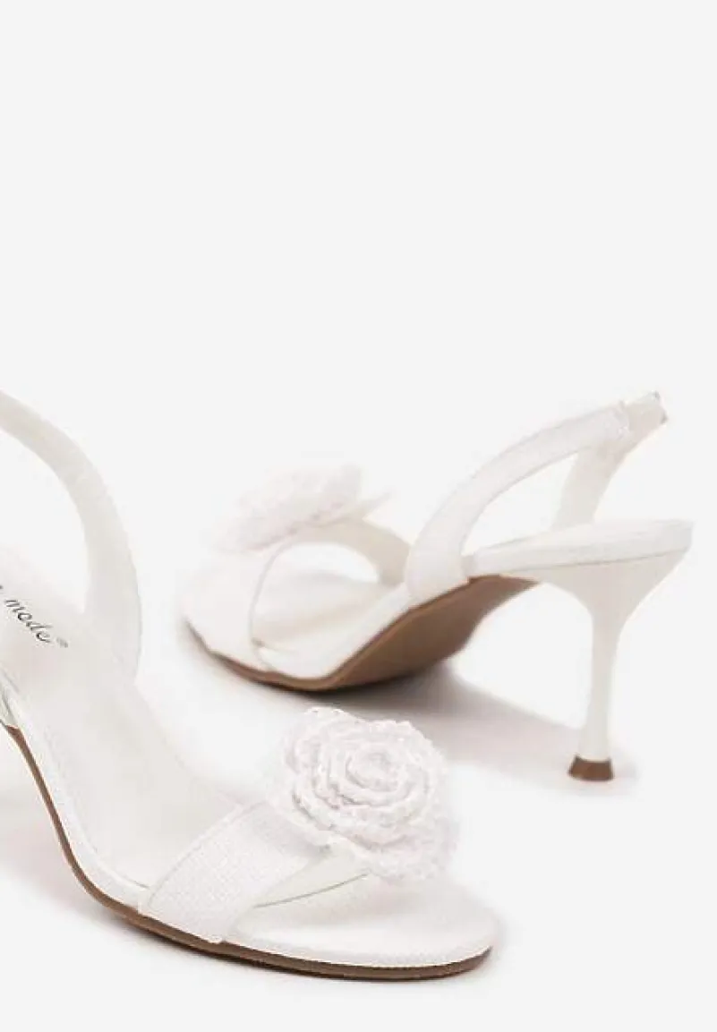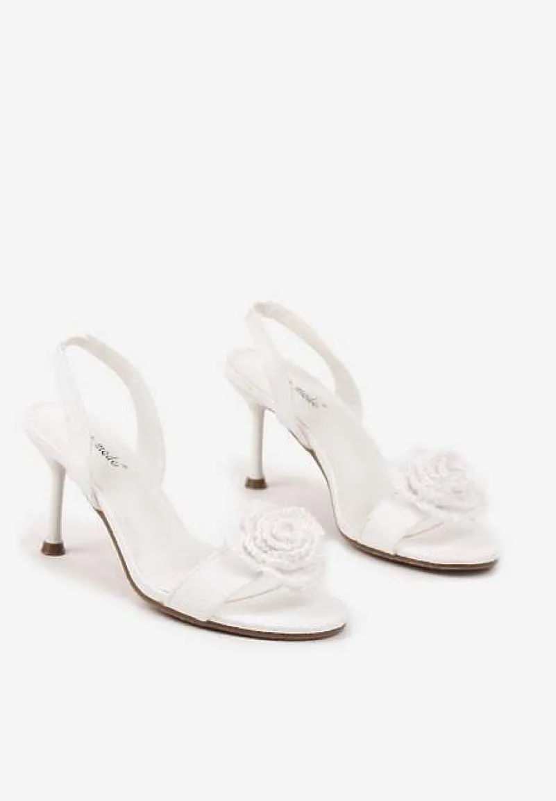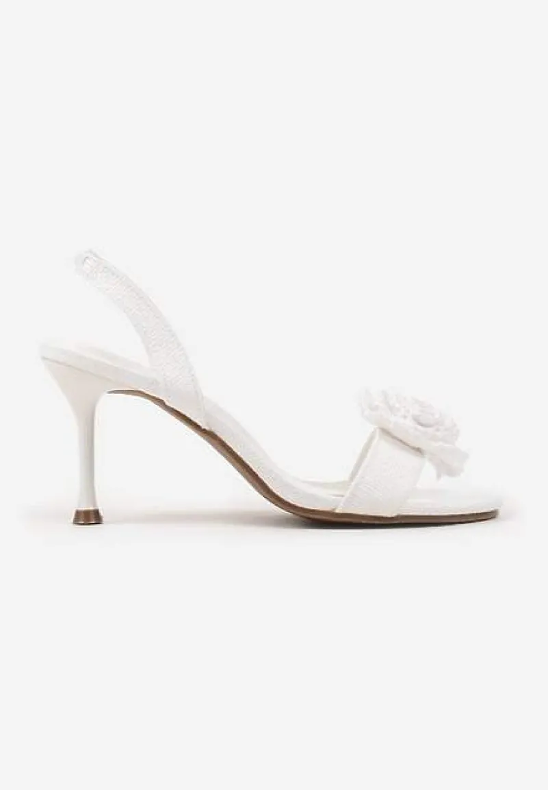 Białe Sandały na Obcasie z Kwiatkiem w Szydełkowym Stylu Calfitis