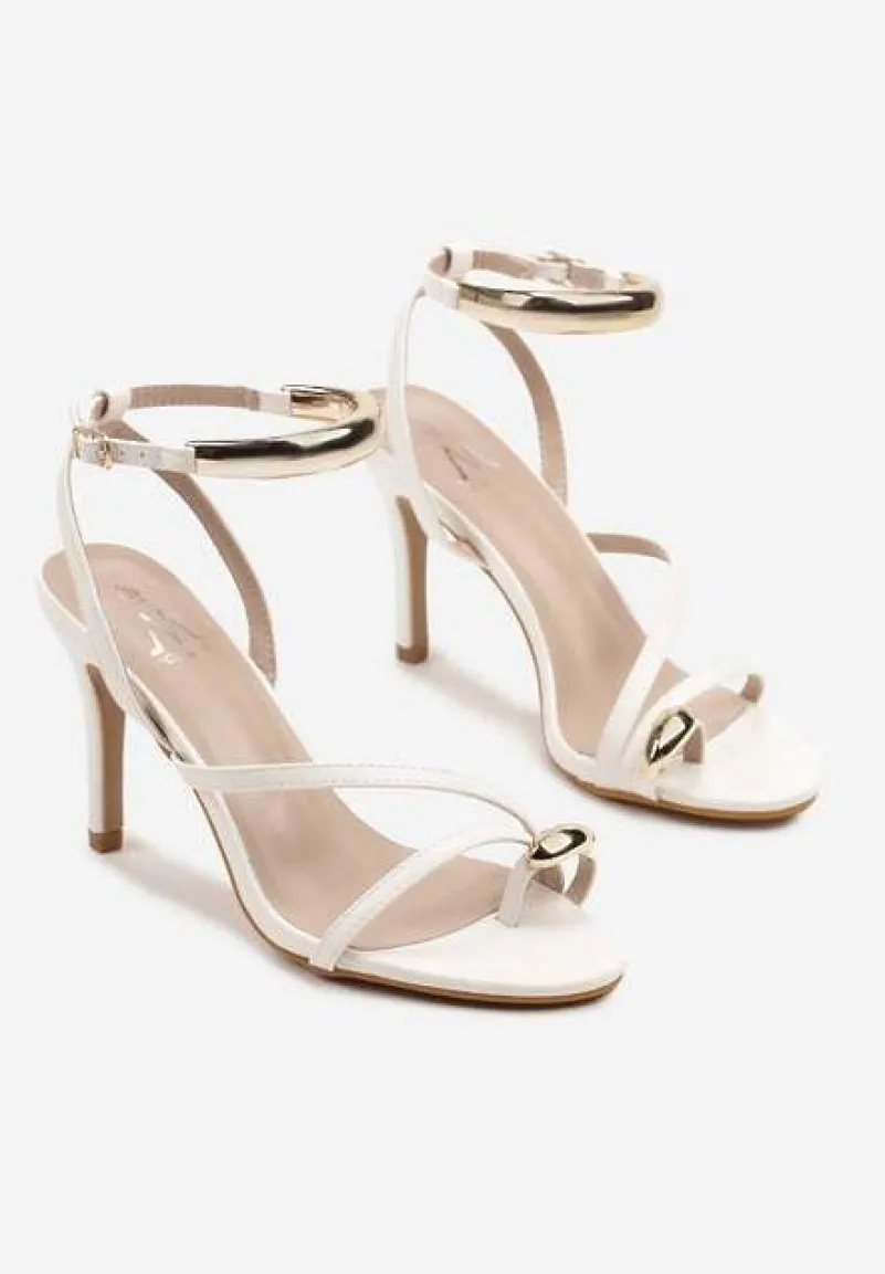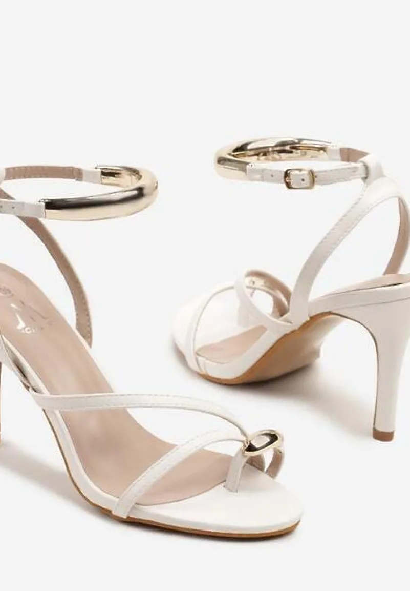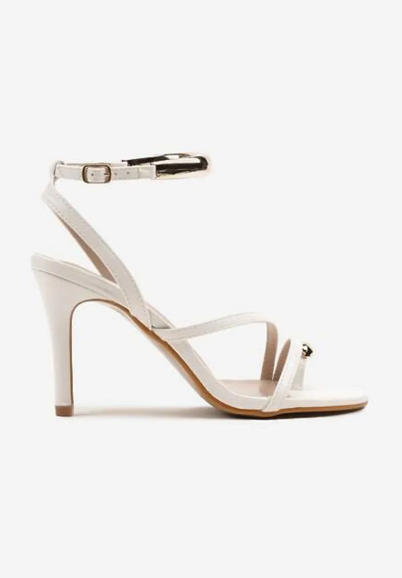 Białe Sandały na Szpilce Japonki Ozdobione Metalicznymi Aplikacjami Talimi